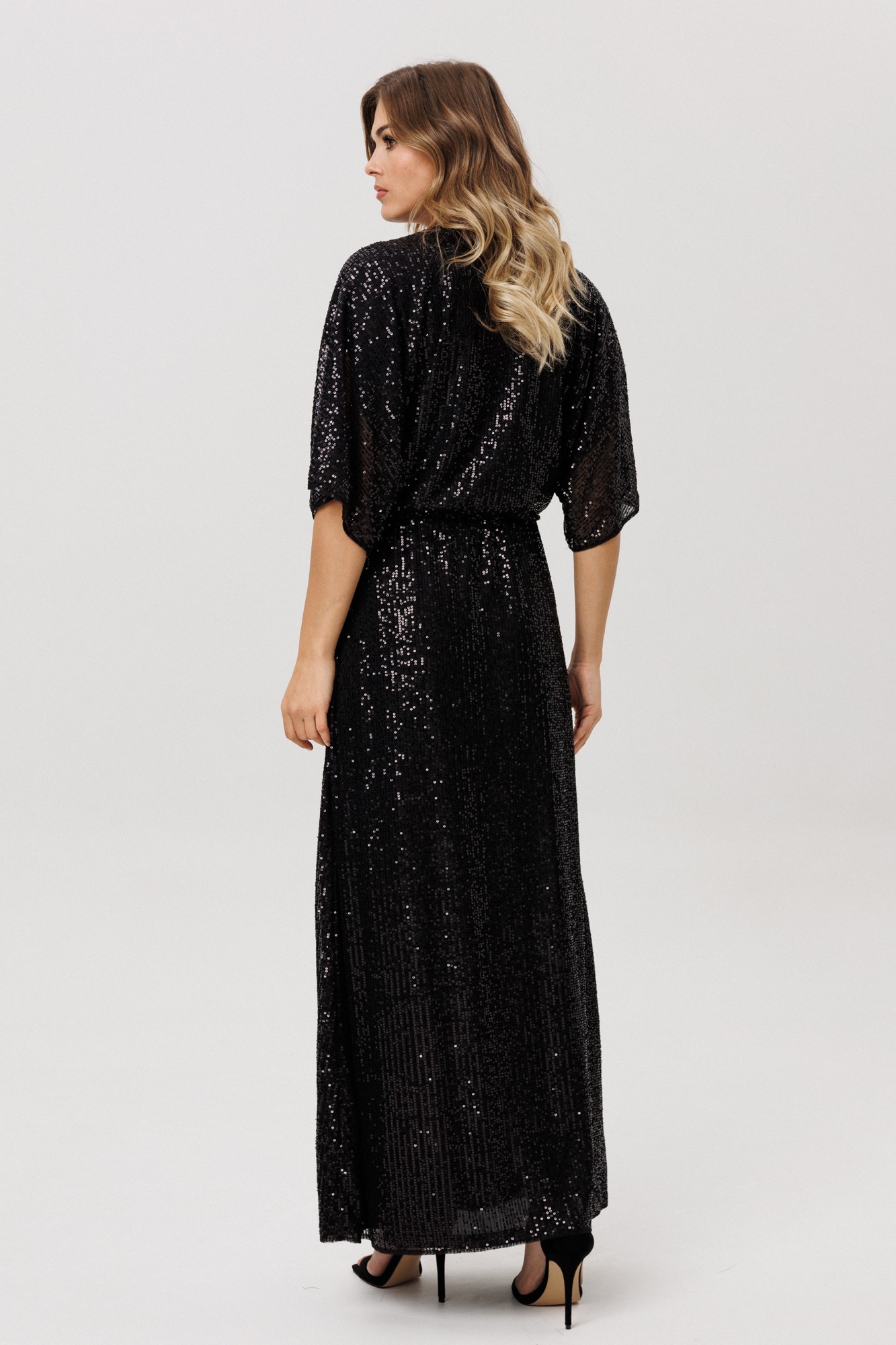 Платье выполнено из трикотажного полотна в пайетки. Платье X-образного силуэта, длиной миди, отрезное по линии талии. Лиф покроя кимоно. Перед выполнен на запах. Горловина V-образной формы. Переднее и заднее полотнище цельные и расширенные к низу. По линии талии эластичная тесьма. Платье на отлетной по низу трикотажной подкладке.