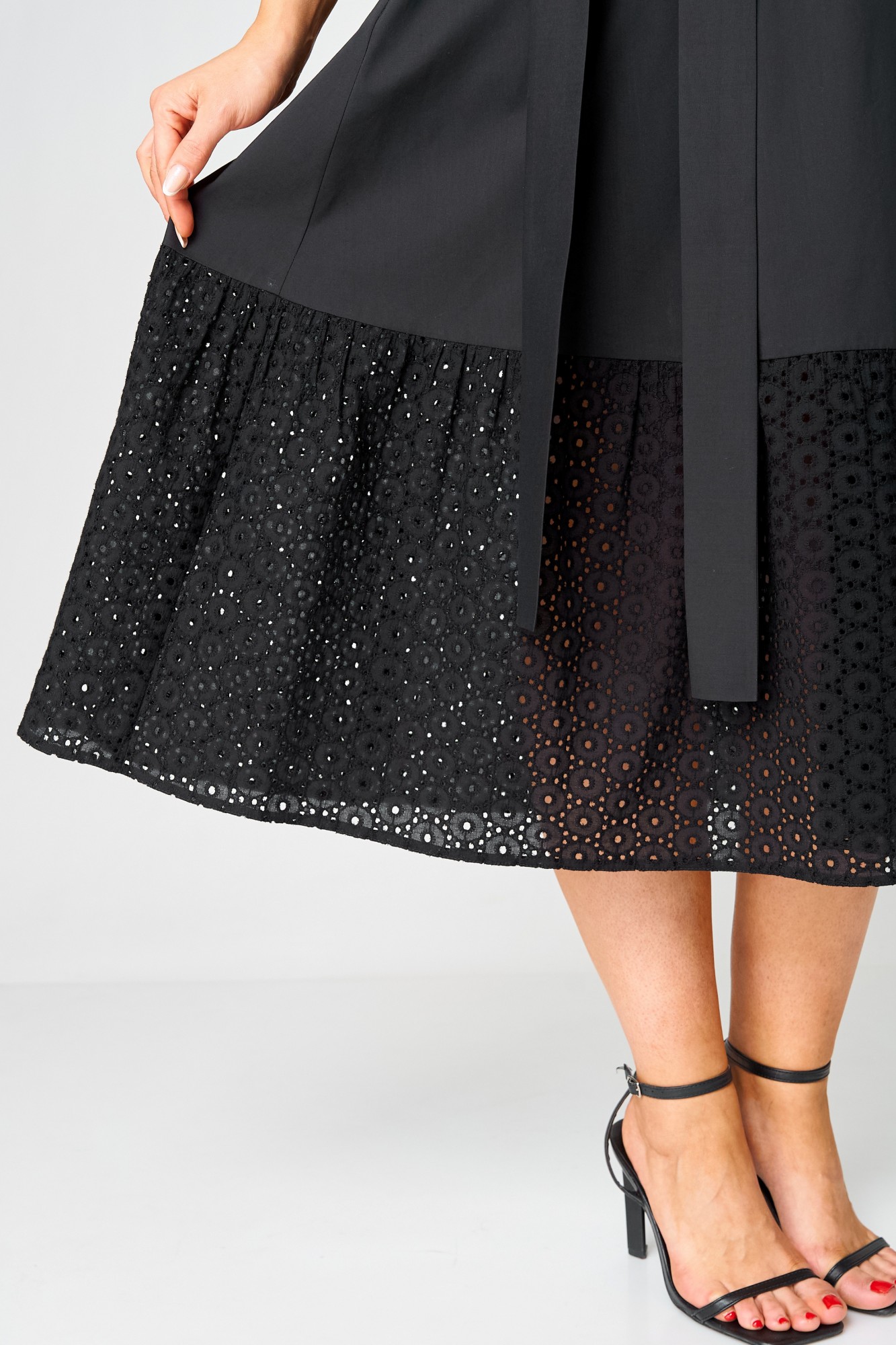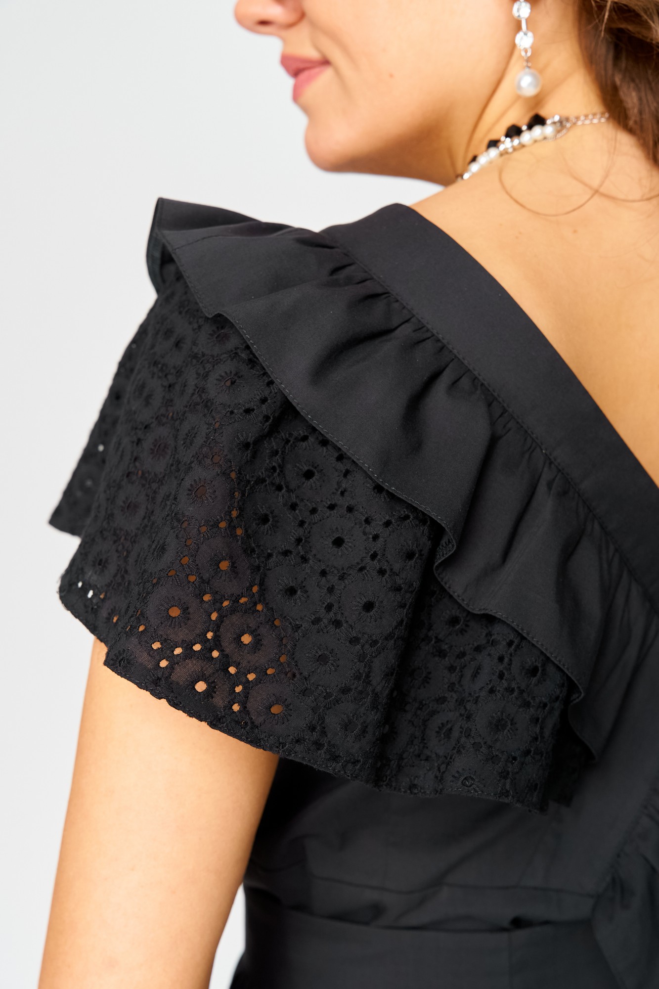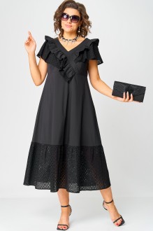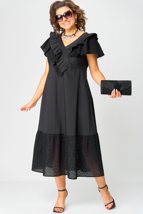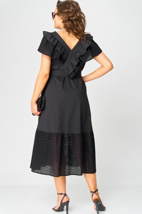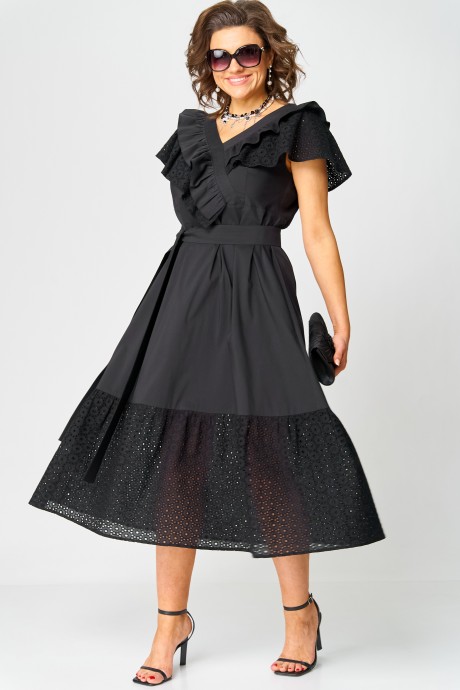 Платье женское нарядно-повседневное полуприлегающего силуэта до талии и расширенное к низу. Платье отрезное по линии талии, вырез горловины V-образный с ассиметричными рюшами из тканей двух дизайнов. Проймы обработаны обтачками. В боковых швах обработаны карманы, по низу притачной волан из отделочной ткани(шитье). декором служит пояс из основной ткани.