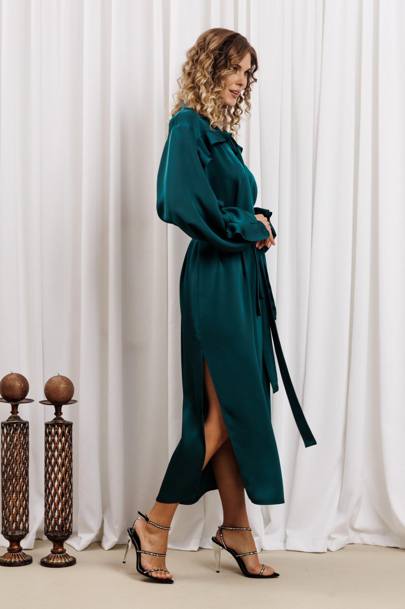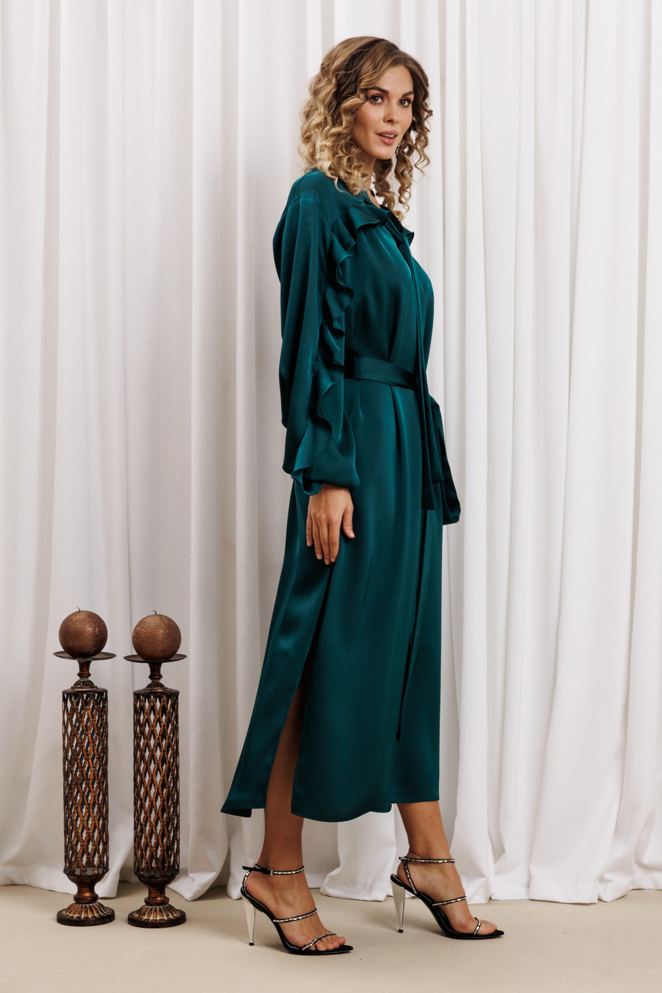 Платье свободного силуэта из струящейся атласной ткани. Перед и спинка с кокеткой и сборкой. Рукав спущенный свободный с резинкой понизу. Вдоль линии кокетки и рукава вставлена рюша. Горловина V-образной формы с воротником стойкой переходящей в бант. В боковом шве разрез. К платью прилагается пояс из основной ткани.