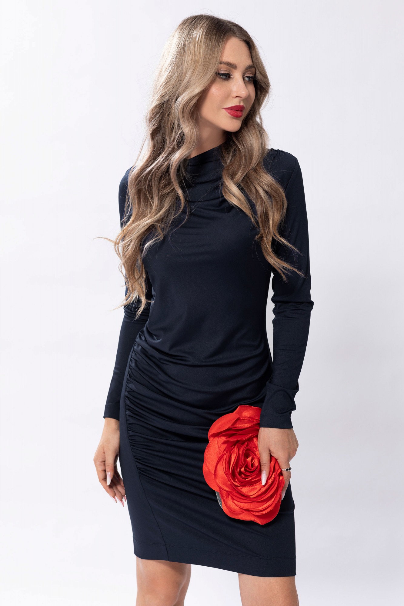 Платье с застежкой на потайную молнию в среднем шве спинки, без воротника, с асимметричным вырезом горловины. По переду асимметричный рельеф со сборкой по центральной части платья. Спинка со средним швом, заканчивающимся разрезом, талиевыми вытачками. Правый плечевой шов со сборкой. Рукав втачной, длинный.