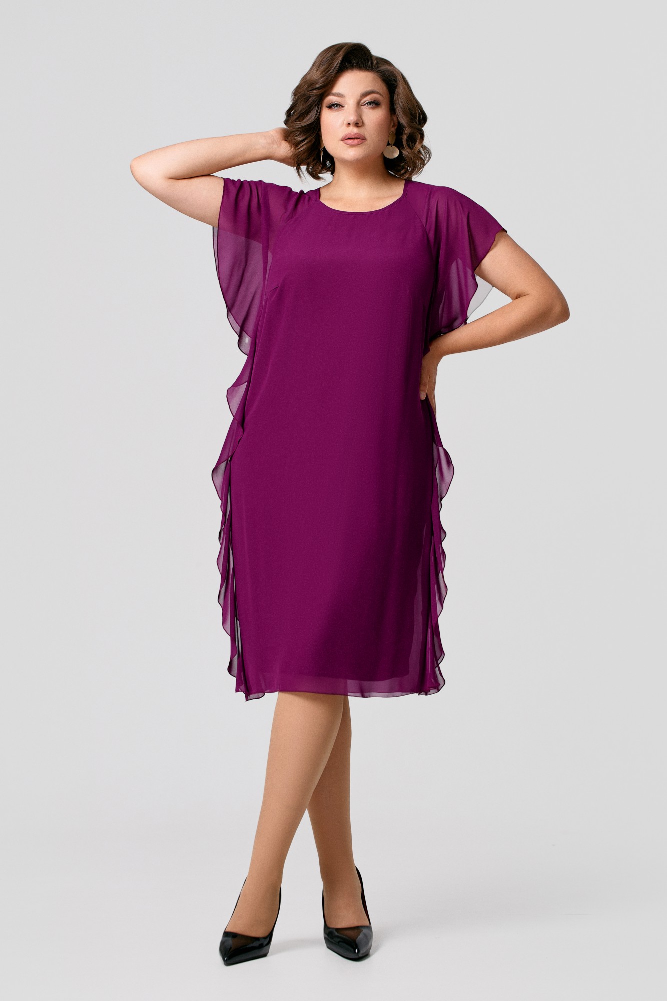 Платье женское прямого силуэта из легкой шифоновой ткани на подкладке из трикотажного полотна с антистатическим эффектом; рукава реглан, переходящие в декоративные воланы по переду и спинке.Рекомендована стирка при t не выше 30 С, глажение при t прессующей поверхности не выше 110 С.