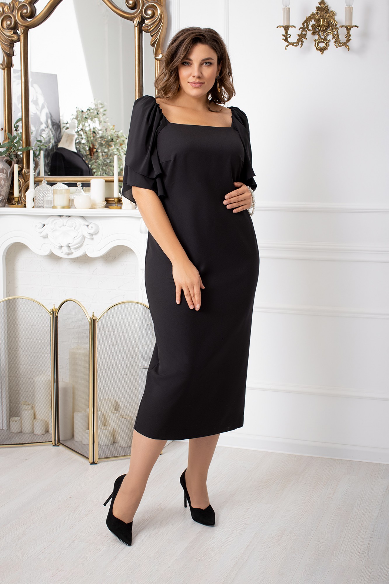 Платье прилегающее, длиной до середины икры. Спинка с талиевыми вытачками и средним швом, в котором обработана застежка на потайную тесьму-«молнию» и разрез. Перед платья с нагрудными и талиевыми вытачками. Горловина квадратной формы. Рукава двойные, одношовные, втачные, длиной выше локтя, с неровной линией низа. По окату рукава заложена сборка. В области проймы переда и спинки вставлена резинка.