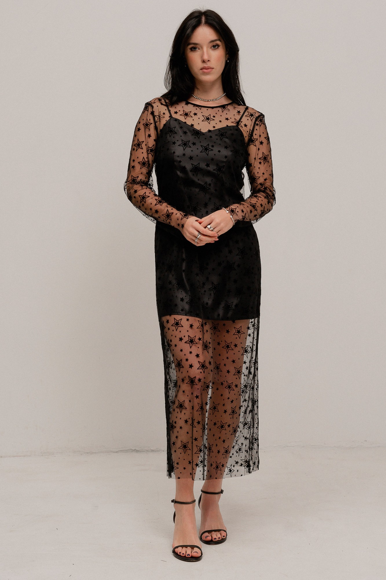 Платье молодежное из сетки с рисунком, полуприлегающего силуэта с рукавом без застежки.