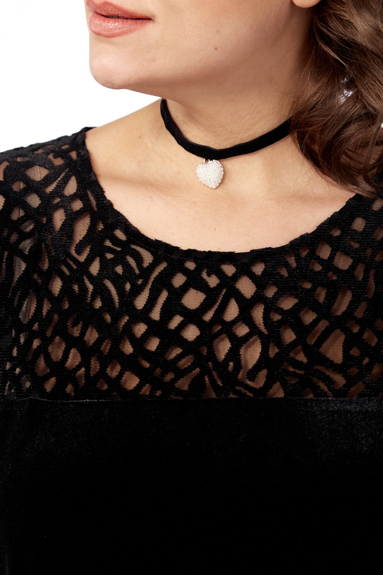 Платье женское, нарядное, свободного силуэта, выполнено из бархата и ажурной сетки. Перед и спинка с кокеткой. Горловина овальной формы. Рукава спущенные