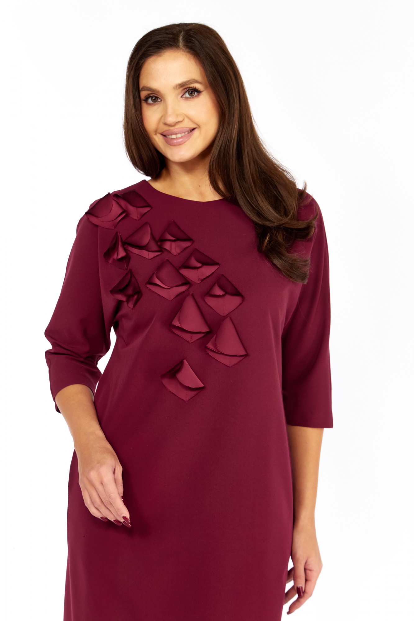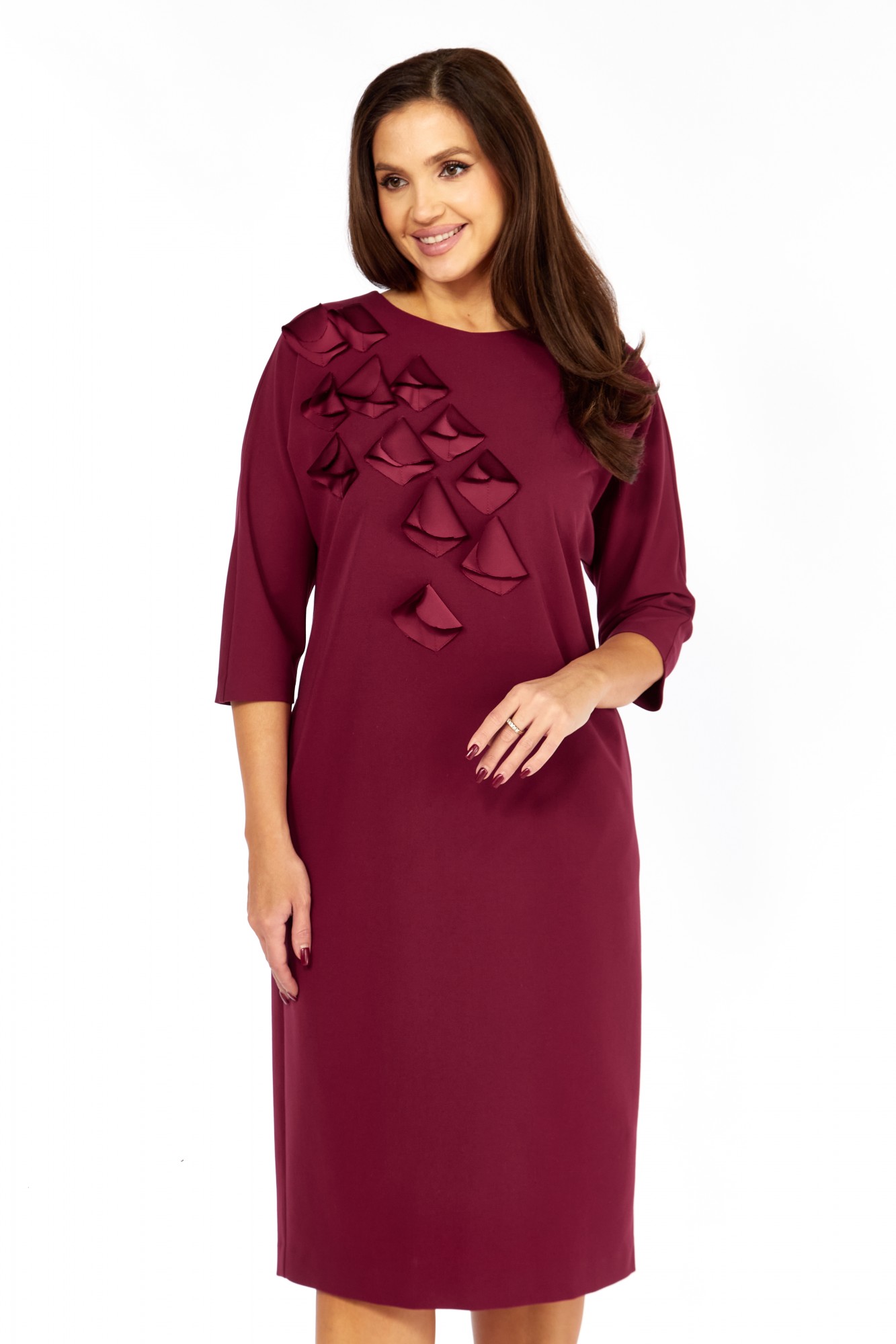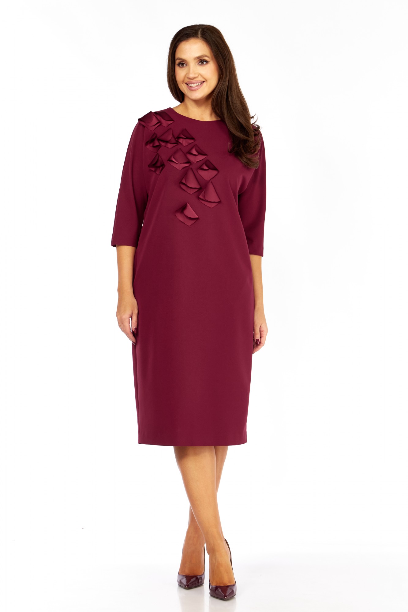 Платье выполнено из высококачественного гладкого трикотажного полотна с декоративной аппликацией из сатина в тон основной ткани. Силуэт прямой, к низу слегка зауженно; линия плеча спущена. Горловина овальная, обработана декоративной бейкой. По переду настроена аппликация в виде лепестков. Карманы в боковых швах. Рукав длиной 3/4, прямой , низ обработан бейкой. Спинка со средним швом. Платье без застёжки, без подкладки.