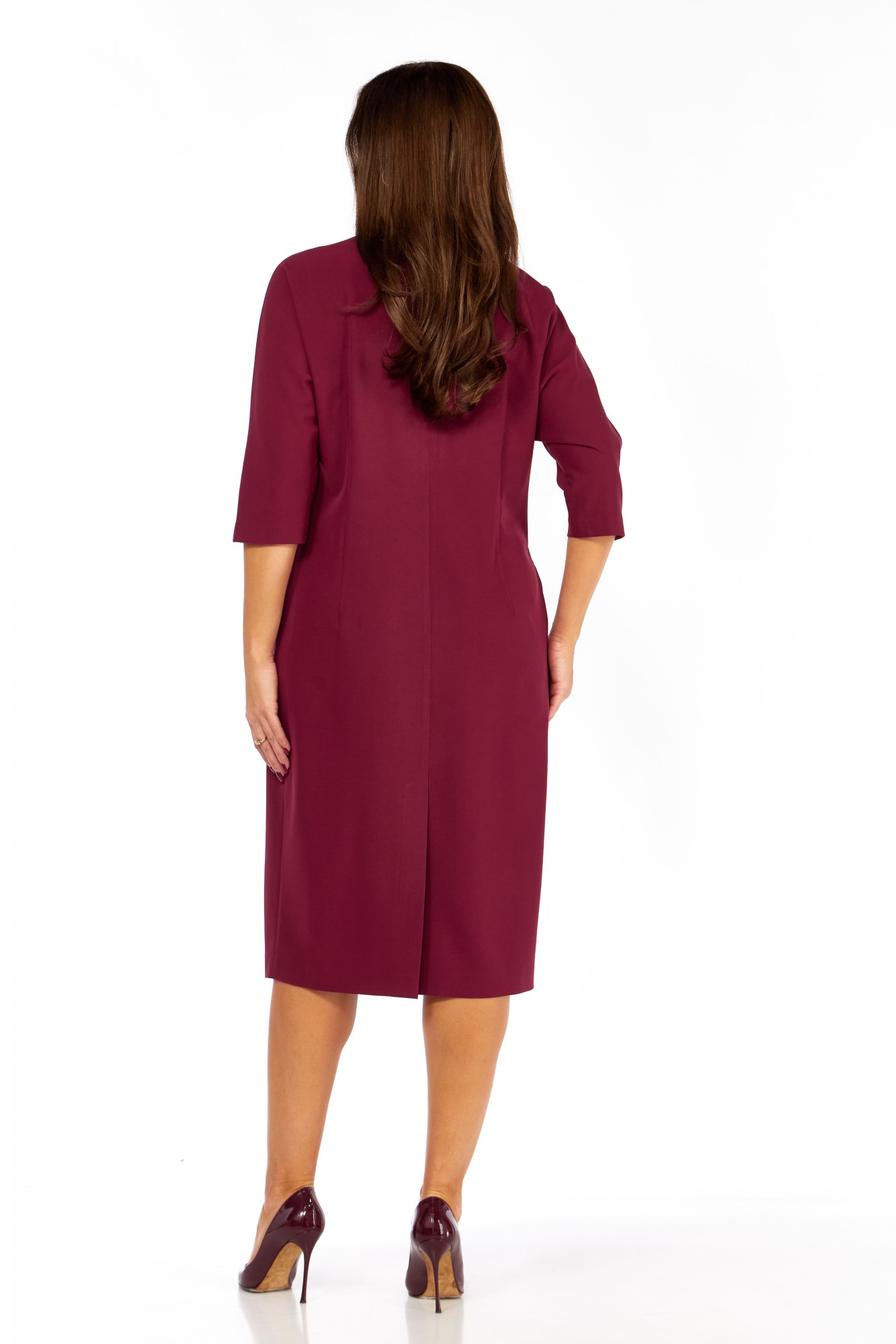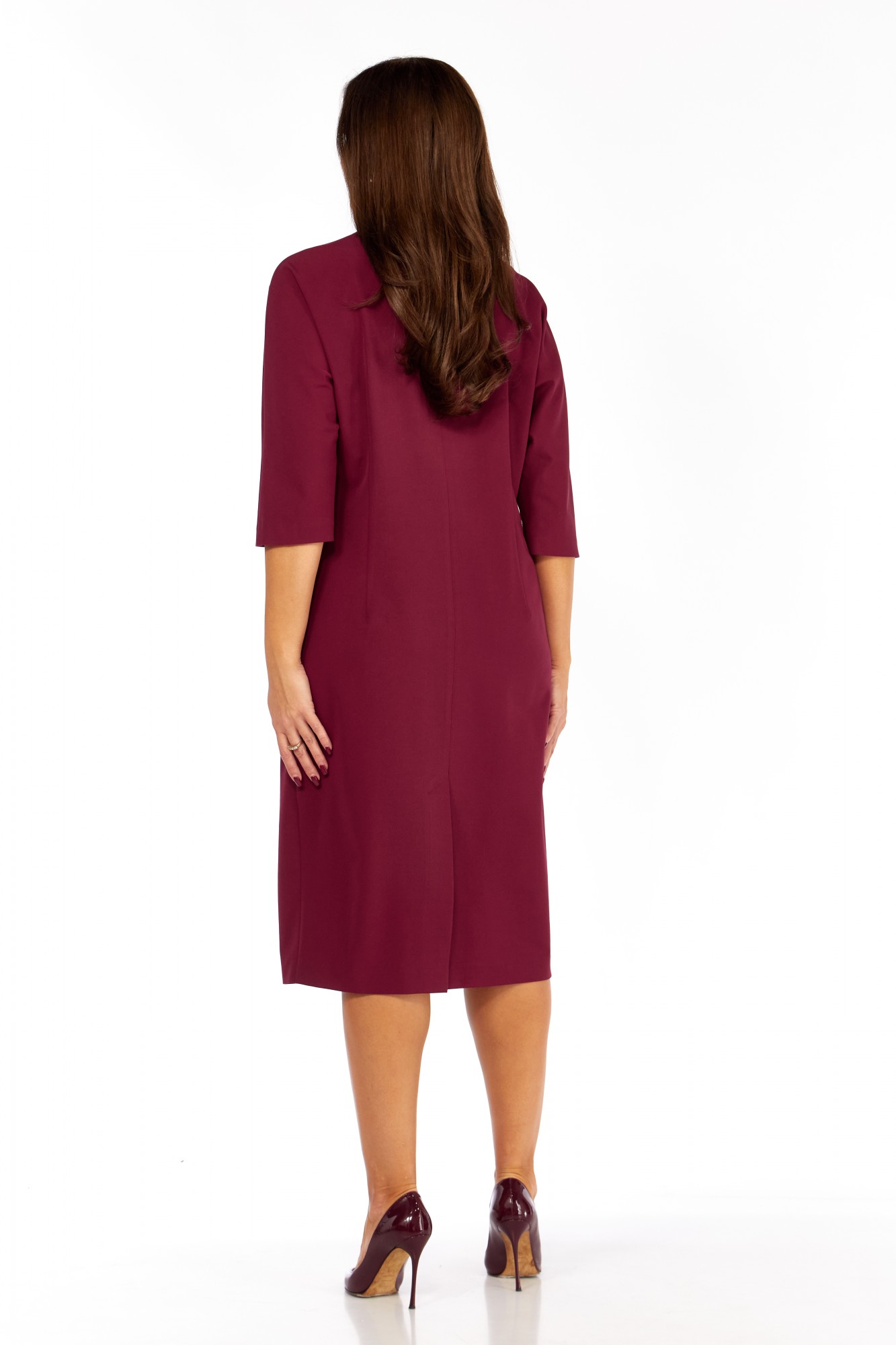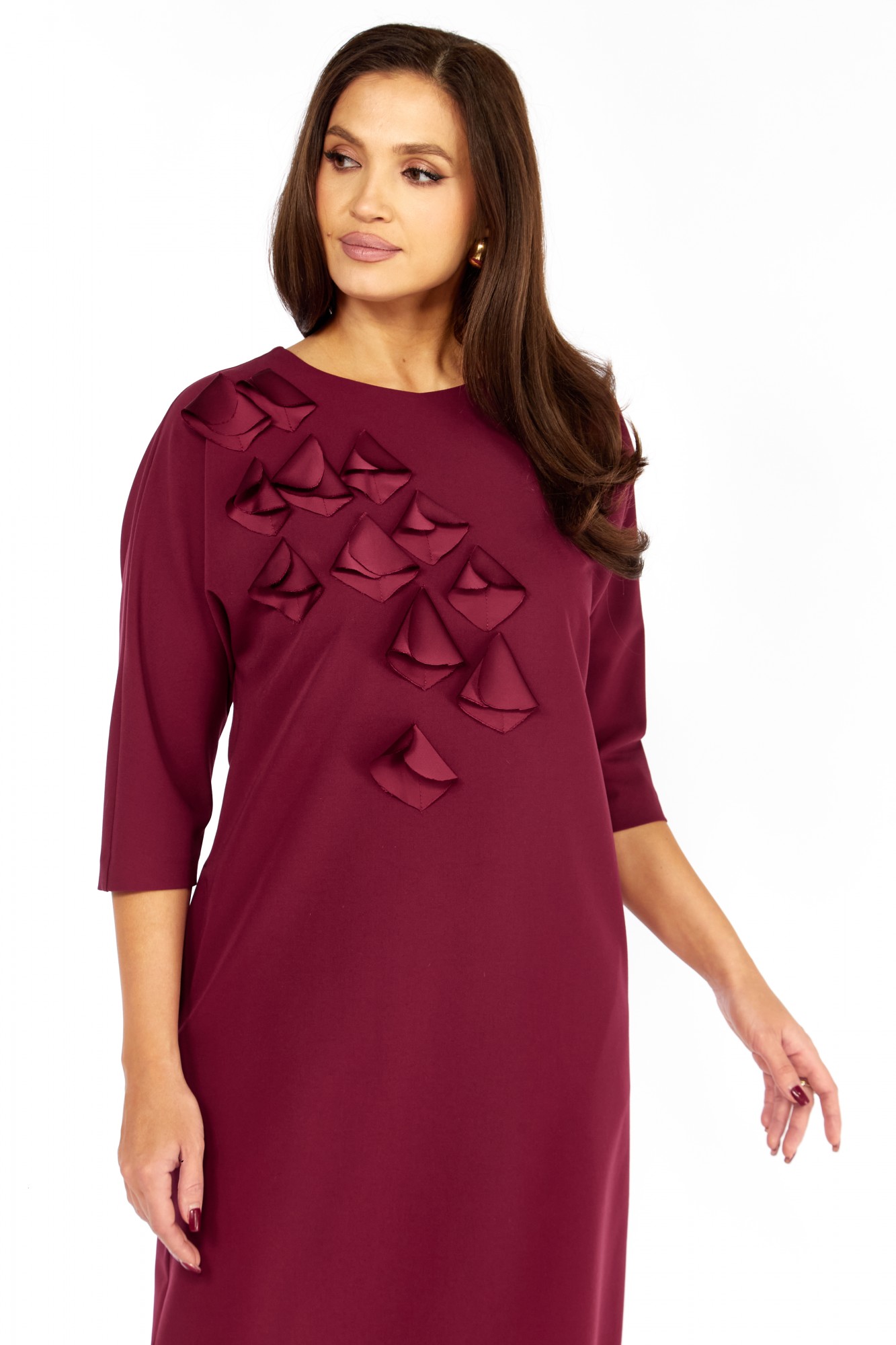 Платье выполнено из высококачественного гладкого трикотажного полотна с декоративной аппликацией из сатина в тон основной ткани. Силуэт прямой, к низу слегка зауженно; линия плеча спущена. Горловина овальная, обработана декоративной бейкой. По переду настроена аппликация в виде лепестков. Карманы в боковых швах. Рукав длиной 3/4, прямой , низ обработан бейкой. Спинка со средним швом. Платье без застёжки, без подкладки.
