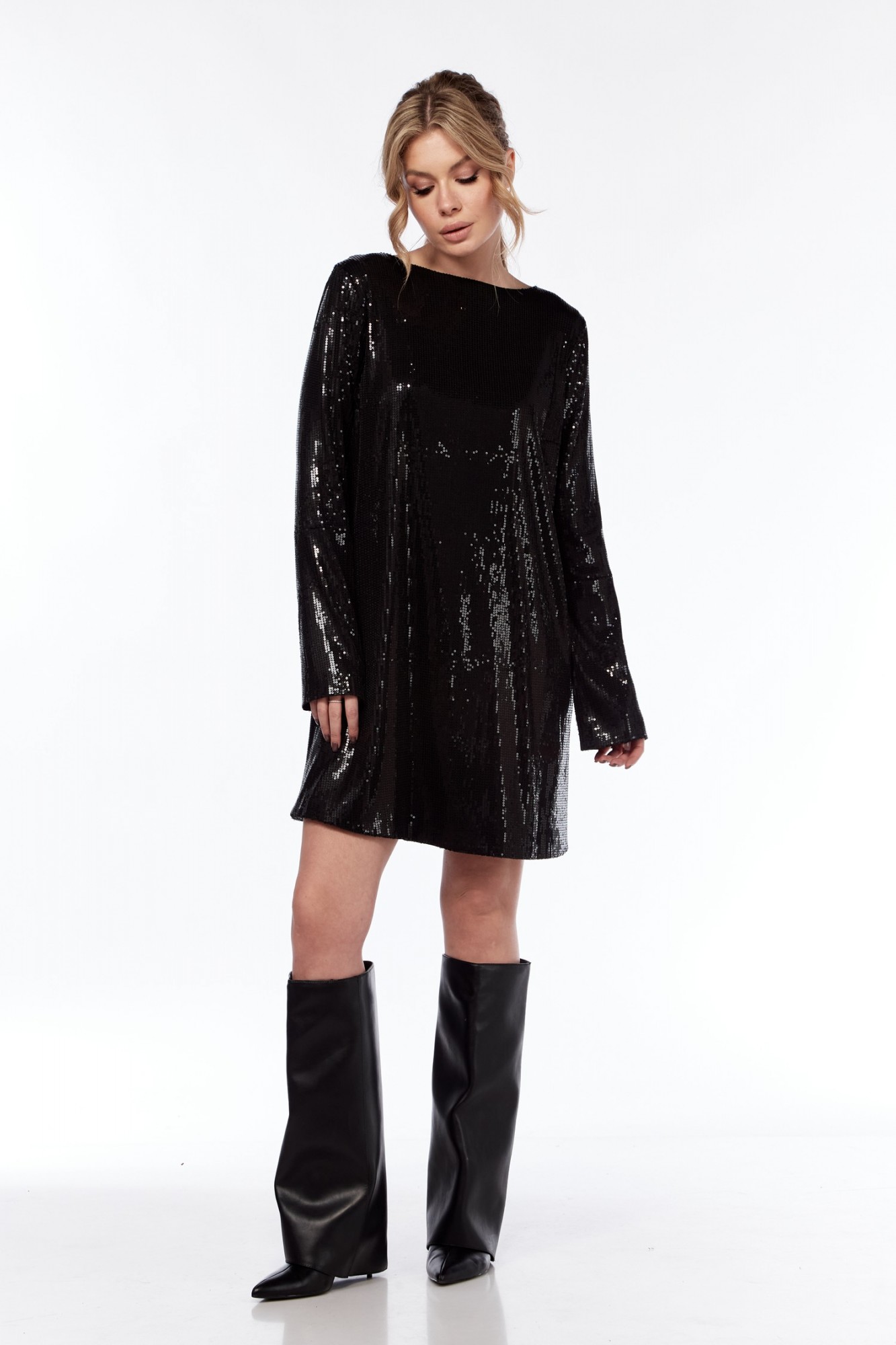 Женское нарядное платье из ткани в пайетки. Платье А-образного силуэта, длиной мини. Горловина округлая. Рукав втачной одношовный. Платье на подкладке.