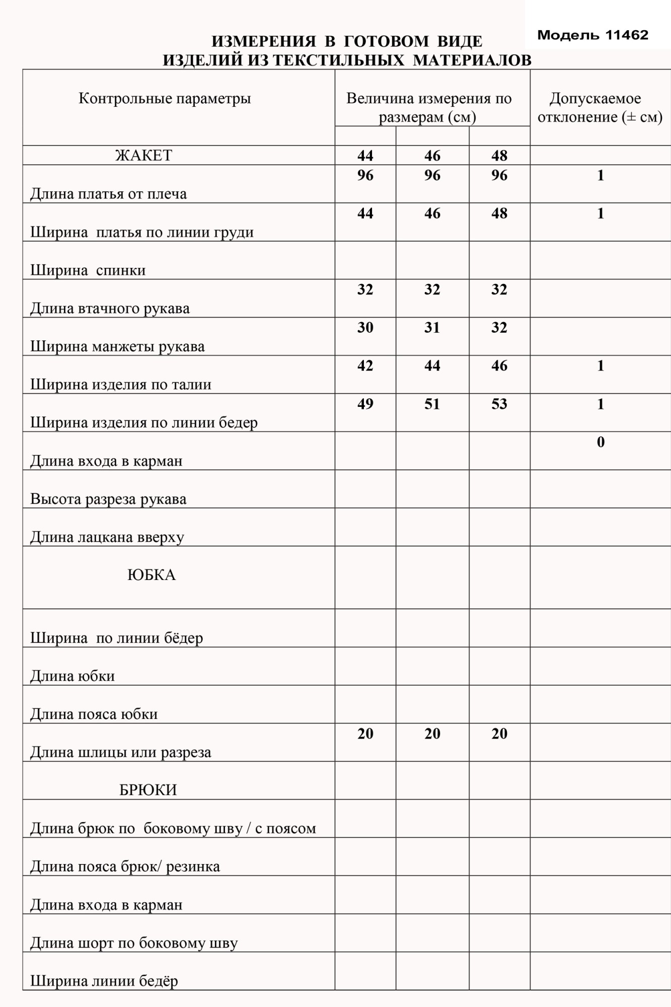 Таблица размеров