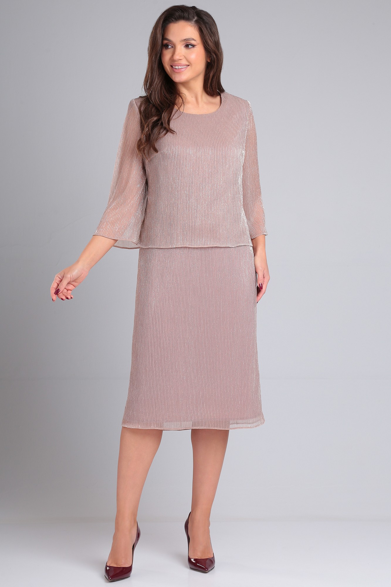 Платье на трикотажной подкладке, двухъярусное с отлетным лифом. Вырез горловины круглый. Без застежки. Рукав втачной одношовный расширенный к низу длиной ниже локтя. Платье полуприлегающего силуэта, длиной ниже колена. Блестящая, переливающаяся ткань этого платья просто покорит Вас и Вы неизменно будете притягивать к себе взгляды
