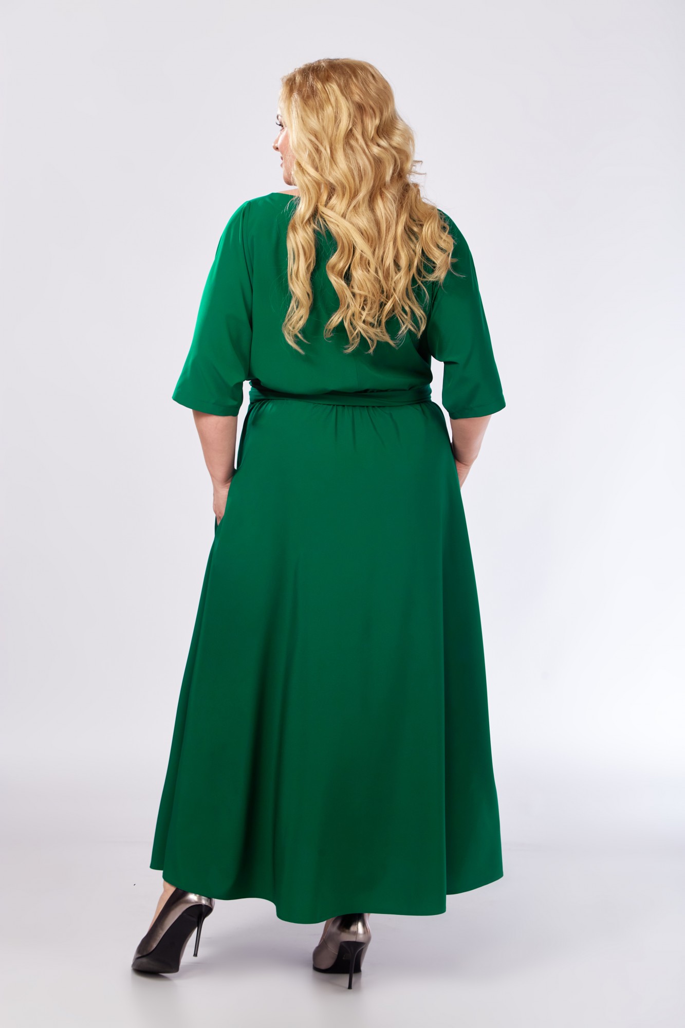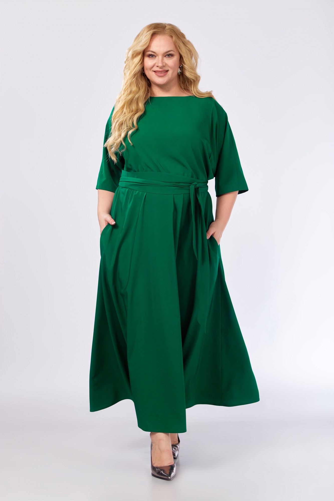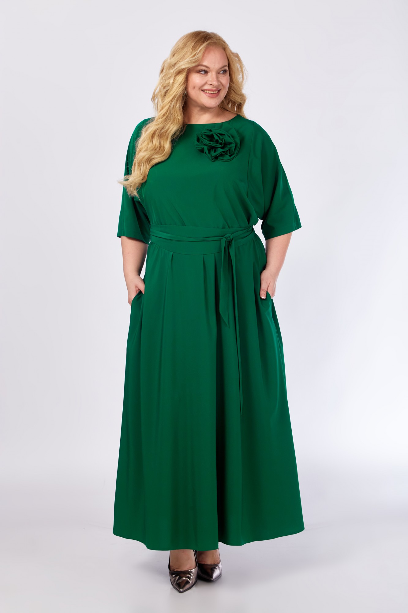 Приятное к телу женское вечернее платье из легкой плательной ткани без подкладки. Женственное и элегантное, оно украсит Вас по случаю любого праздничного торжества. Изделие красиво драпируется, не электризуется. Платье отрезное по талии, которая собрана на резинку для идеальной посадки практически на любую фигуру. Вырез горловины - лодочка - имеет достаточную свободу и застегивается на петлю и пуговицу по спинке. Рукава длиной 3/4. В боковых швах обработаны карманы. Низ - четверть солнца длины макси (в пол). В комплекте с платьем идет съемный цветок, а также нарядный широкий пояс-кушак, которым можно подчеркнуть изящный силуэт и прикрыть животик. Элегантное платье обязательно должно быть в гардеробе современной женщины! Создавайте с ним романтичные образы на мероприятия по случаю любых праздников!