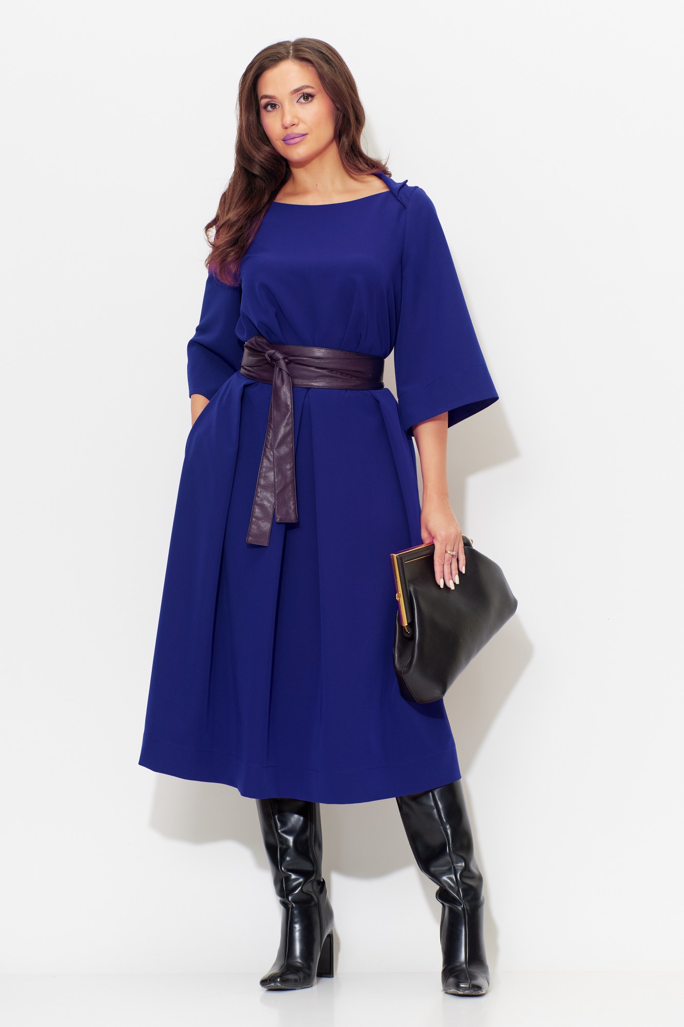 Шикарное женское платье идеально на любую погоду: под босоножки либо под сапоги и пальто. Отличный вариант универсального изделия: подойдет как для повседневного и офисного гардероба, так и для праздничного выхода. Отрезное по линии талии. По полочке объем груди создается за счет направленных складок из подреза. Объем юбки создается за счет центральной встречной и 2-х односторонних складок. По бокам в юбке- карманы. Рукав втачной, 3/4 длинны с отворотом. Вырез горловины лодочка с отложным воротником. В комплекте съемный пояс.