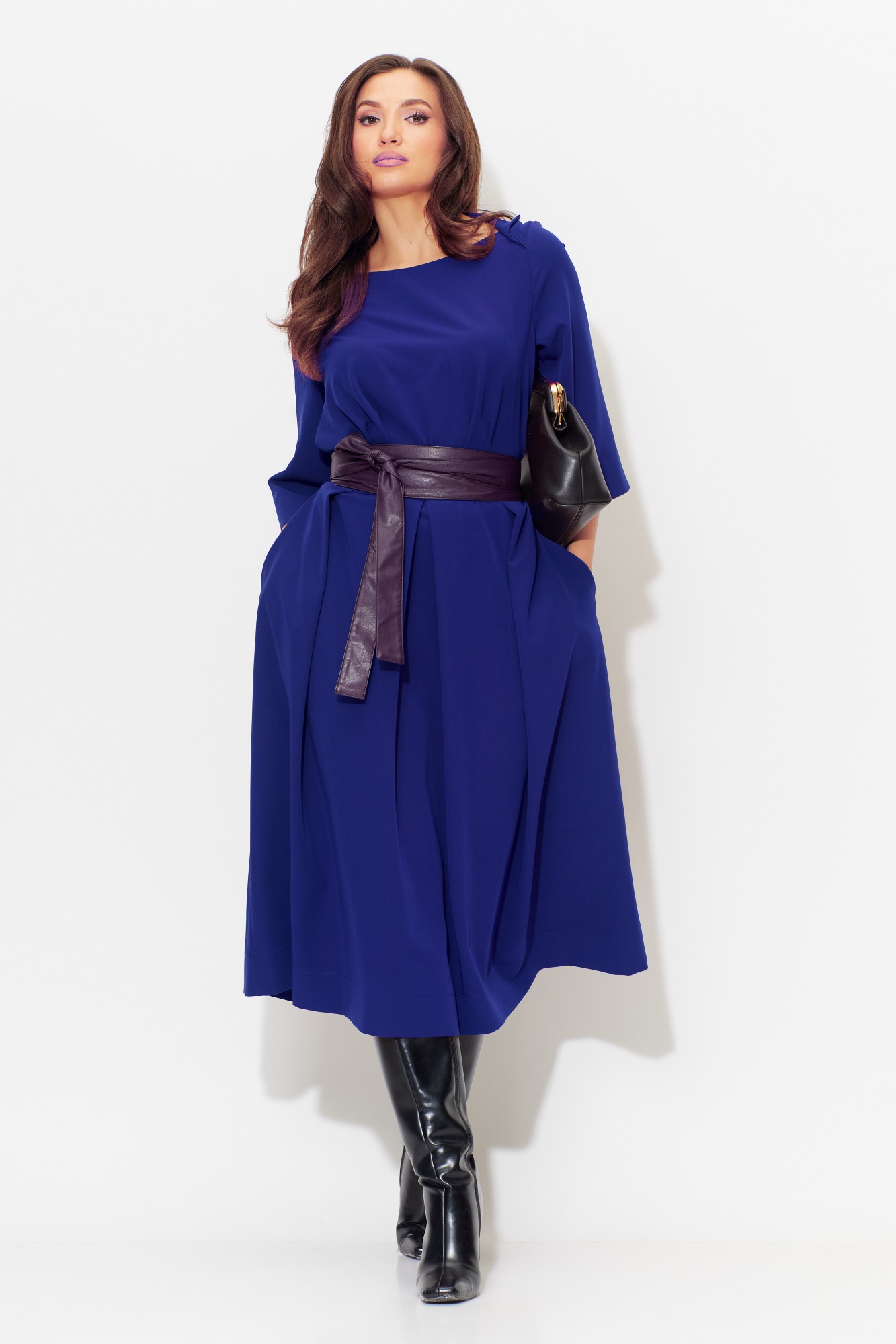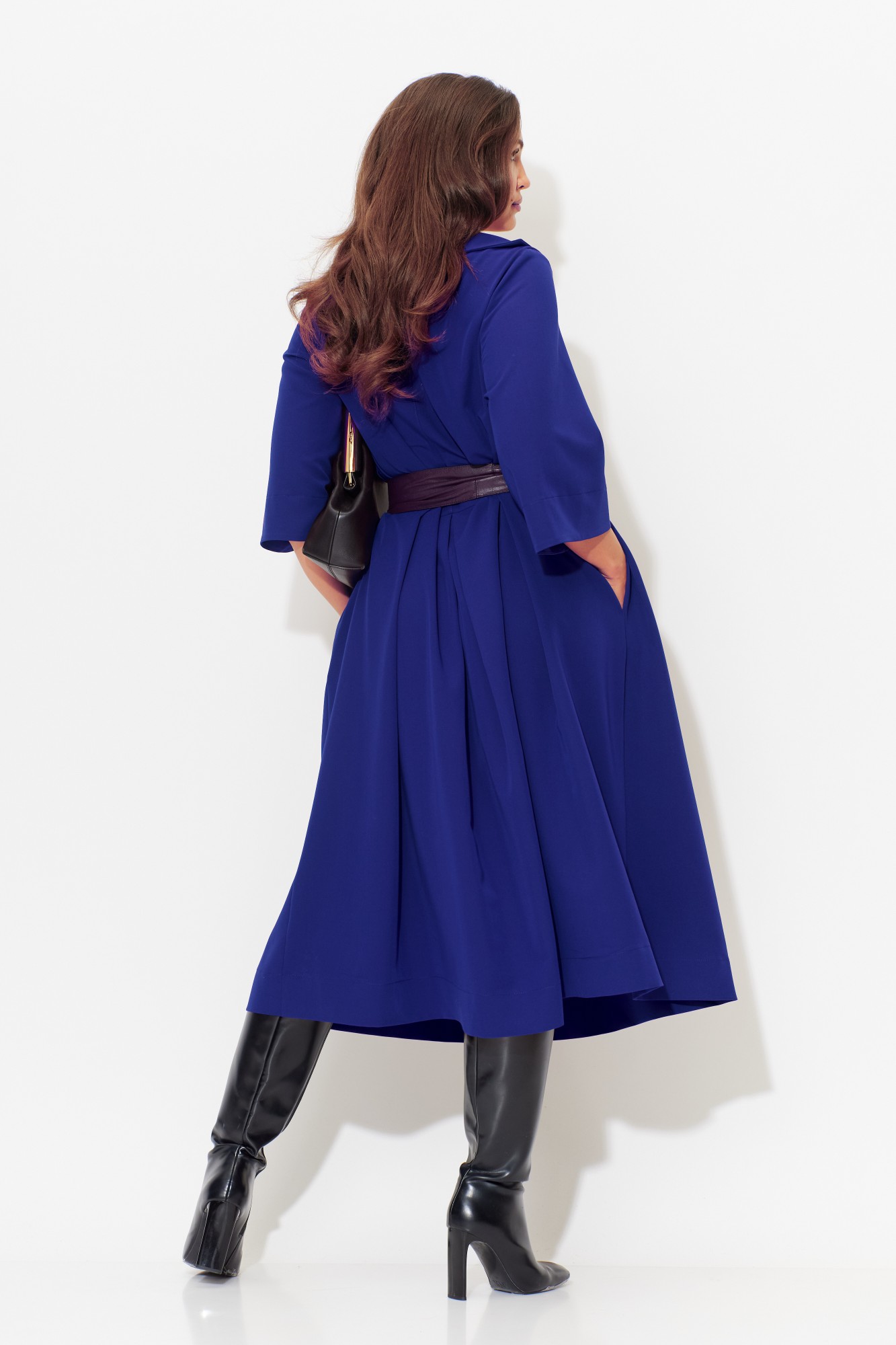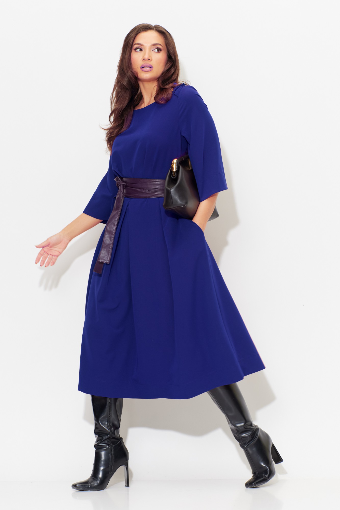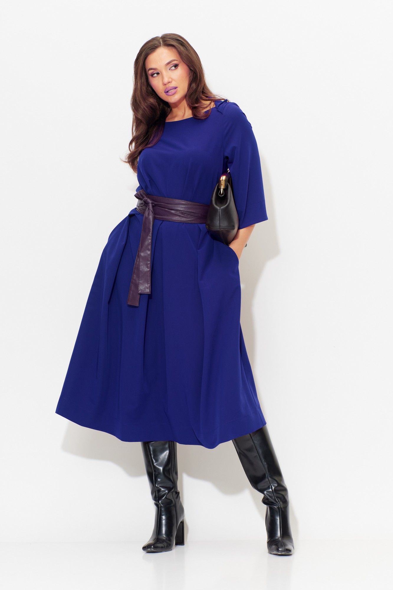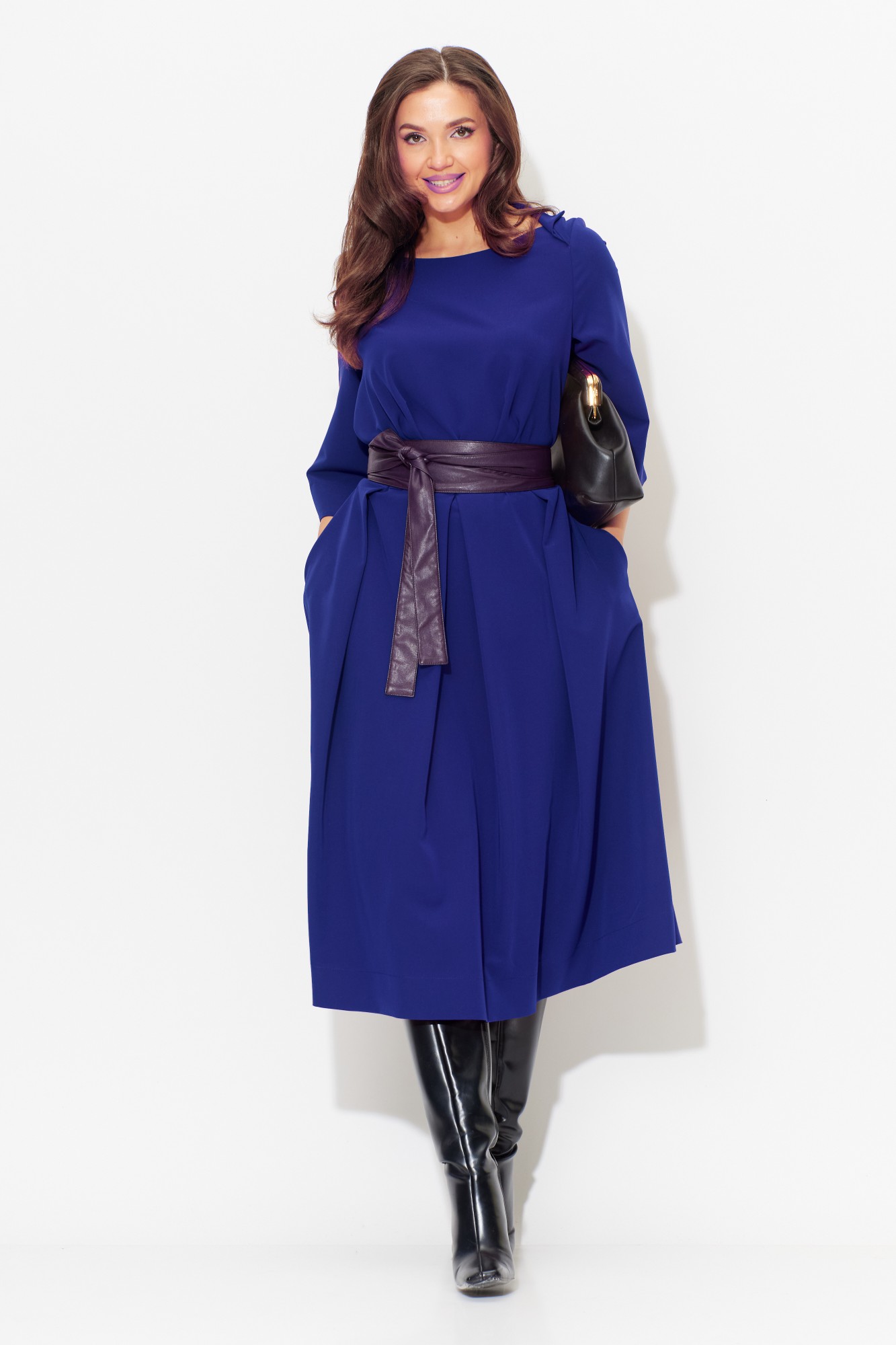 Шикарное женское платье идеально на любую погоду: под босоножки либо под сапоги и пальто. Отличный вариант универсального изделия: подойдет как для повседневного и офисного гардероба, так и для праздничного выхода. Отрезное по линии талии. По полочке объем груди создается за счет направленных складок из подреза. Объем юбки создается за счет центральной встречной и 2-х односторонних складок. По бокам в юбке- карманы. Рукав втачной, 3/4 длинны с отворотом. Вырез горловины лодочка с отложным воротником. В комплекте съемный пояс.