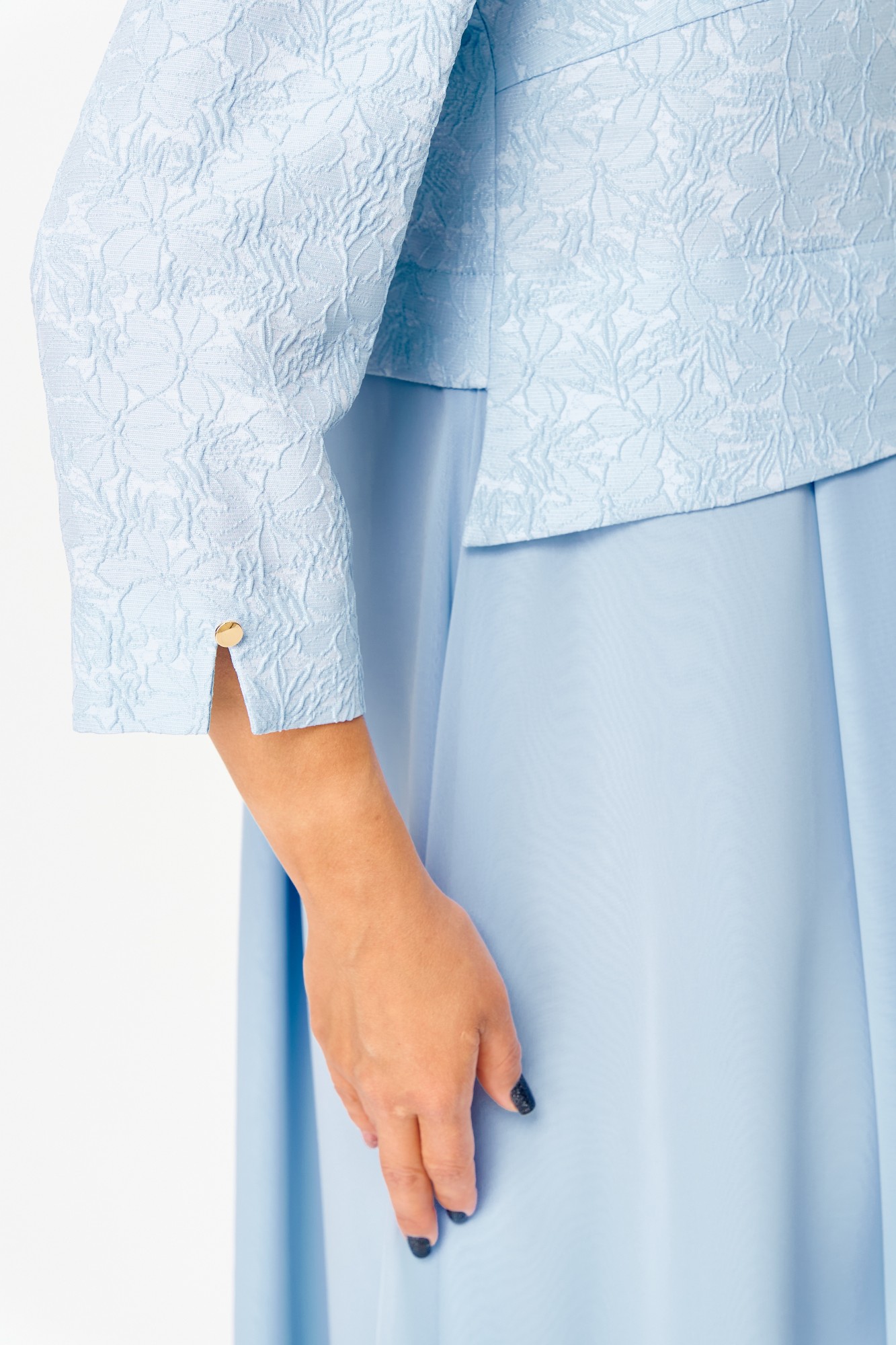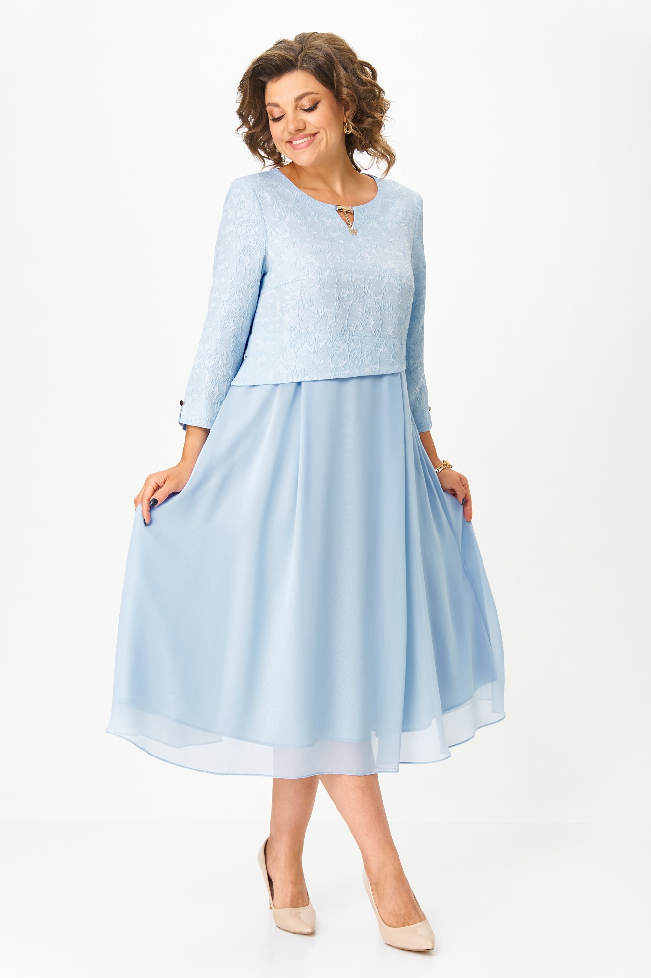 Элегантное женское платье, выполнено из жаккарда и шифона. Лиф из жаккарда, горловина круглая с декоративным элементом по центру, по низу лифа ответная складка, по переду низ асимметричный, рукава втачные, по низу декоративный элемент с пуговицей. Юбка платья из шифона, расширенная со складками, на подкладке.