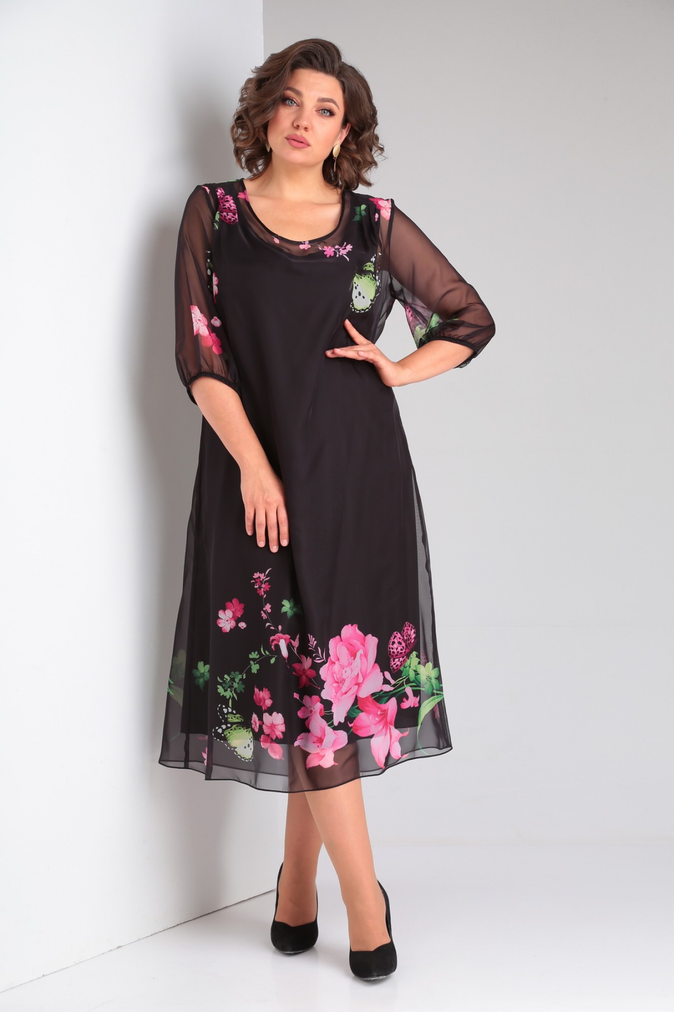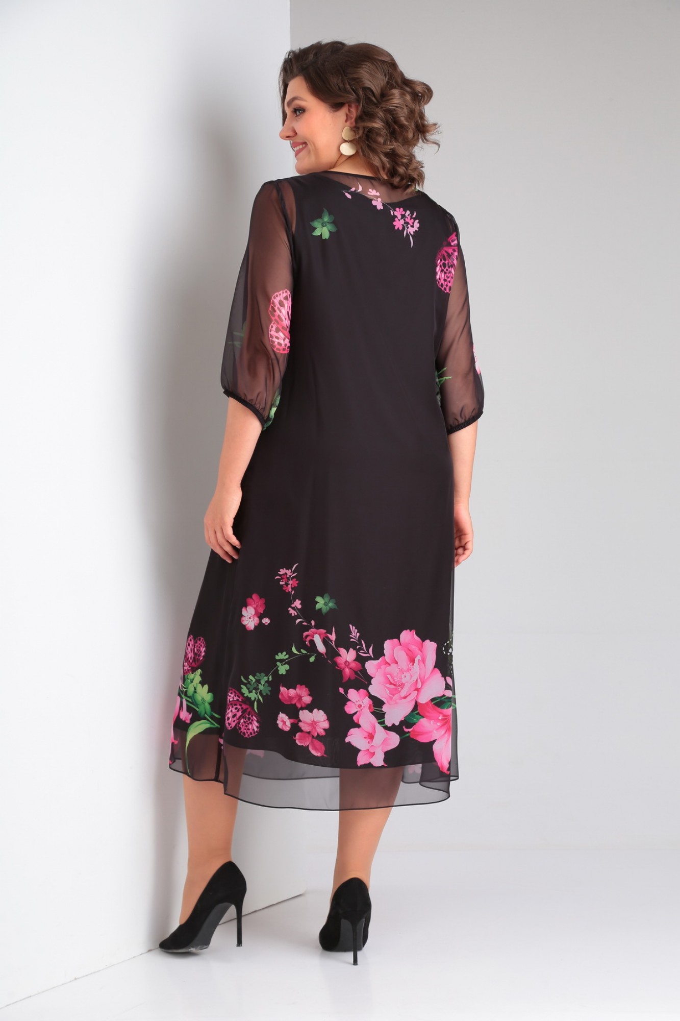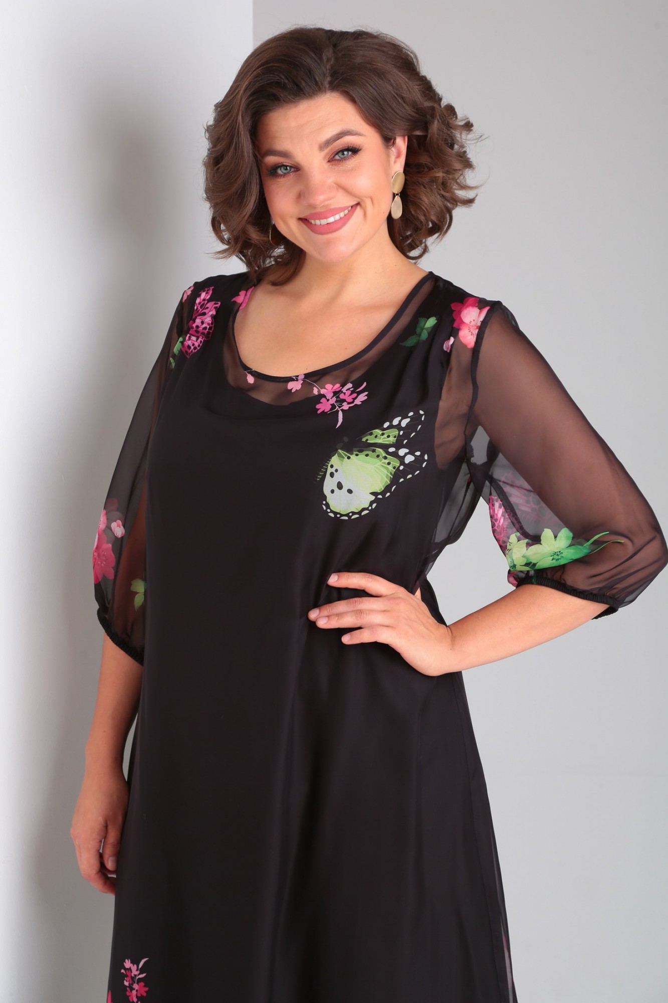 Платье женское двухслойное, расклешеное к низу. Верхнее платье из цветного шифона: перед с тремя застроченными складками у плеча. Рукав втачной, одношовный, снизу на резинке. Горловина округлой формы, проймы маечного типа. Перед с нагрудными вытачками. Нижнее и верхнее платье скреплены по плечу.