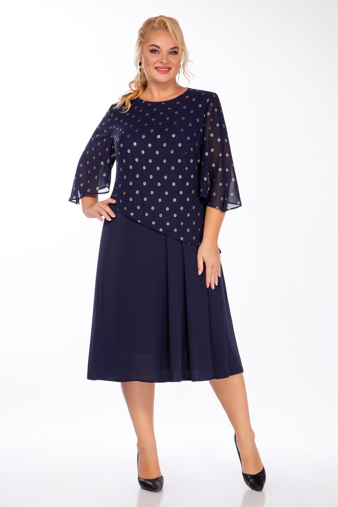 Платье прекрасно подойдет для торжественного мероприятия. В таком платье женщина будет выглядеть элегантно, празднично. Платье свободного кроя. Горловина округлая. Рукав втачной, свободный 3/4. Спинка платья со средним швом, сверху застежка на потайную молнию. По низу декоративный элемент- в виде заложенных складок, что создает романтичный образ. Изделие выполнено из легкого шифона, на тонкой пришивной подкладке.