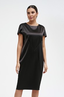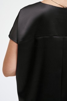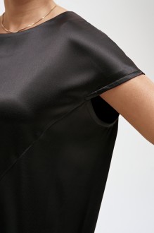 Платье свободного силуэта длины миди выполнено из плотного шелк-сатина, который держит форму за счет конструктивных линий. Платье с цельнокроенными рукавами и немного углубленным вырезом проймы, спинка со средним швом и кокеткой.
