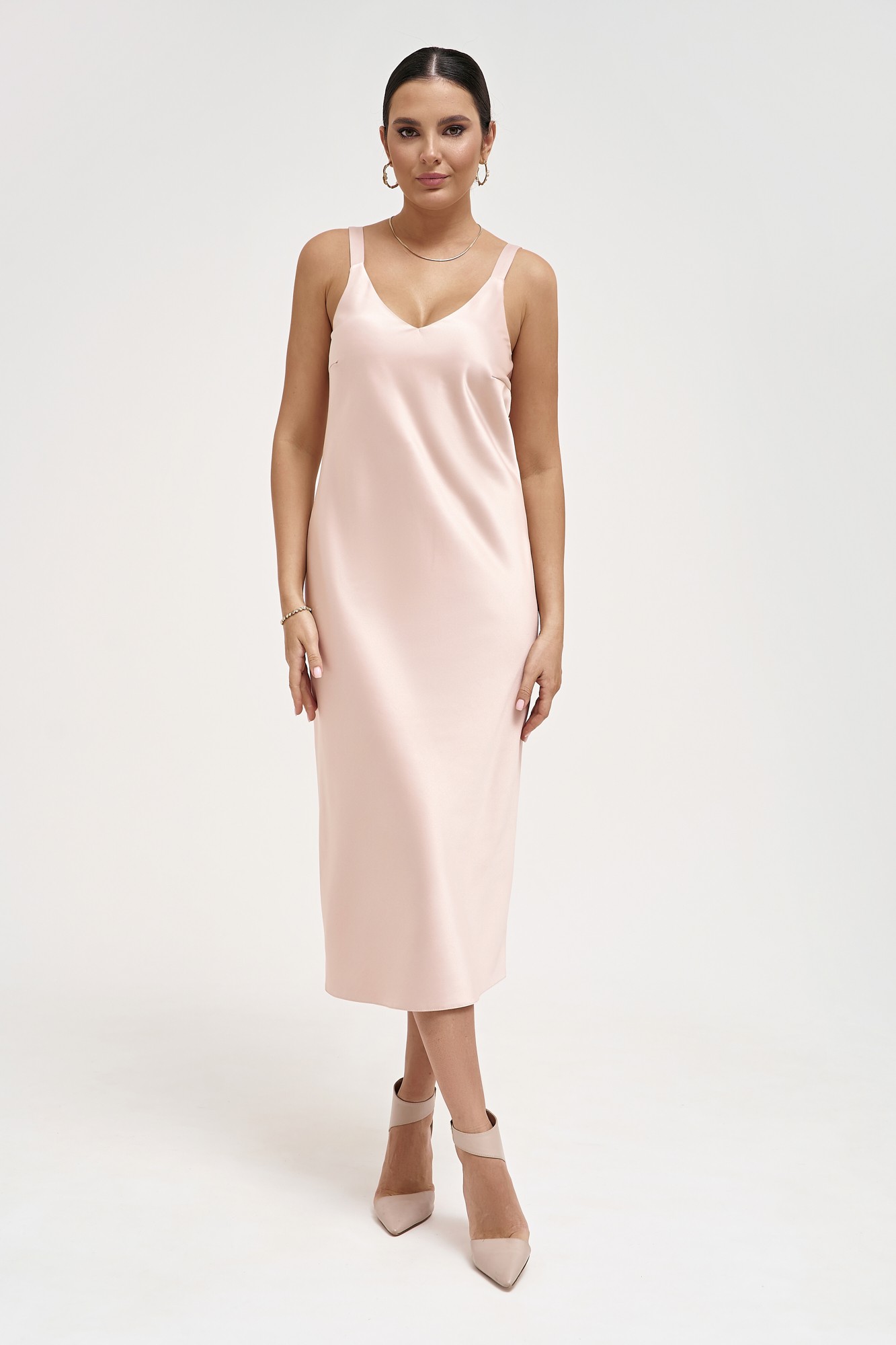 Женское шелковое платье-комбинация на бретелях длины миди. Платье выполнено по косой из плотного, держащего форму шелк-сатина без подкладки. В боковой шов вшита потайная молния.