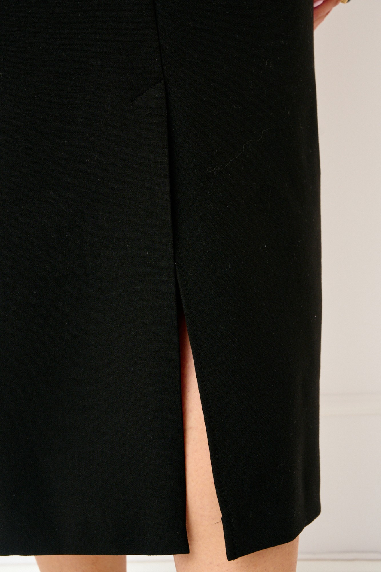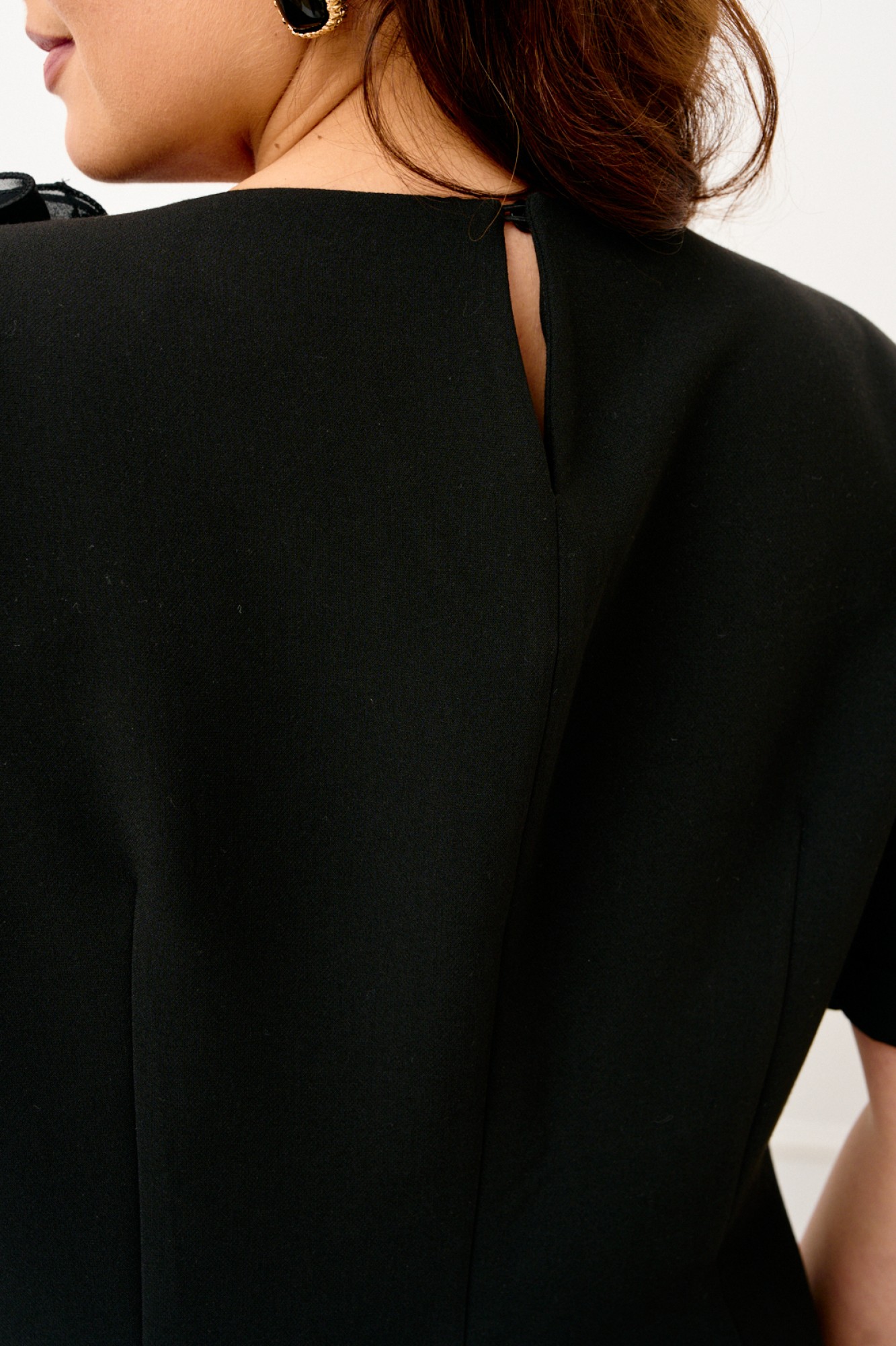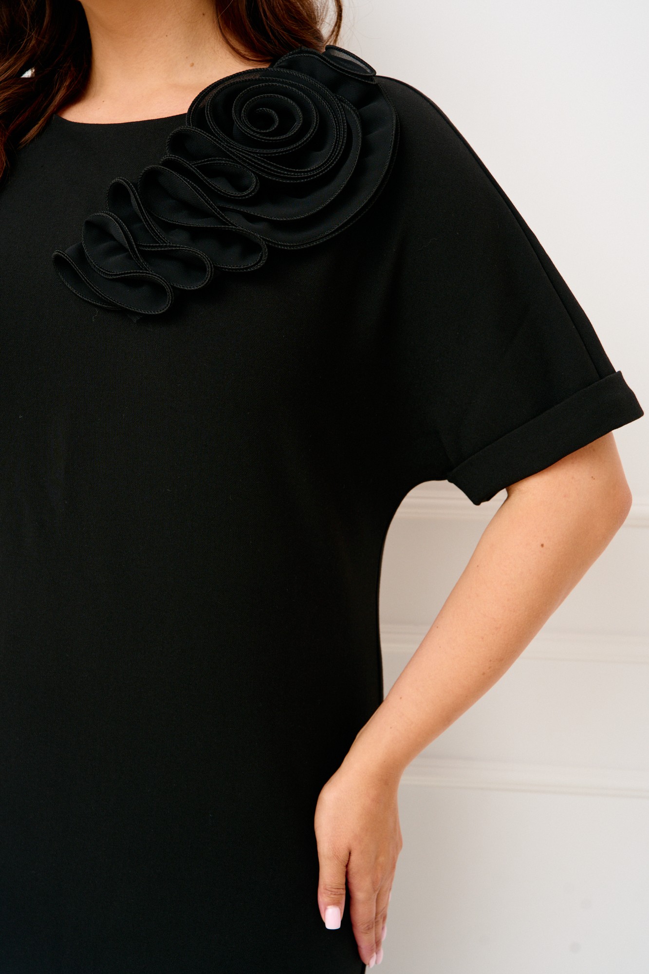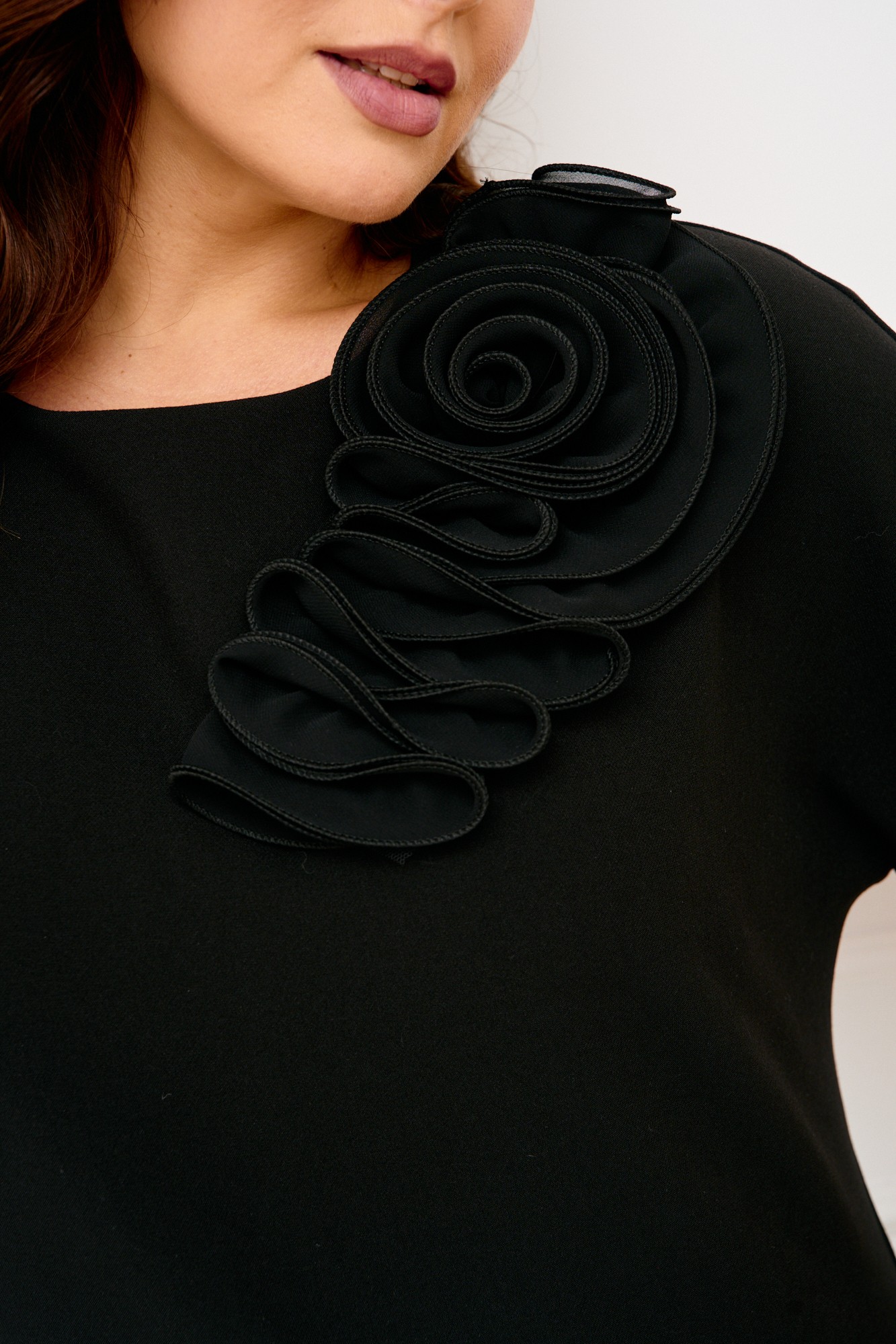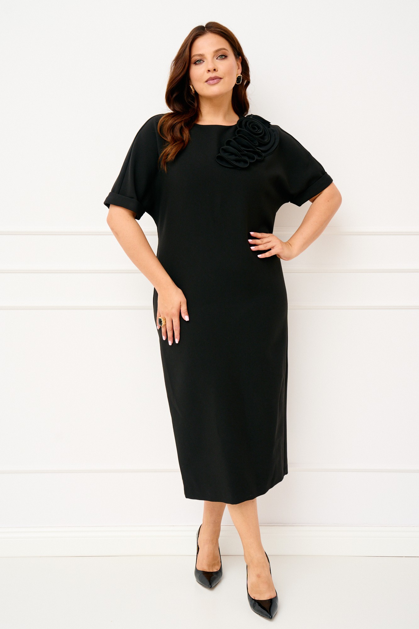Женское платье полуприлегающего силуэта выполнено из плательной ткани со втачными рукавами и декоративным несъемным цветком; по спинке вырез в виде капельки, который застегивается на петлю и пуговицу; по низу - шлица. Платье полностью соответствует заявленному размеру.