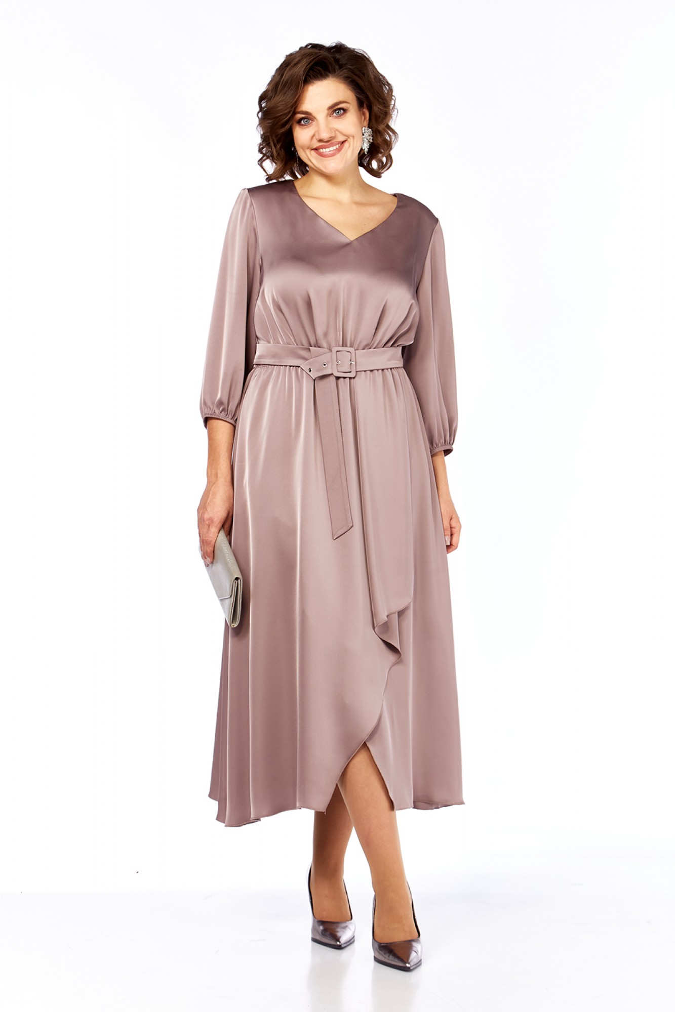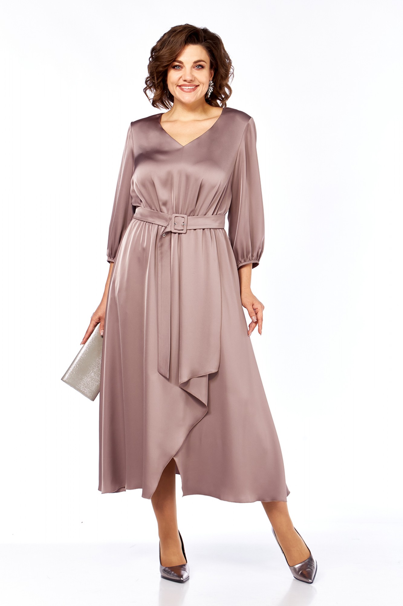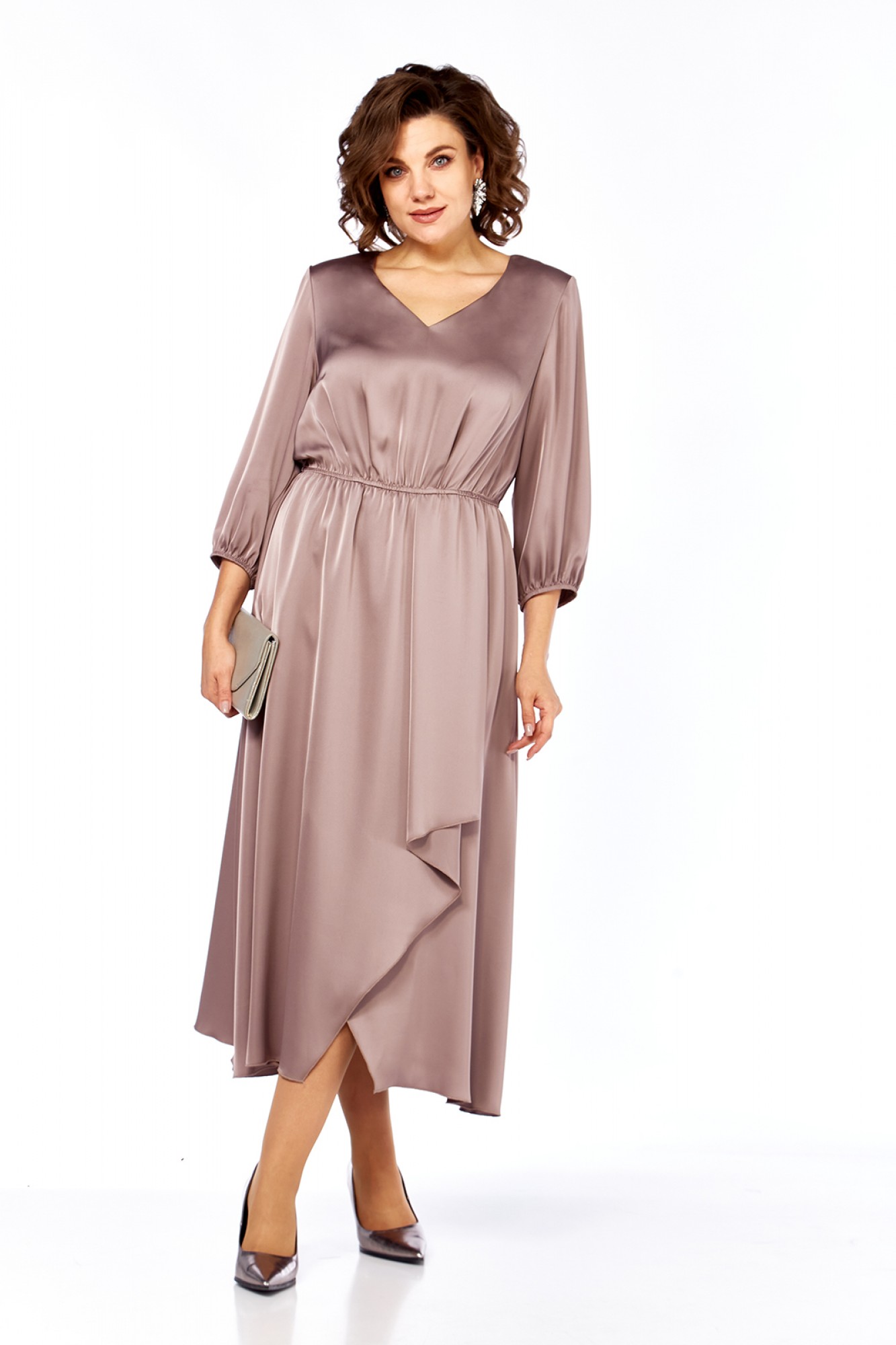 Платье женское, нарядное выполнено из плательной ткани, А-силуэта. Горловина V-образной формы. Платье отрезное по линии талии и присобрано на эластичную тесьму. В нижней части переда обработан запах с фигурной складкой. Рукава втачные, по низу присобраны на эластичную тесьму. Пояс выполнен из основной ткани. Нижняя часть платья на подкладке.