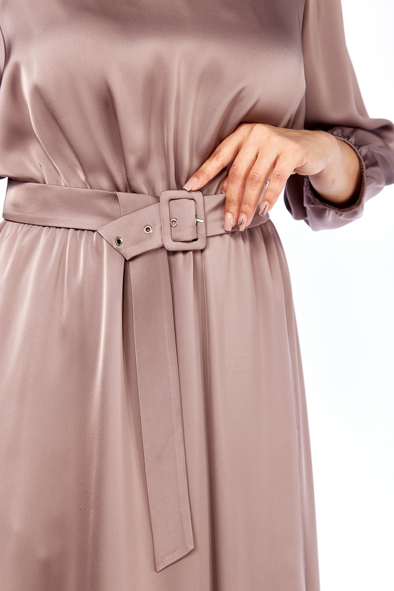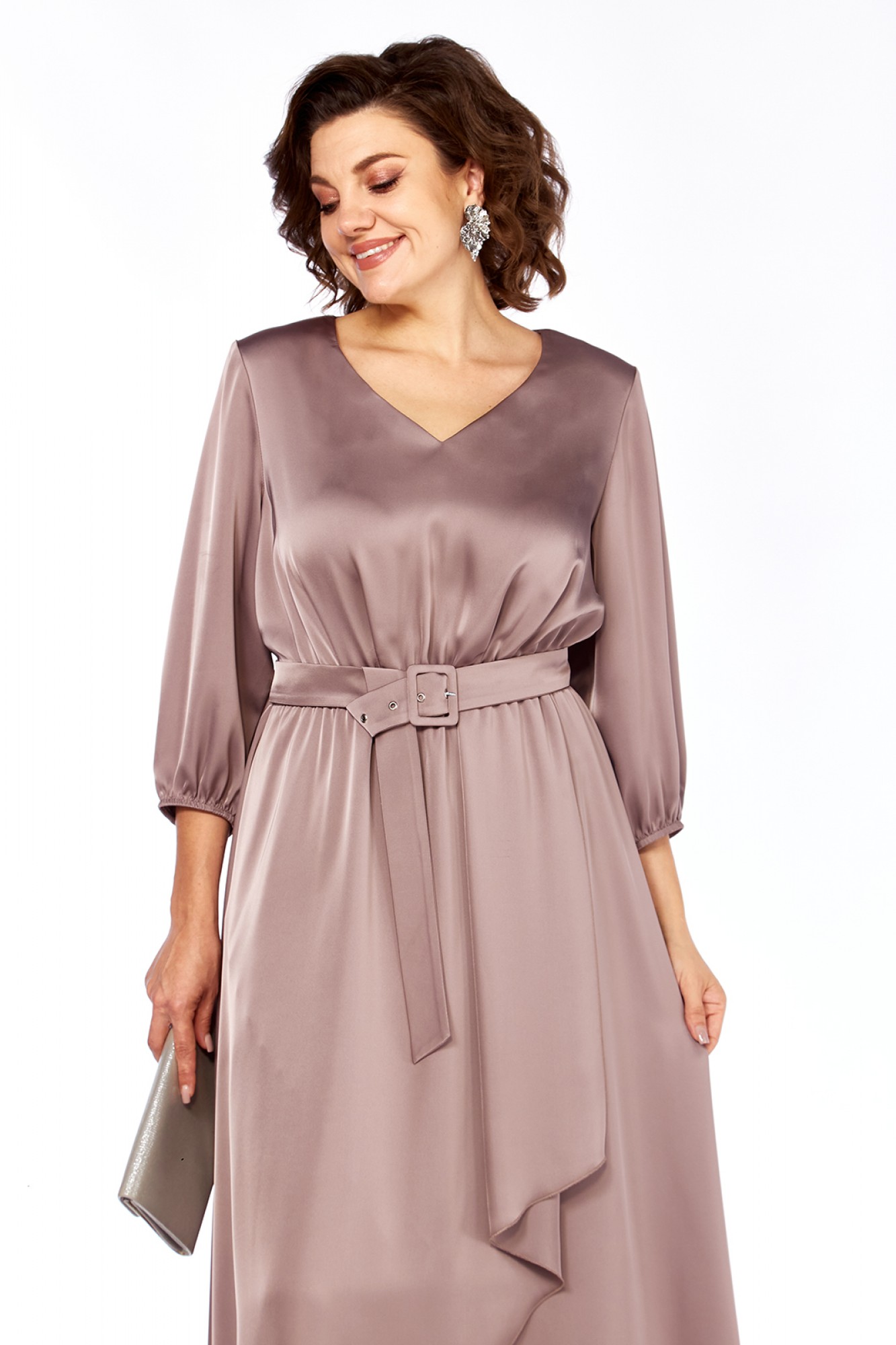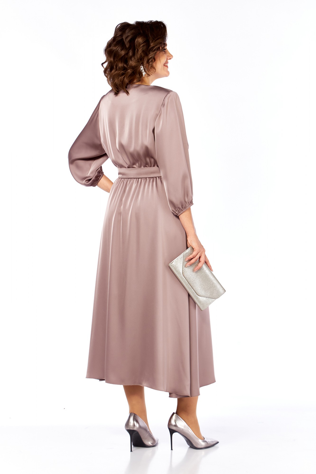 Платье женское, нарядное выполнено из плательной ткани, А-силуэта. Горловина V-образной формы. Платье отрезное по линии талии и присобрано на эластичную тесьму. В нижней части переда обработан запах с фигурной складкой. Рукава втачные, по низу присобраны на эластичную тесьму. Пояс выполнен из основной ткани. Нижняя часть платья на подкладке.