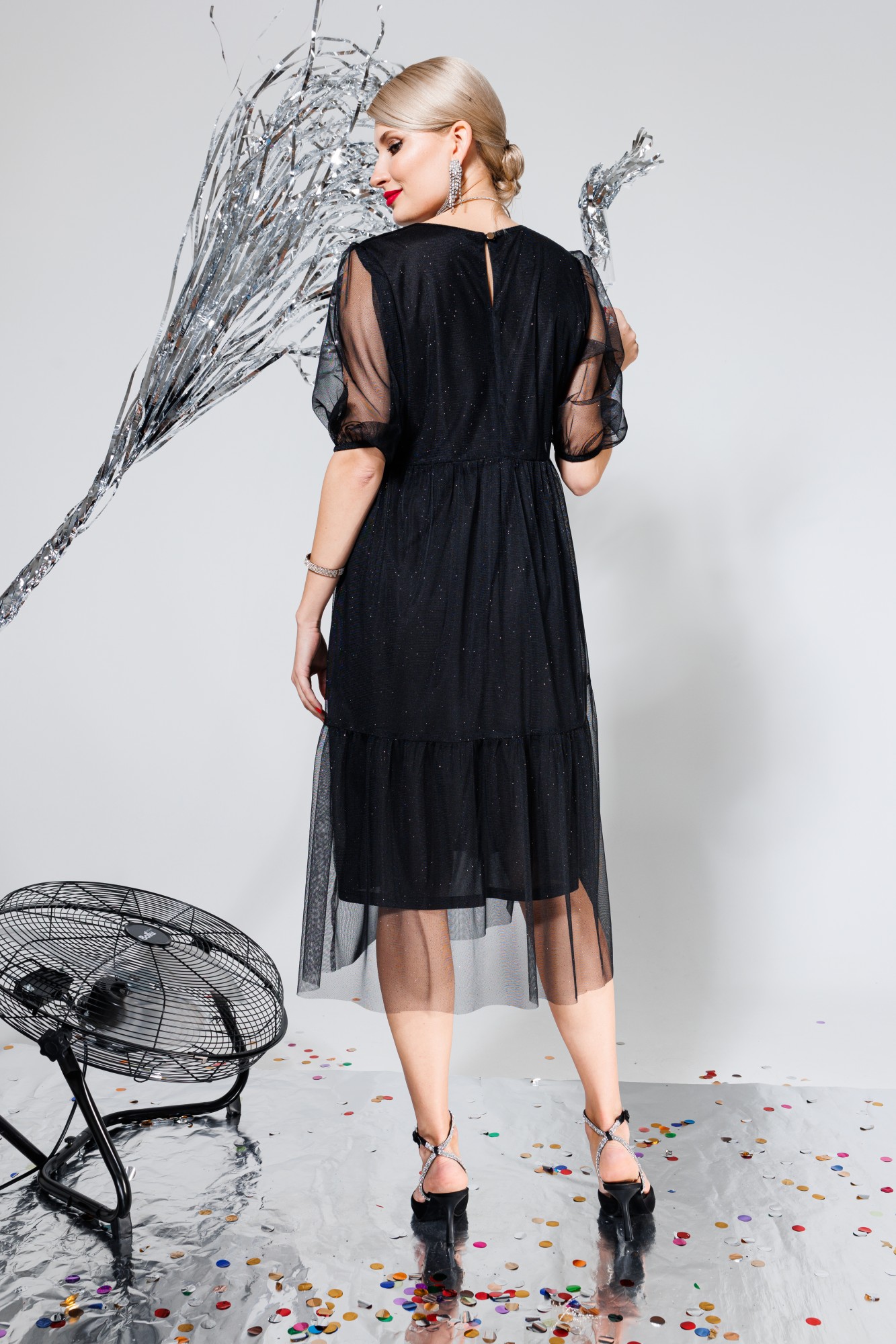Платье миди в мерцающую сетку. Платье ярусами со сборкой. Застежка сзади на пуговицу. Платье на подкладке. Стильное платье которое сделает ваш образ женсвенным. Если вы не любите яркие и вызывающие вещи, то это платье для вас. Базовое черное платье это основа любого гардероба.