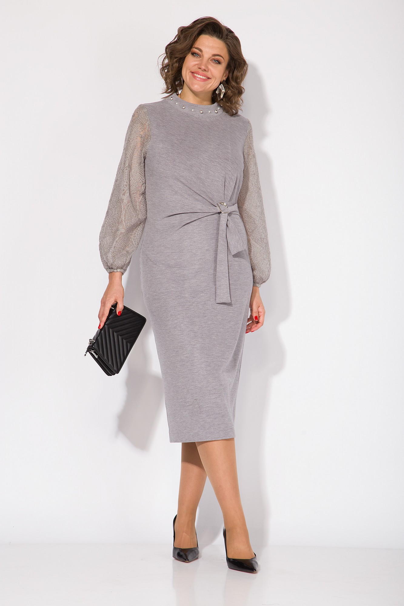 Эта модель платья из мягкого, уютного трикотажа подходит как для повседневного использования, так и для торжественных мероприятий. Прочная и эластичная ткань делает его незаменимым элементом вашего гардероба. Облегающий силуэт с эффектным подрезом по линии талии, переходящий в пояс с металлической пряжкой акцентирует фигуру и создает стильный, утончённый вид. Мягкая полулежащая стойка у горловины украшена пробивными бусинами из жемчуга. Спинка с центральным швом и обработанной шлицей по низу изделия. Застежка – потайная тесьма-молния по спинке. Эффектный ажурный рукав из сетки с вышивкой крючком дополняют и без того элегантный образ.
