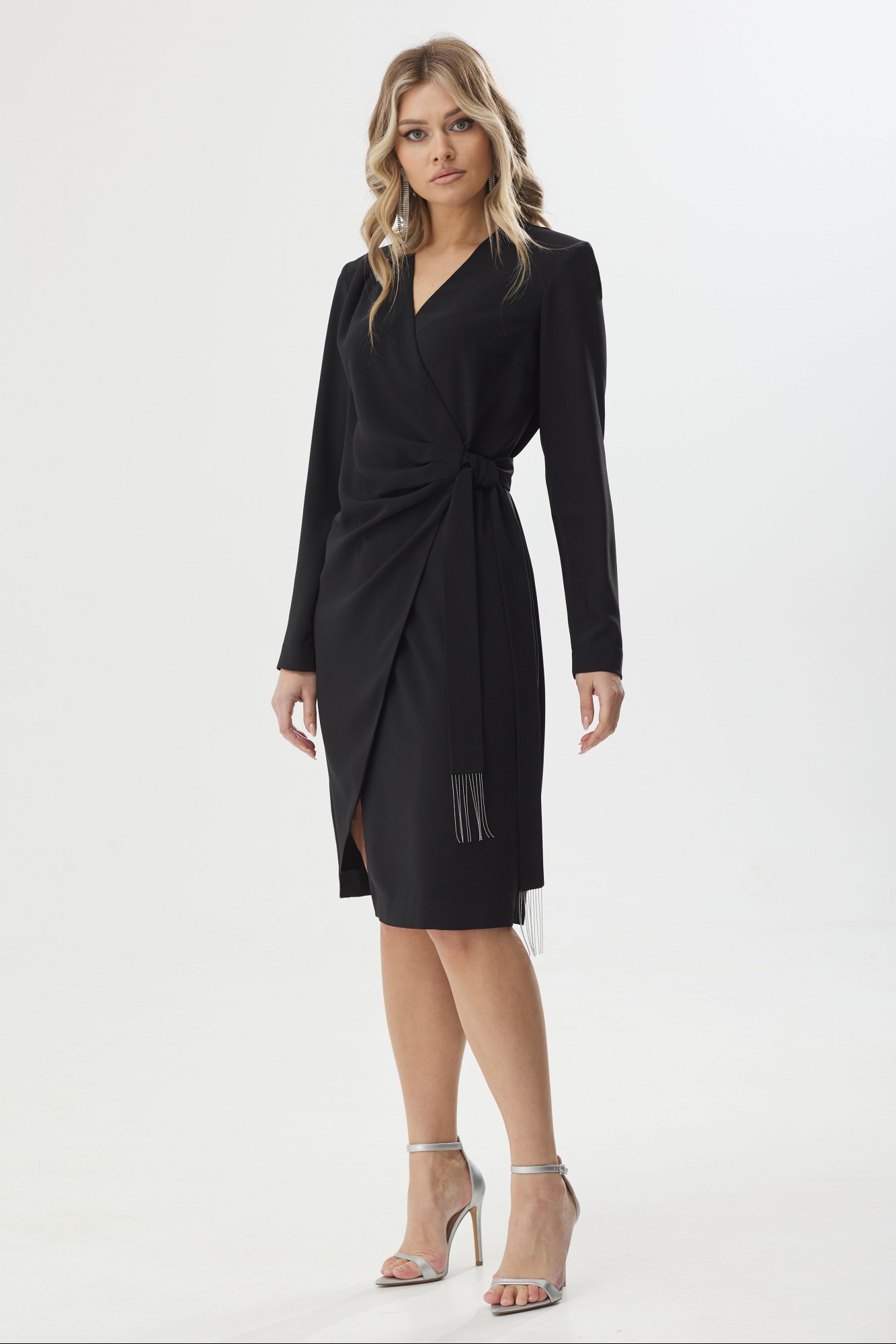 Нарядное платье на запах полуприлегающего силуэта с фигурным низом из струящейся ткани. Рукав втачной длинный. По правой стороне платья в области плеча декоративные складки. На спинке талиевые вытачки. На концах пояса декоративная тесьма. Платье без подкладки. В комплект входит декор в виде броши. Обращаем ваше внимание, что фурнитура может незначительно отличаться от фото.