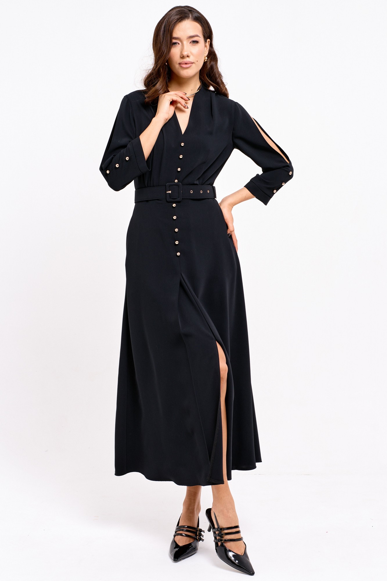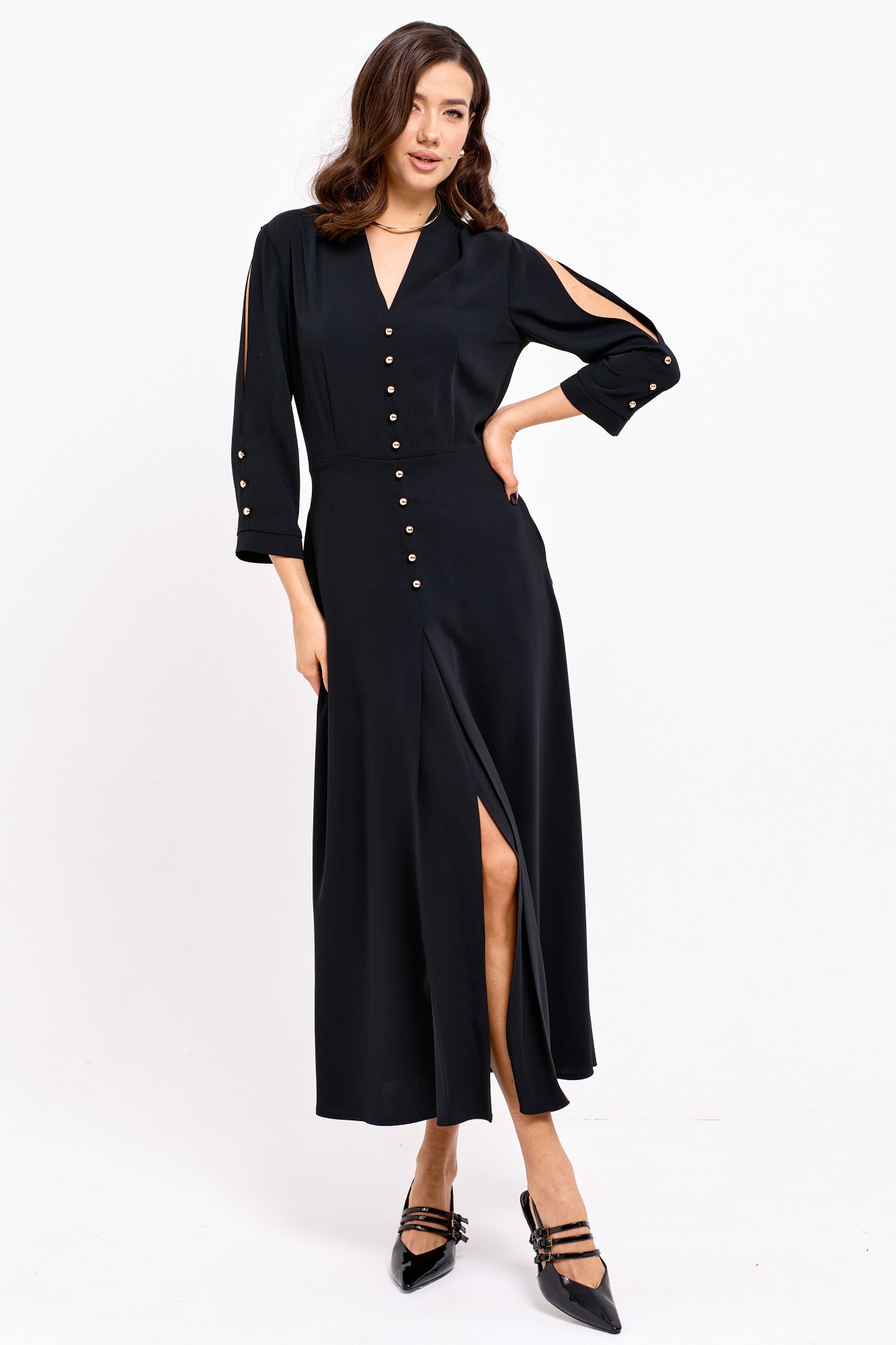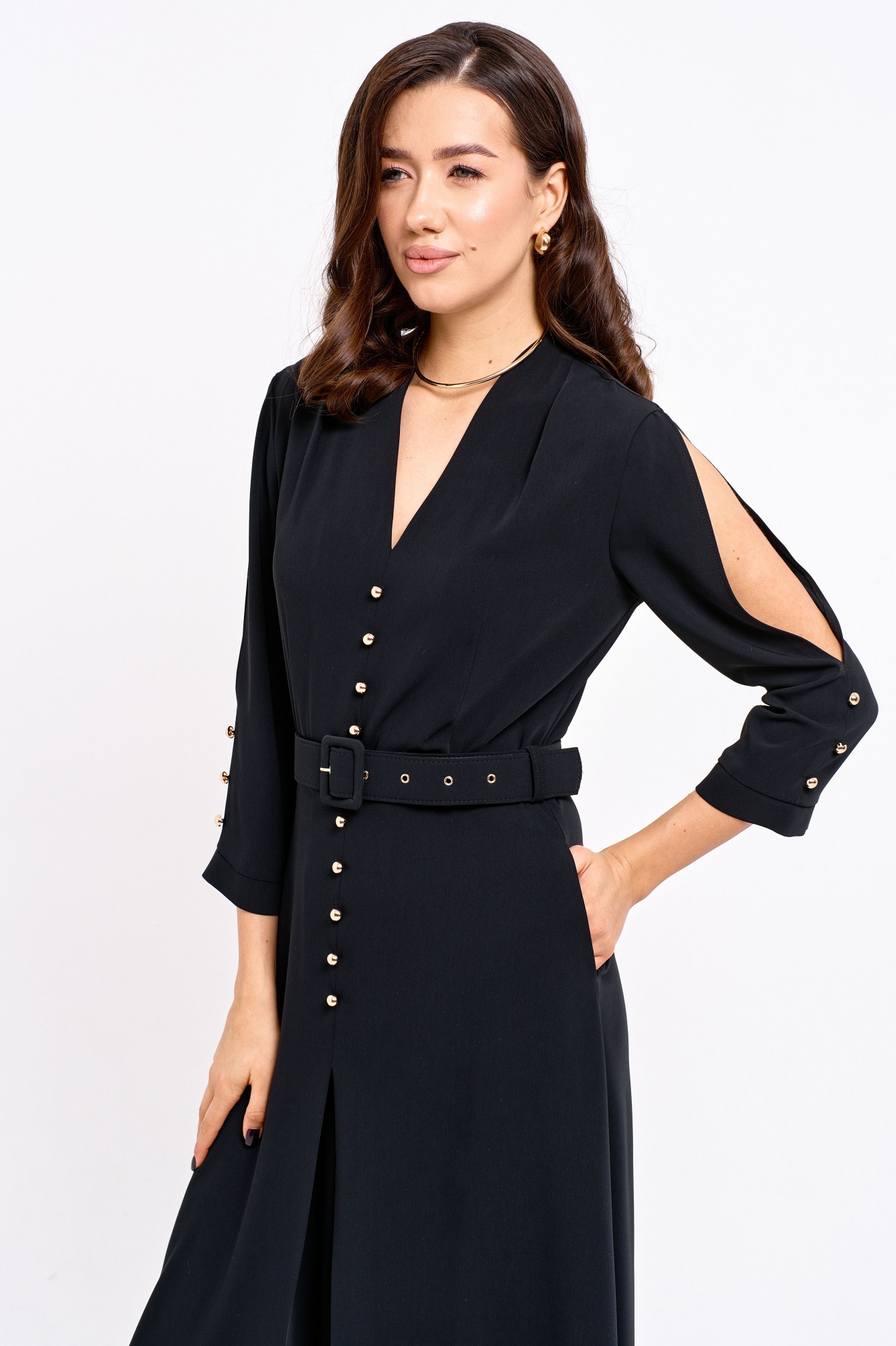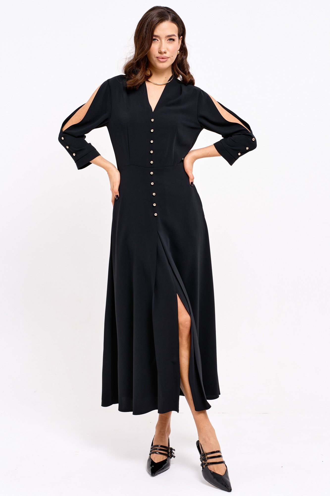 Платье полуприлегающего силуэта расширенное книзу из струящейся ткани. V-образный вырез горловины. Рукав втачной длиной 7/8 c разрезом по центру, по низу манжета. Платье отрезное на линии талии. По переду лифа таллиевые вытачки. На спинке застежка на потайную молнию и таллиевые вытачки. По центру переда шов переходящий в разрез по низу с декоративными пуговицами. В боковых швах функциональные карманы. Обращаем ваше внимание, что фурнитура может незначительно отличаться от фото.
