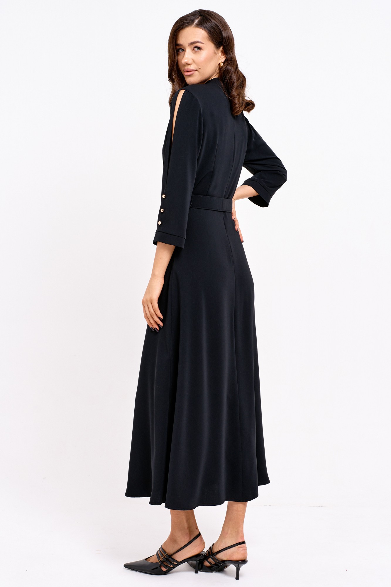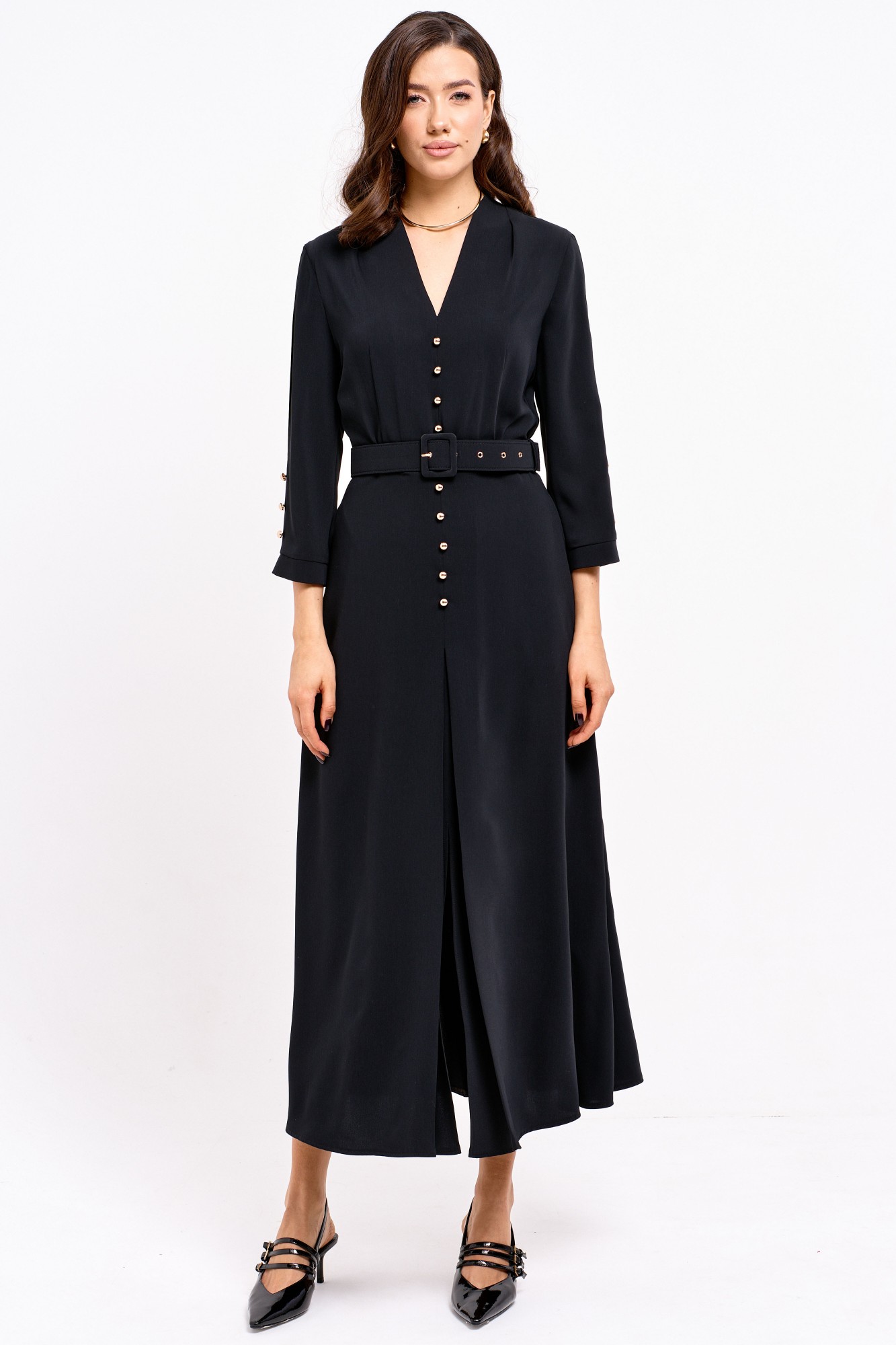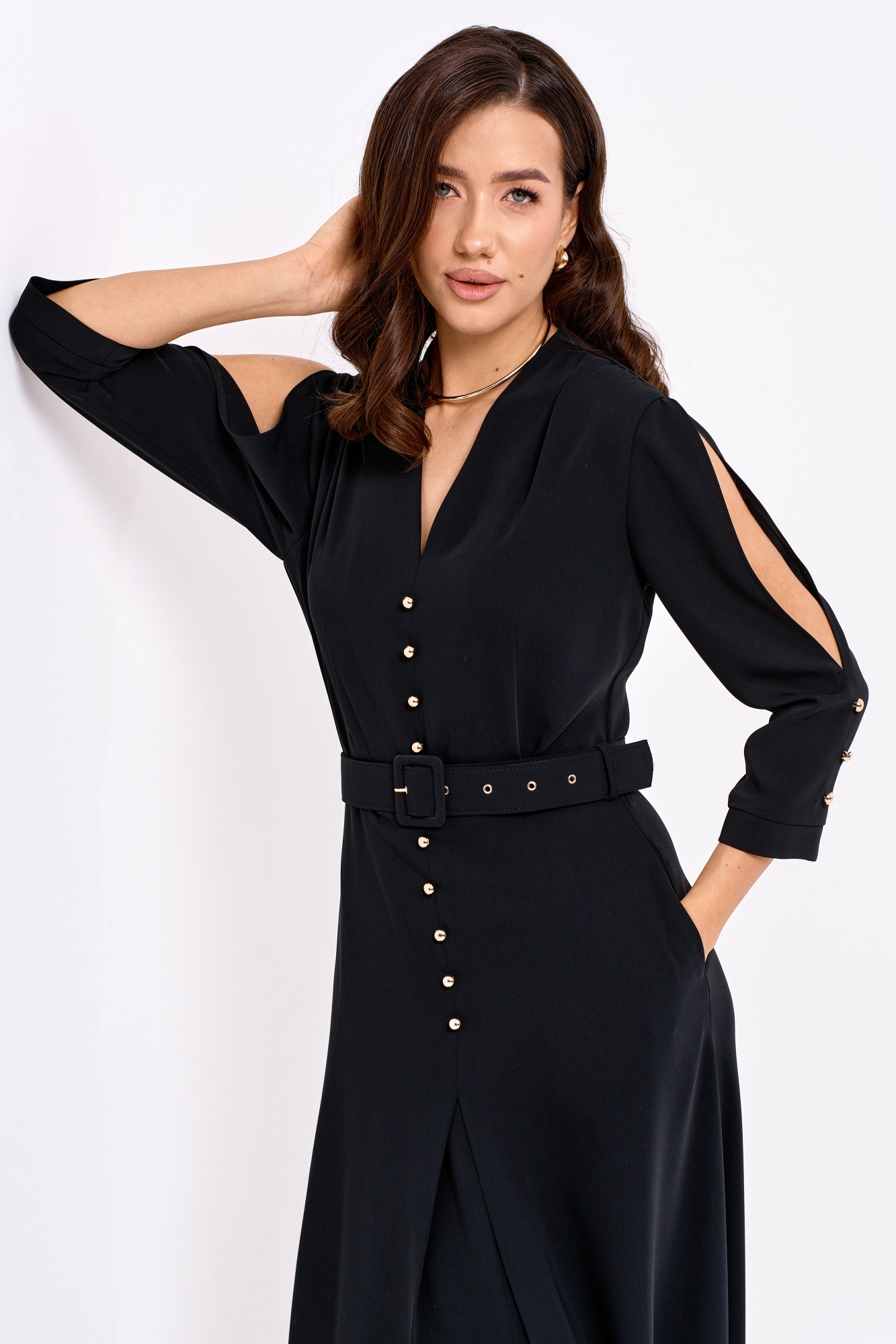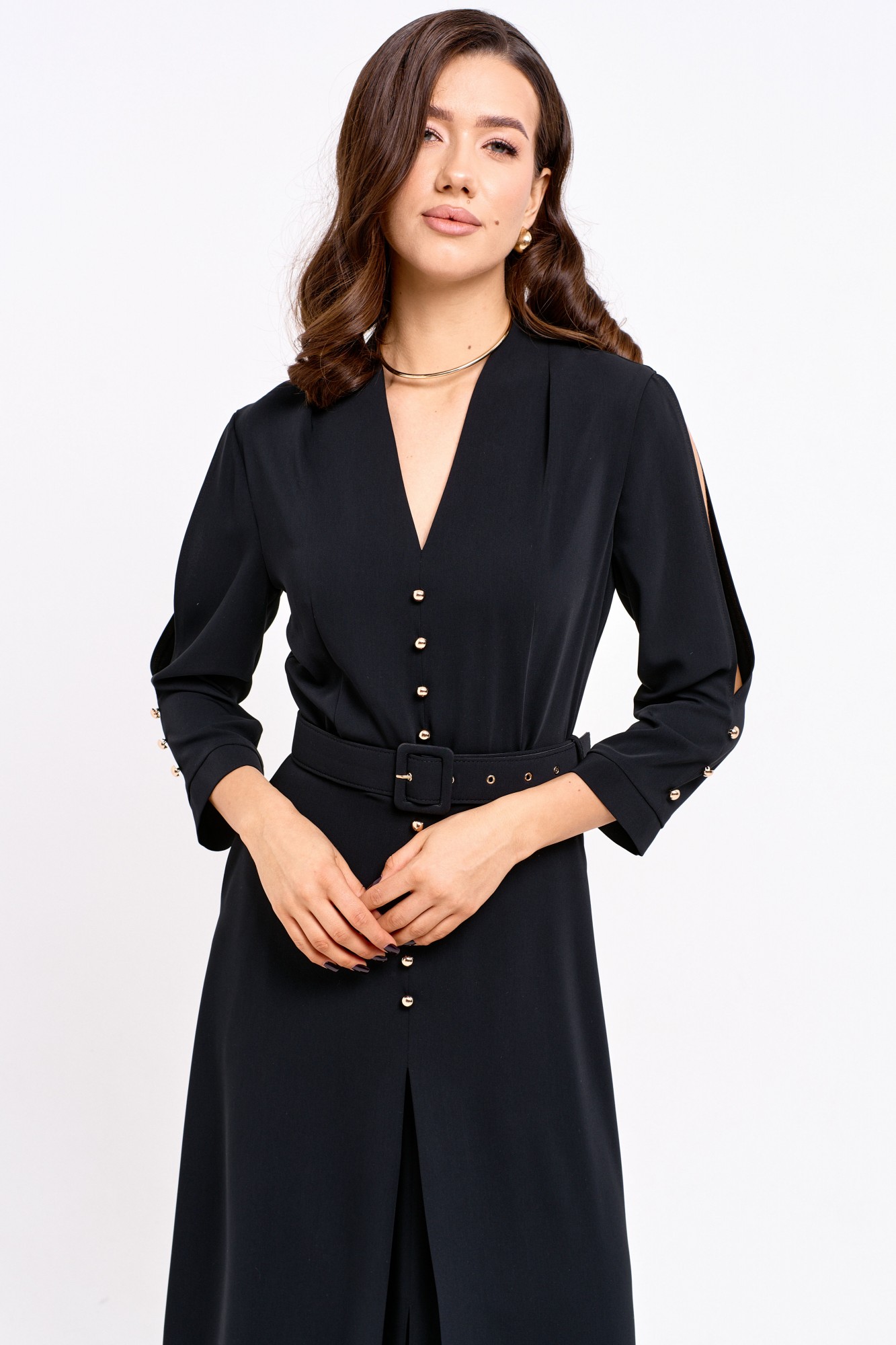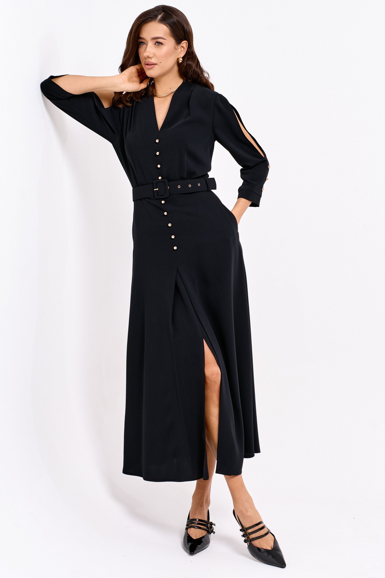 Платье полуприлегающего силуэта расширенное книзу из струящейся ткани. V-образный вырез горловины. Рукав втачной длиной 7/8 c разрезом по центру, по низу манжета. Платье отрезное на линии талии. По переду лифа таллиевые вытачки. На спинке застежка на потайную молнию и таллиевые вытачки. По центру переда шов переходящий в разрез по низу с декоративными пуговицами. В боковых швах функциональные карманы. Обращаем ваше внимание, что фурнитура может незначительно отличаться от фото.