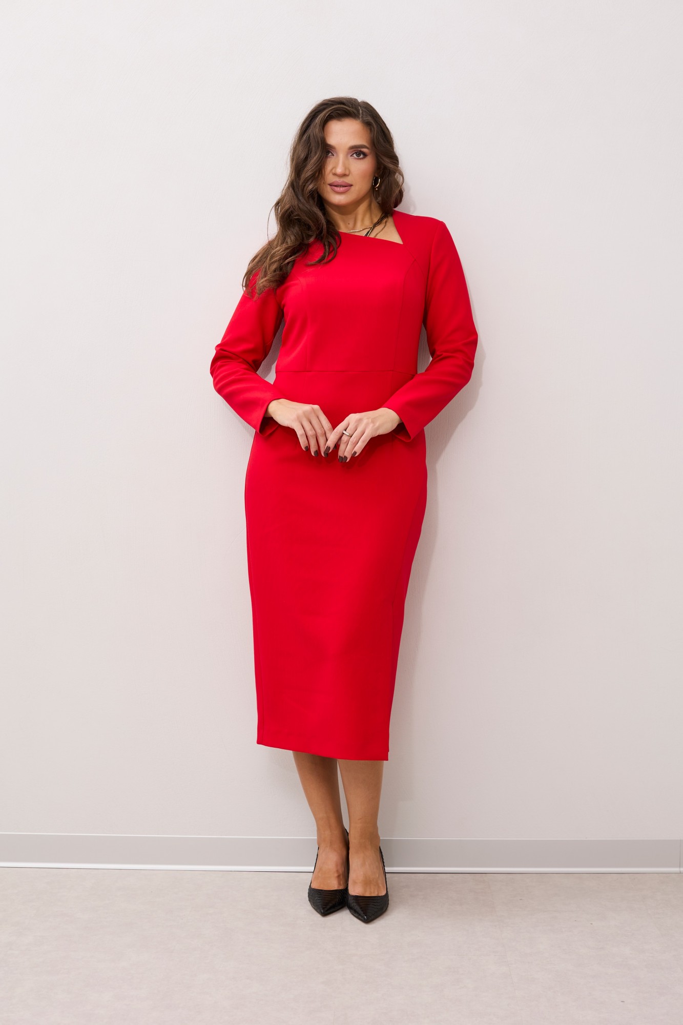 Платье полуприлегающего силуэта. По переду отрезное по линии талии с рельефами, с асимметричной фигурной горловиной. По низу переда фигурный подрез, заканчивающийся разрезом по левой стороне переда. По спинке средний шов с застежкой на молнию и талиевые вытачки. Рукав втачной, зауженный книзу.