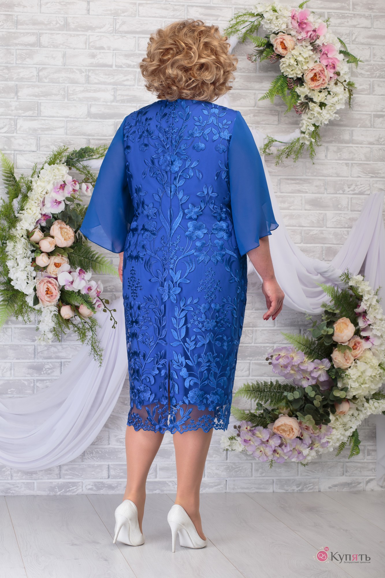 Платье женское, полуприлегающего силуэта, к низу чуть расширенное, двойное, нижняя часть из тонкой плательной ткани, верхняя из кружева. Длина по среднему шву спинки 110,0 см. по гипюру. Нагрудные выточки выходят из проймы. Нижняя спинка с талевыми выточками. В среднем шве спинки обработана застёжка на потайную тесьму молнию и разрез. Горловина круглая, углубленная спереди, обтачная. Шифоновые рукава, без швов, на запах по верхней части оката, длиной 41,0 см. Изделия с плечевыми накладками. Низ платья украшен фестонами.