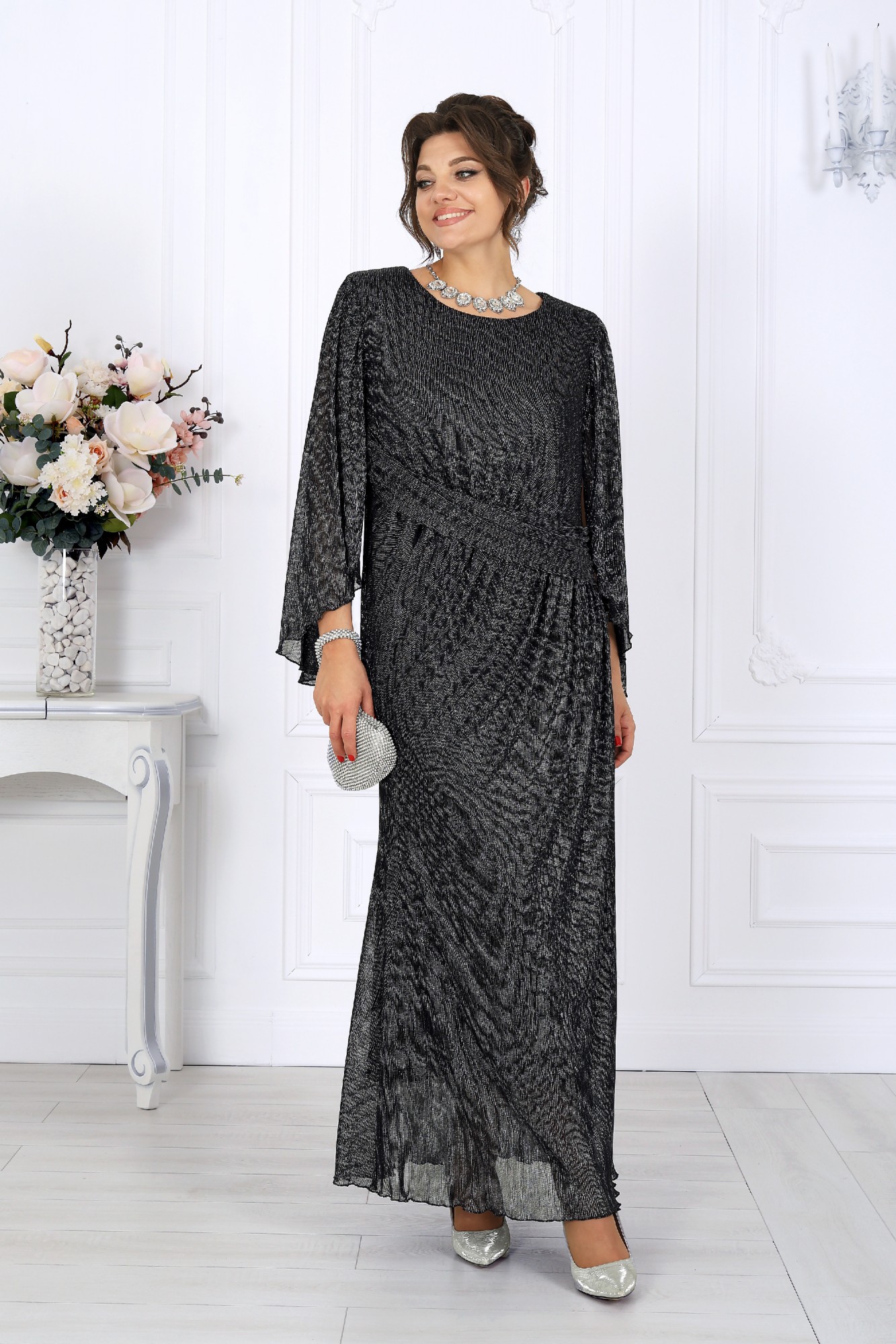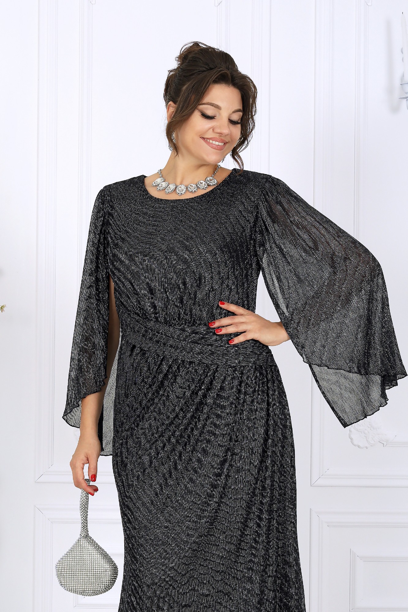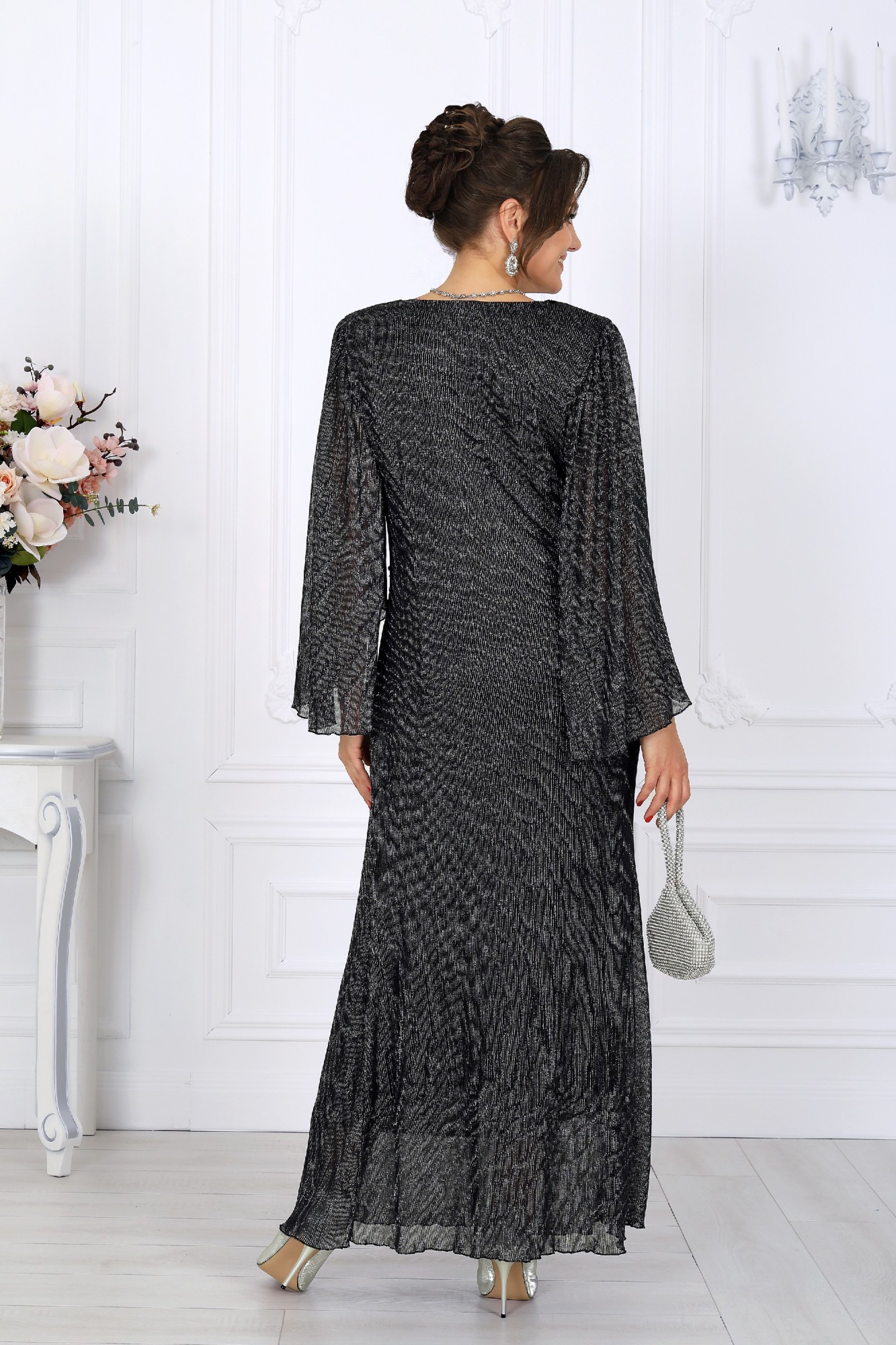 Длинное вечернее платье из элегантной сетки-гофре с нитью люрекс мерцает при каждом движении, словно улавливая в себе отблески огней. Этот деликатный блеск смотрится дорого и изысканно, создавая неповторимый аристократичный образ. Особое внимание заслуживает рукав — лёгкий, без шва, с изящно ниспадающими краями. Его воздушность придаёт образу загадочность и утончённость, а необычный крой с драпировкой и сборкой по линии плеч делает движения пластичными и грациозными. Фигурный вырез горловины придаёт образу нотку смелости, но остаётся выдержанным и гармоничным. Это платье прекрасно подходит для особых случаев: свадьбы, юбилея, званого вечера или торжества. Оно одинаково уместно в праздничной, свадебной или официальной атмосфере, позволяя вам ощущать себя королевой момента. Модель идеально подойдёт женщинам с формами — за счёт продуманного кроя она выгодно подчёркивает достоинства и деликатно скрывает лишнее, формируя правильный силуэт. Выбирая эту модель, вы выбираете не просто наряд, а состояние души — ощущение уверенности, стиля и особой значимости каждого момента. Платье женское, прилегающего силуэта с расширением к низу, выполнено из сетки-гофре с нитью «люрекс». Модель на трикотажной подкладке, без застежки, с плечевыми накладками. В верхней части переда косой подрез со сборкой; в шов подреза входит задрапированный декоративный элемент. На спинке обработаны таллиевые вытачки. Вырез горловины переда и спинки округлой формы, по переду углубленный. Рукав без шва, с отлетными краями и фигурным низом, по окату сборка; крепится к пройме только в верхней части. Пройма окантована узкой косой бейкой из основного материала.