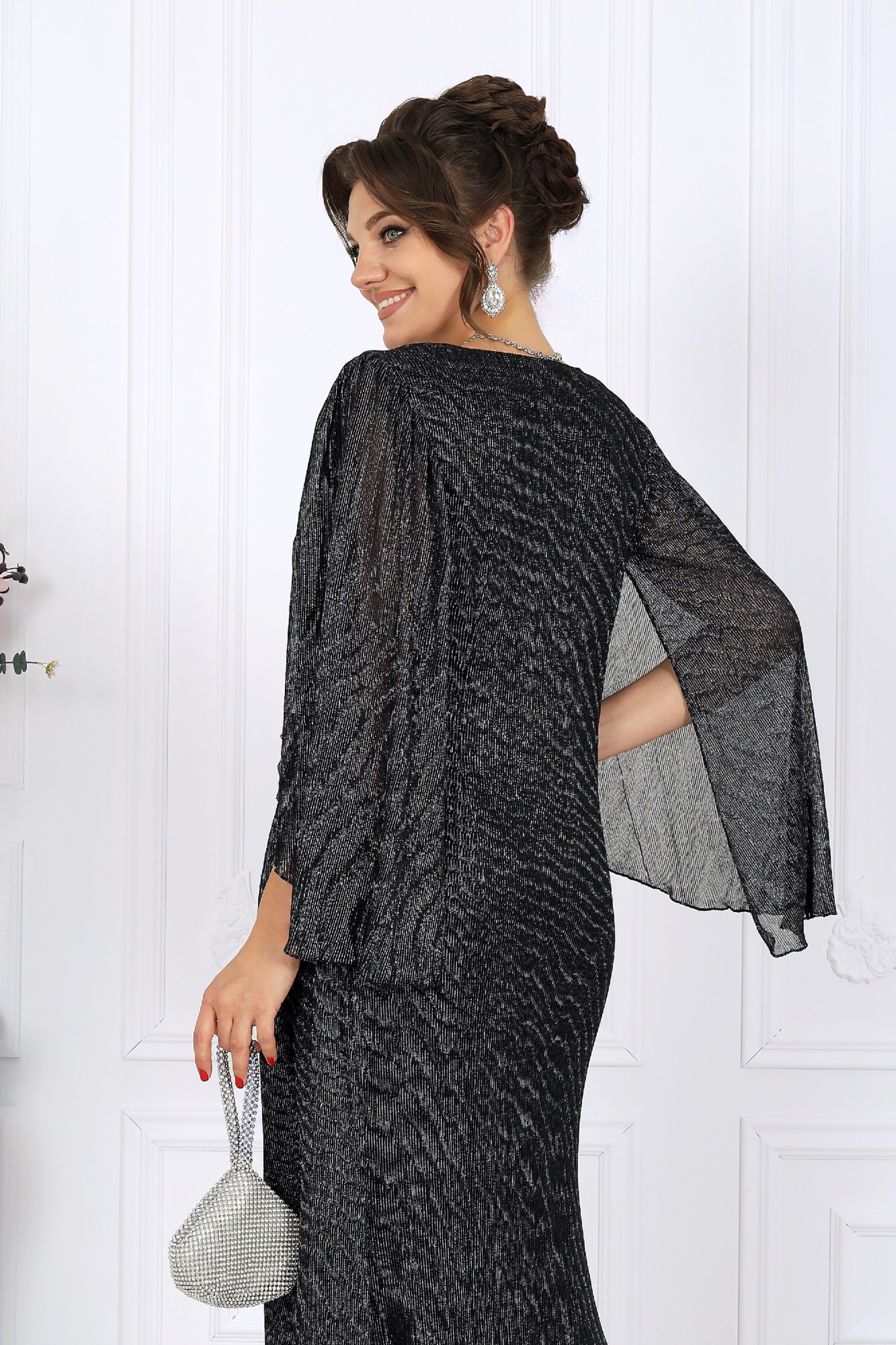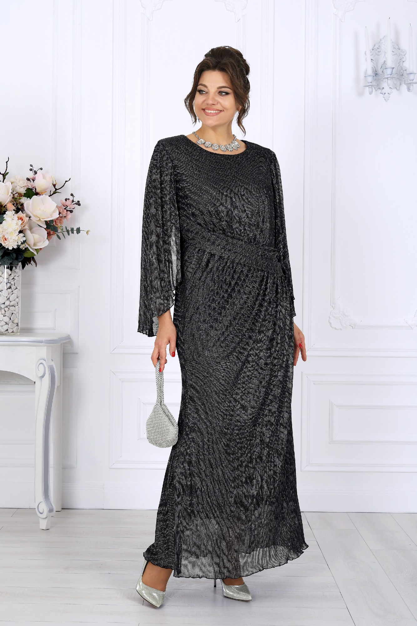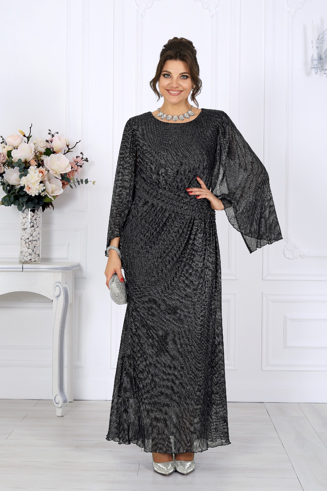 Длинное вечернее платье из элегантной сетки-гофре с нитью люрекс мерцает при каждом движении, словно улавливая в себе отблески огней. Этот деликатный блеск смотрится дорого и изысканно, создавая неповторимый аристократичный образ. Особое внимание заслуживает рукав — лёгкий, без шва, с изящно ниспадающими краями. Его воздушность придаёт образу загадочность и утончённость, а необычный крой с драпировкой и сборкой по линии плеч делает движения пластичными и грациозными. Фигурный вырез горловины придаёт образу нотку смелости, но остаётся выдержанным и гармоничным. Это платье прекрасно подходит для особых случаев: свадьбы, юбилея, званого вечера или торжества. Оно одинаково уместно в праздничной, свадебной или официальной атмосфере, позволяя вам ощущать себя королевой момента. Модель идеально подойдёт женщинам с формами — за счёт продуманного кроя она выгодно подчёркивает достоинства и деликатно скрывает лишнее, формируя правильный силуэт. Выбирая эту модель, вы выбираете не просто наряд, а состояние души — ощущение уверенности, стиля и особой значимости каждого момента. Платье женское, прилегающего силуэта с расширением к низу, выполнено из сетки-гофре с нитью «люрекс». Модель на трикотажной подкладке, без застежки, с плечевыми накладками. В верхней части переда косой подрез со сборкой; в шов подреза входит задрапированный декоративный элемент. На спинке обработаны таллиевые вытачки. Вырез горловины переда и спинки округлой формы, по переду углубленный. Рукав без шва, с отлетными краями и фигурным низом, по окату сборка; крепится к пройме только в верхней части. Пройма окантована узкой косой бейкой из основного материала.