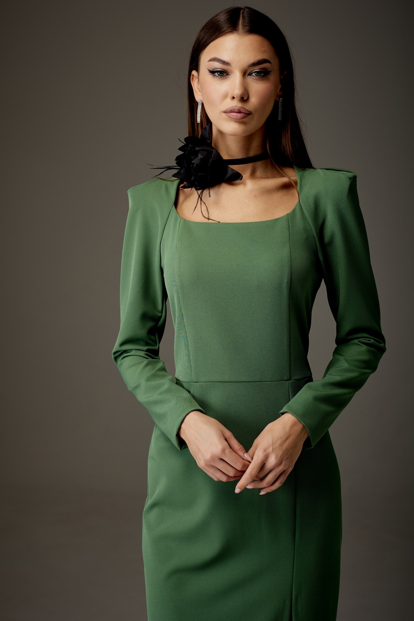 Платье приталенного силуэта, покроя реглан. Выполнено из костюмно-плательной ткани. Платье удлиненное до середины икры, отрезное по линии талии, рукава полной длины.Спинка со средним швом, в котором расположена тесьма-молния. Спереди слева, по линии ноги, расположен разрез. Рукав традиционной формы со складкой по окату.