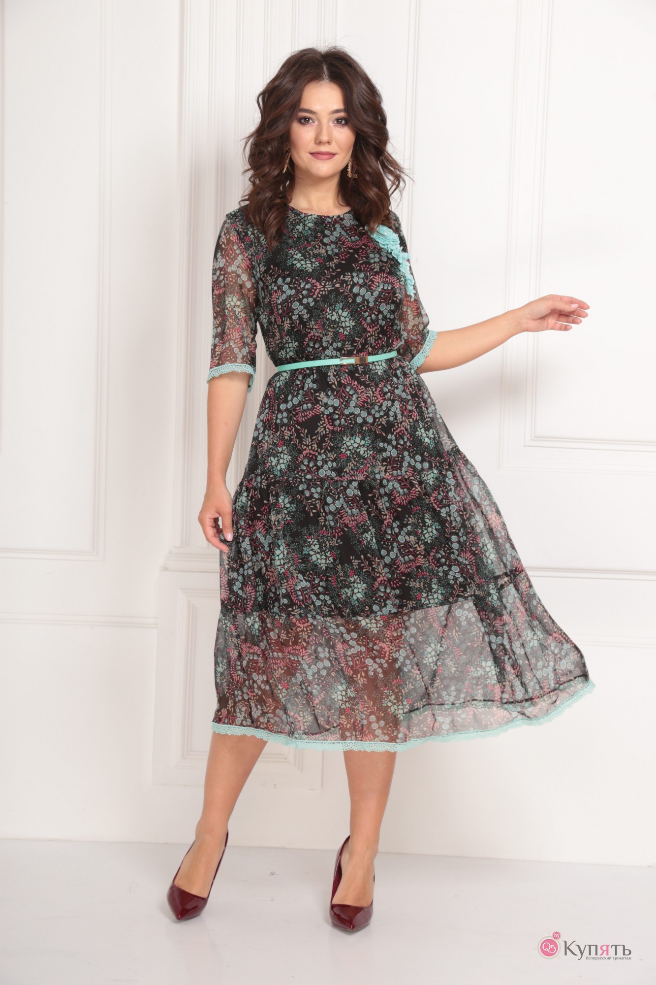 Платье женское, нарядное, свободного силуэта из текстильной ткани-шифона. Платье на подкладке. С тремя отрезными воланами со сборкой.В качестве отделочного элемента низ рукавов и низ изделии украшены кружевом. Горловина округлая,по переду нагрудные выточки. Рукава втачные,3/4. Спинка со средним швом, в который обработана застежка на потайную тесьму-молнию. В комплект входит пояс и съемный цветок.