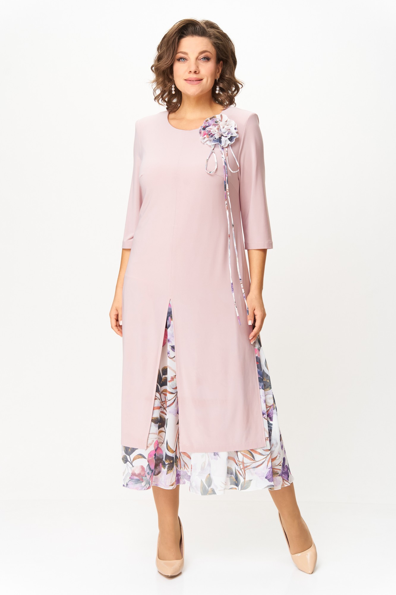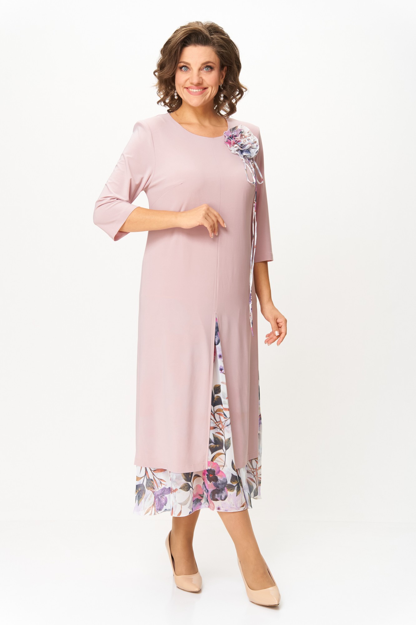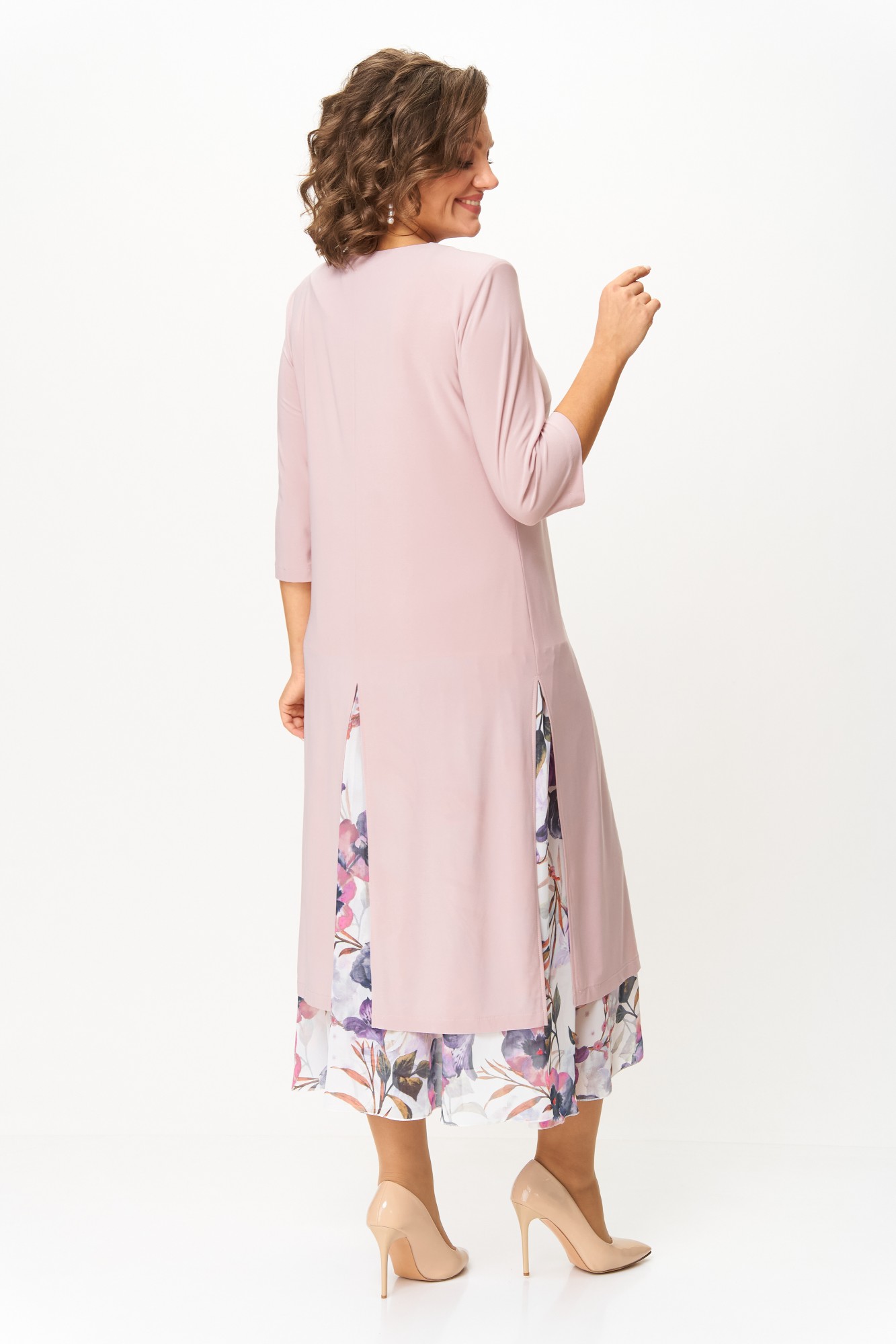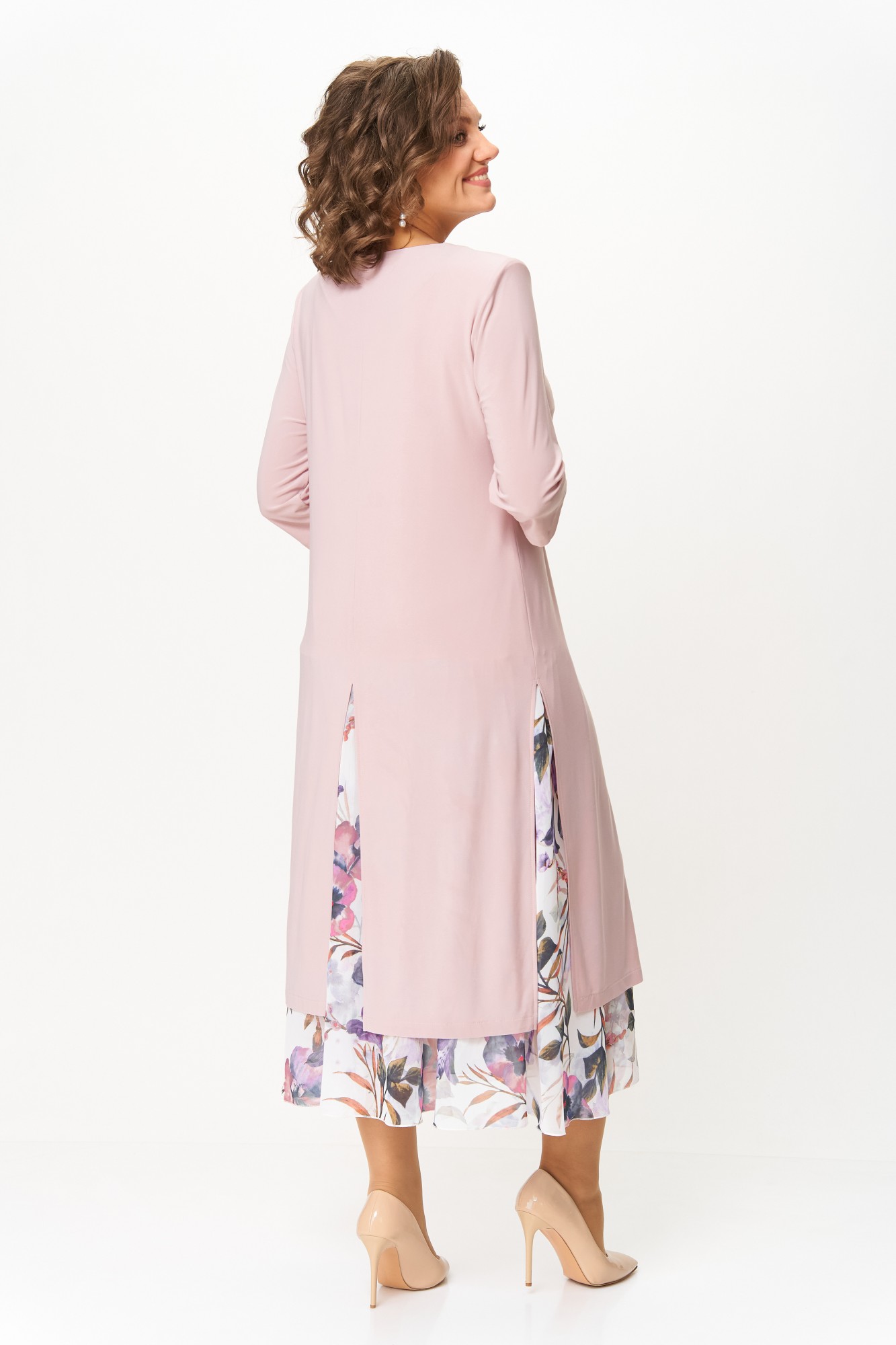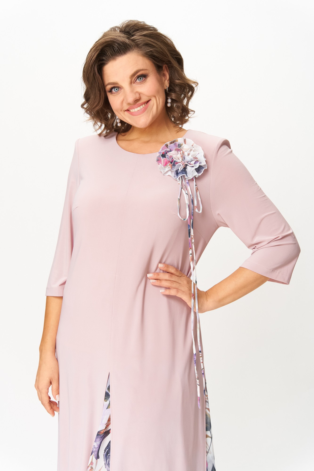Платье женское полуприлегающего силуэта расширенное к низу, выполнено в комплектации из двух предметов. Верхнее платье –из мягкого эластичного материала, с высокими разрезами по переду, спинке и бокам, с втачным рукавом ¾. По линии груди вытачки. По левой части переда съемный цветок. Нижнее платье силуэт полуприлегающий, по низу присборенный. Верхнее платье отлично будет смотреться и отдельно в сочетании с брюками.
