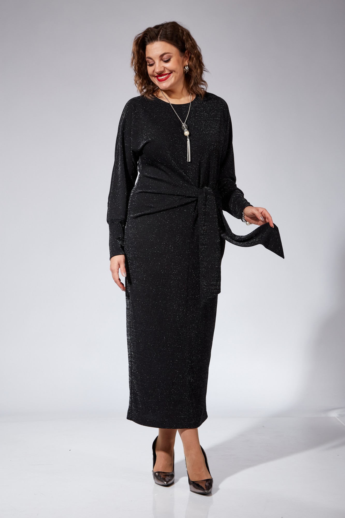 Платье женское полуприлегающего силуэта, с цельнокроеным рукавом типа летучая мышь. Горловина округлой формы. Перед со средним швом и цельнокроеной складкой переходящей в пояс. В левый боковой шов вставлен пояс. Застежка в среднем шве спинки на потайную тесьму-молнию. В среднем шве спинки выполнен разрез. В комплект платья входит декоративная подвеска.