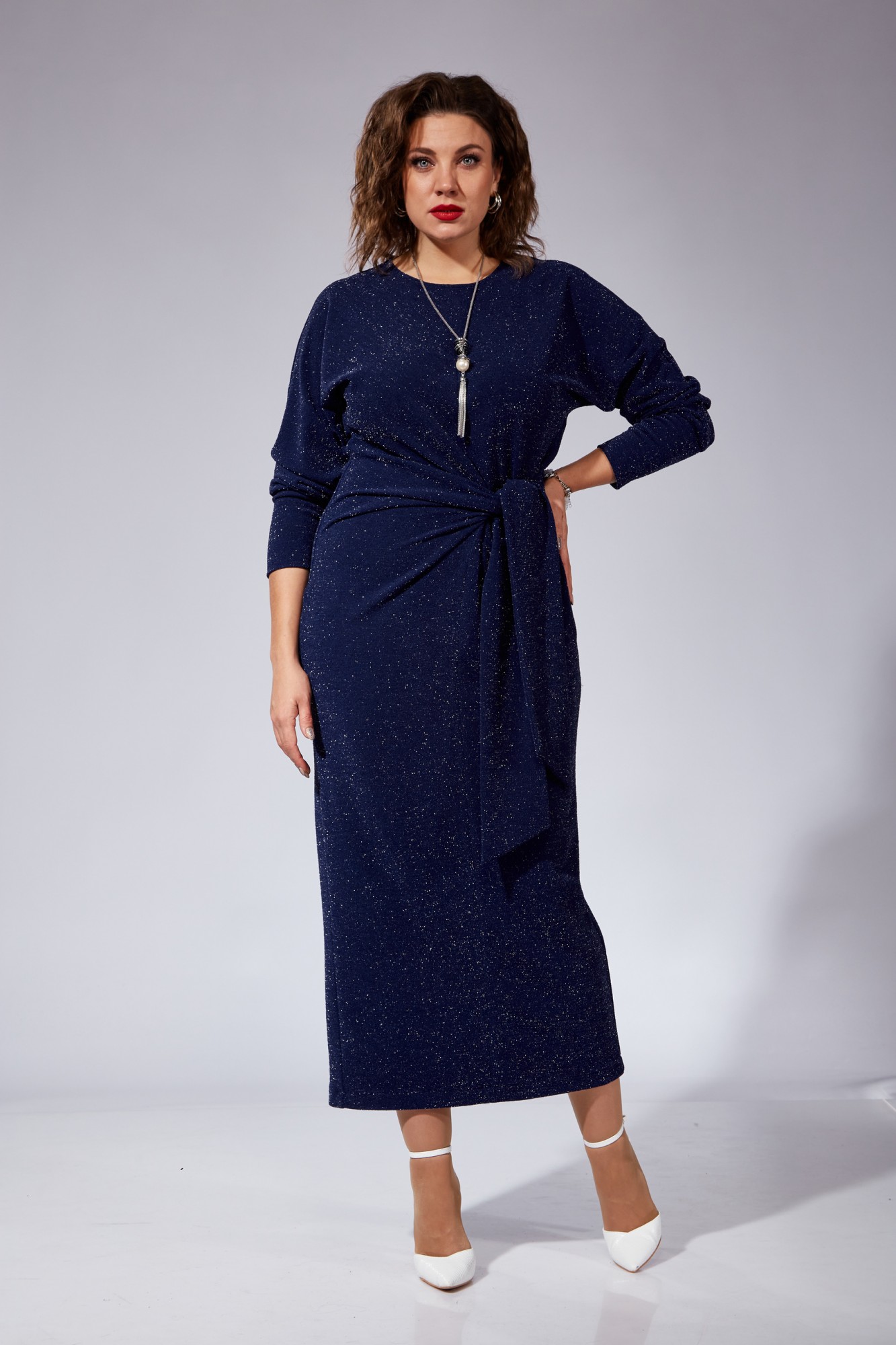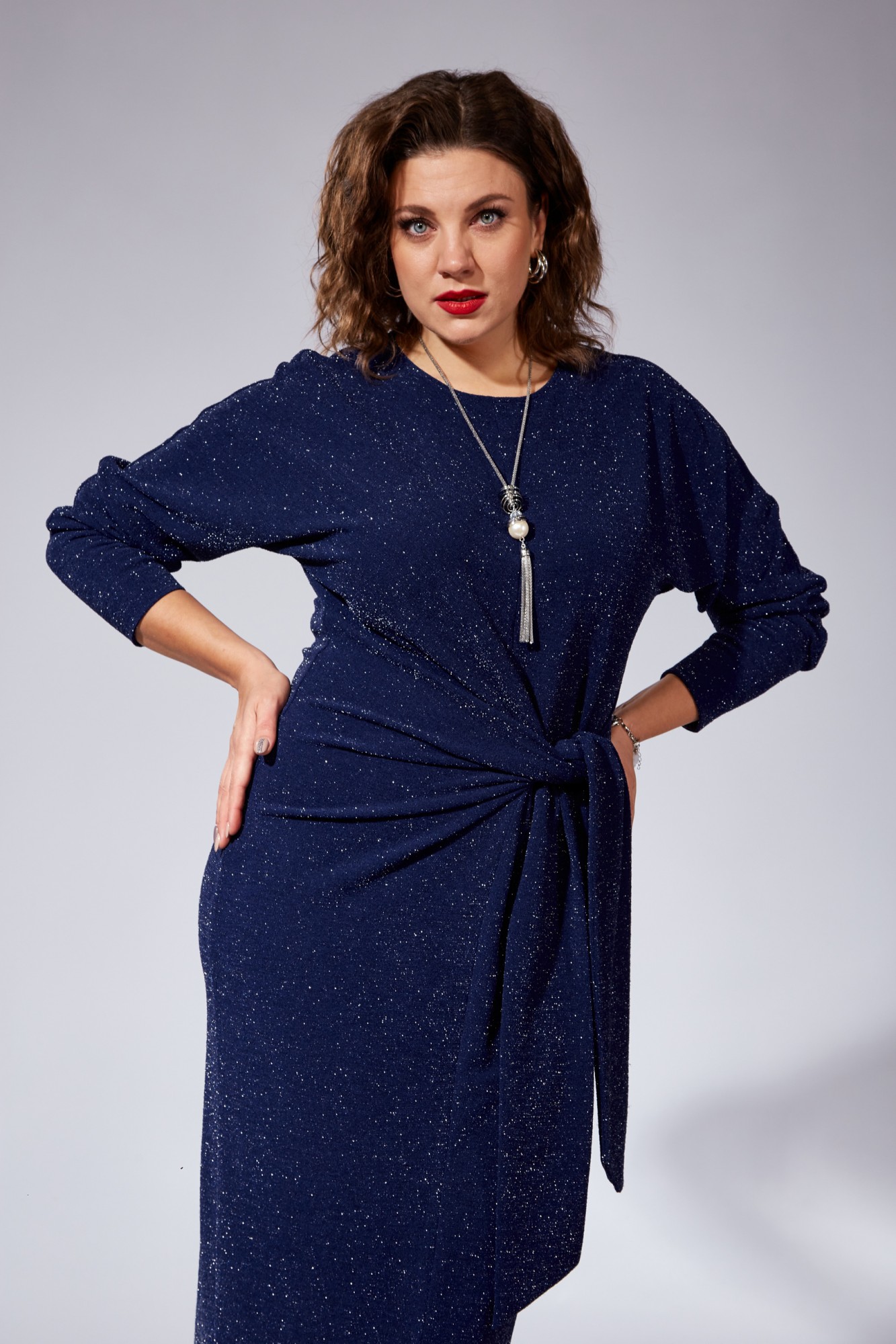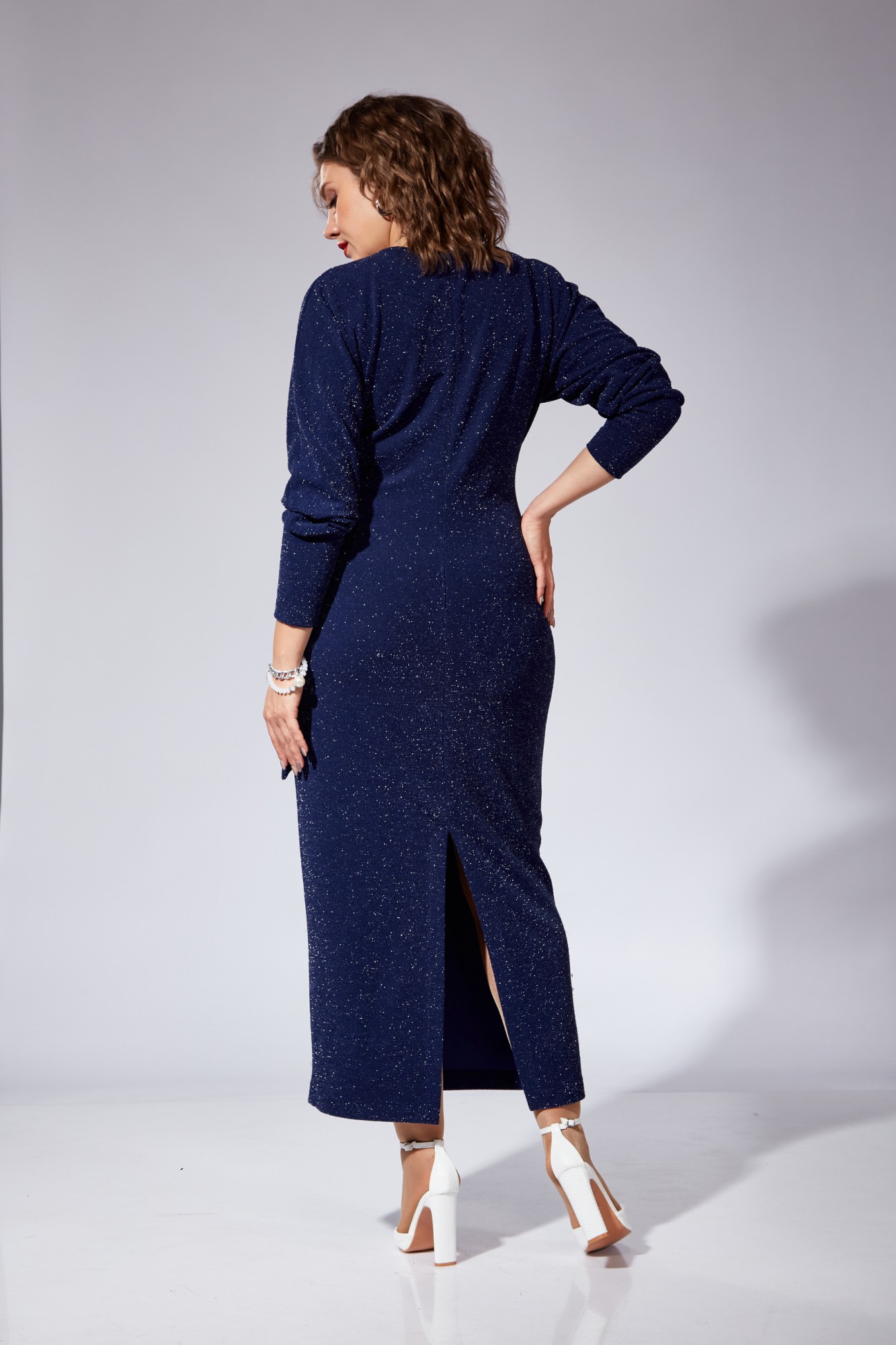 Платье женское полуприлегающего силуэта, с цельнокроеным рукавом типа летучая мышь. Горловина округлой формы. Перед со средним швом и цельнокроеной складкой переходящей в пояс. В левый боковой шов вставлен пояс. Застежка в среднем шве спинки на потайную тесьму-молнию. В среднем шве спинки выполнен разрез. В комплект платья входит декоративная подвеска.