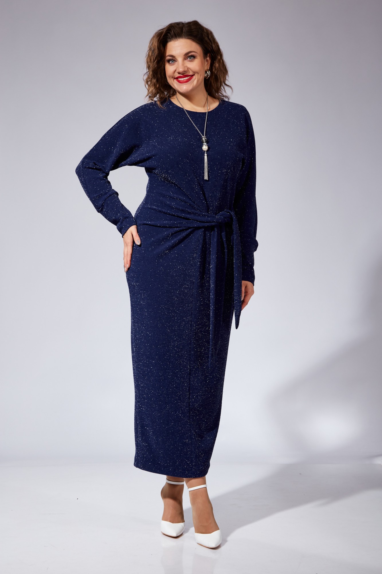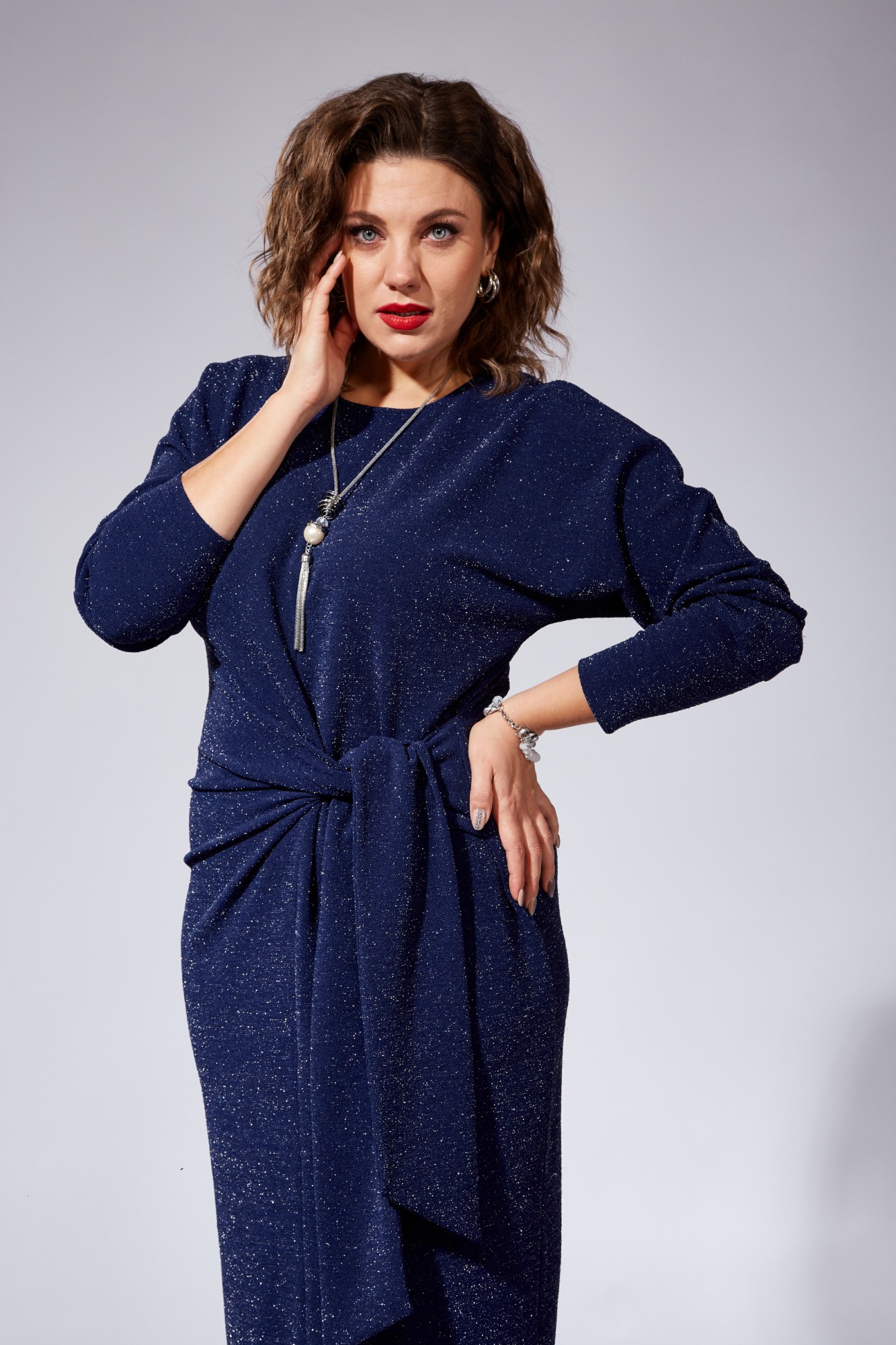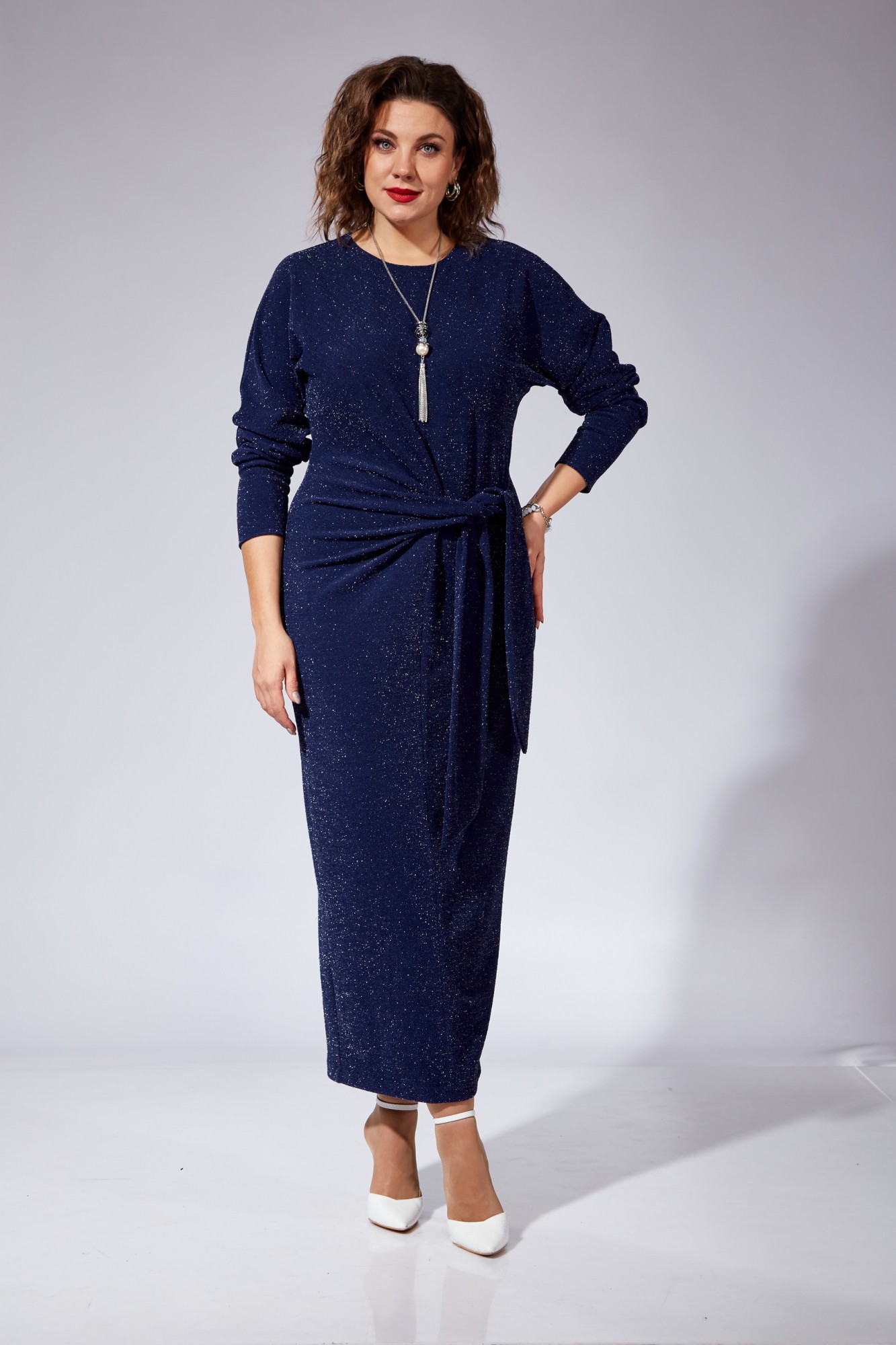 Платье женское полуприлегающего силуэта, с цельнокроеным рукавом типа летучая мышь. Горловина округлой формы. Перед со средним швом и цельнокроеной складкой переходящей в пояс. В левый боковой шов вставлен пояс. Застежка в среднем шве спинки на потайную тесьму-молнию. В среднем шве спинки выполнен разрез. В комплект платья входит декоративная подвеска.