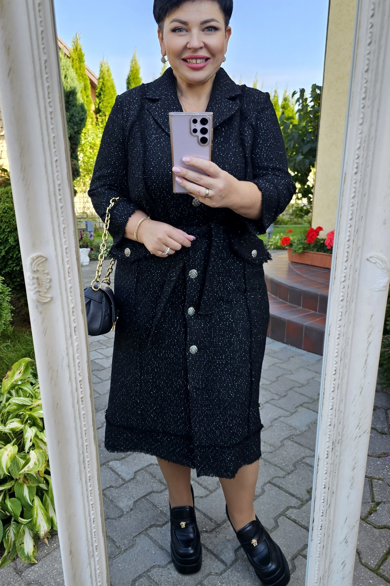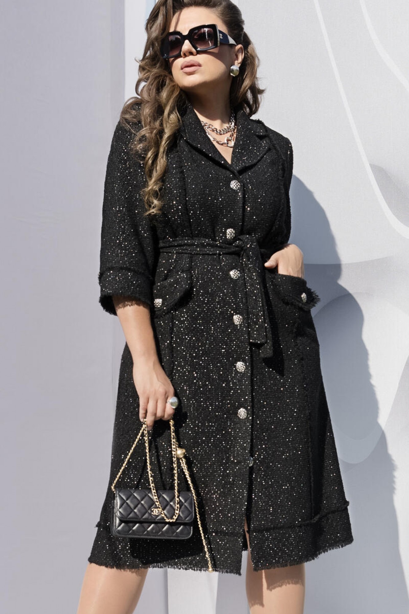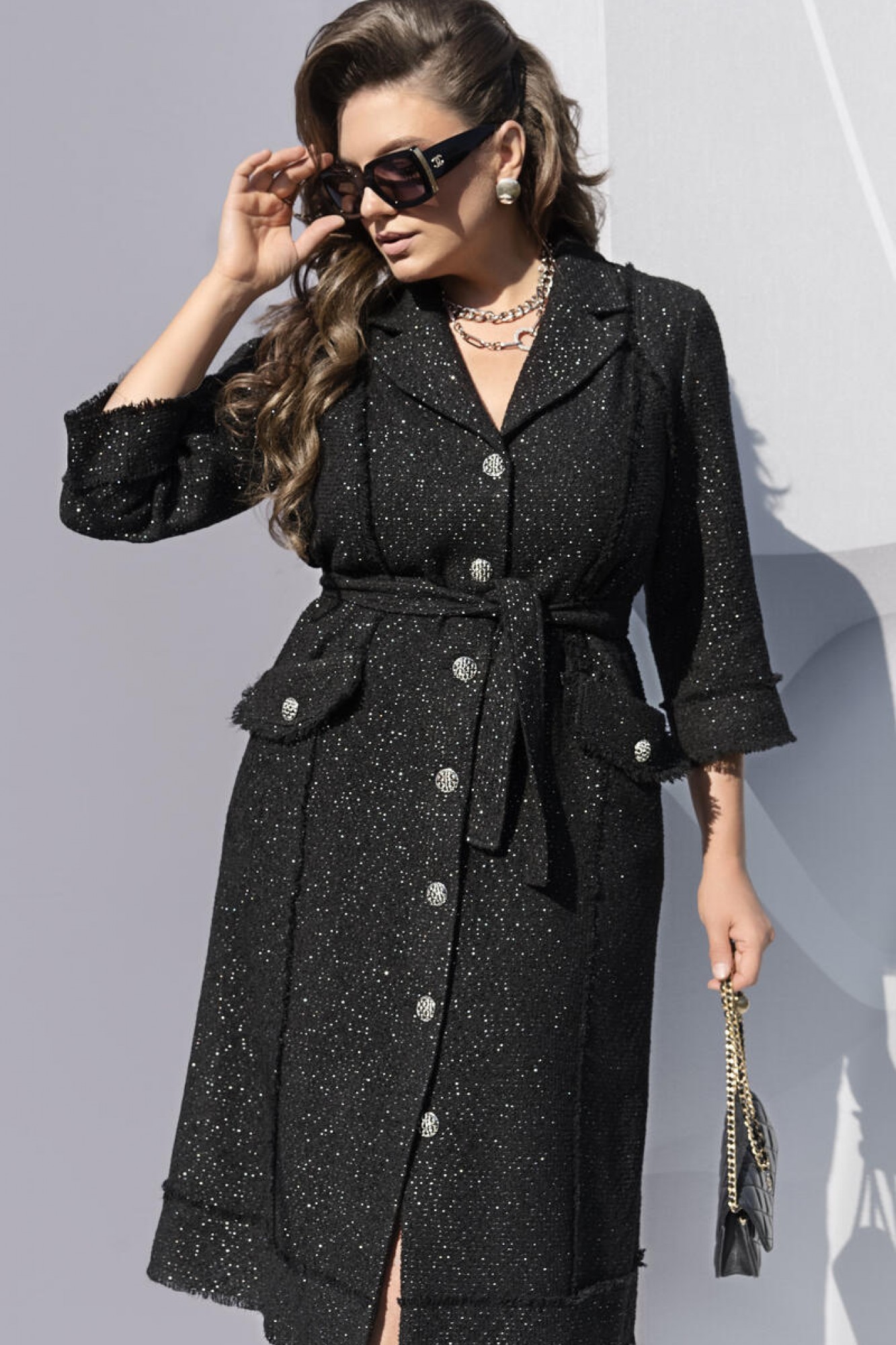 Безумно красивое и стильное платье чёрного цвета с серебристой люрексовой ниткой и отделкой, подчеркивающей плавные линии данной модели и образуя неповторимый образ. Элегантное платье, которое придаёт роскошный вид каждой женщине. Платье трапециевидного силуэта с воротником пиджачного типа с лацканами, застёжкой на петли пуговицы по борту. Перед платья с фигурными рельефами и отделкой из бахромы в подрезах, прорезными карманами с клапанами. По спинке платья декоративные рельефы и кокетка с отделкой из бахромы в подрезах. По низу платья притачная планка с отделкой бахромой. Рукав втачной, одношовный с вытачкой по низу и притачной манжетой с отделкой бахромой. Платье на подкладке.