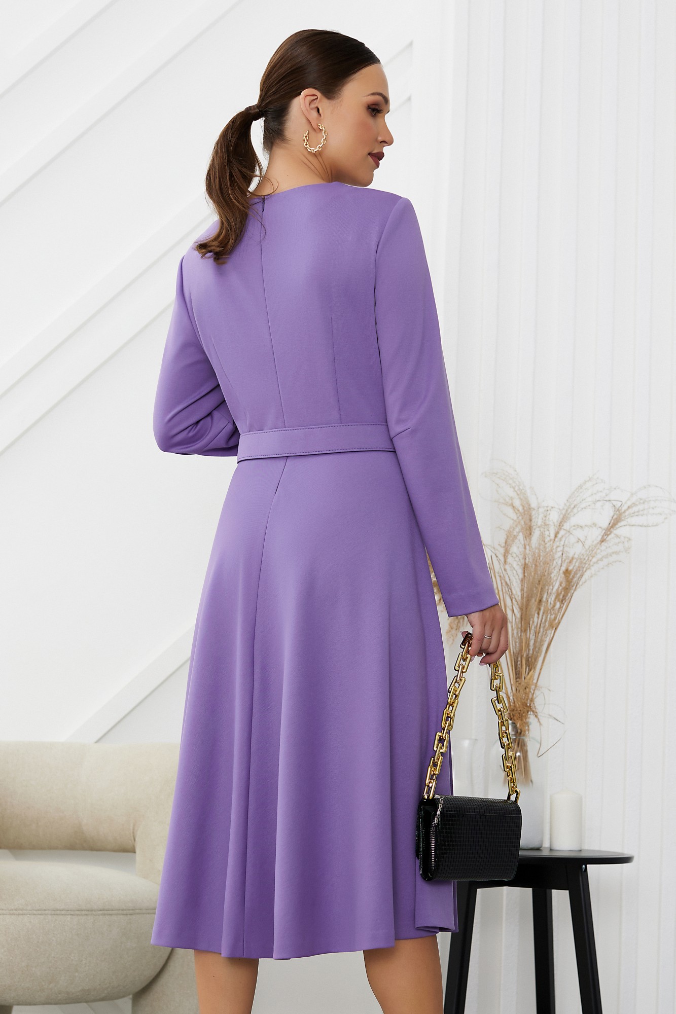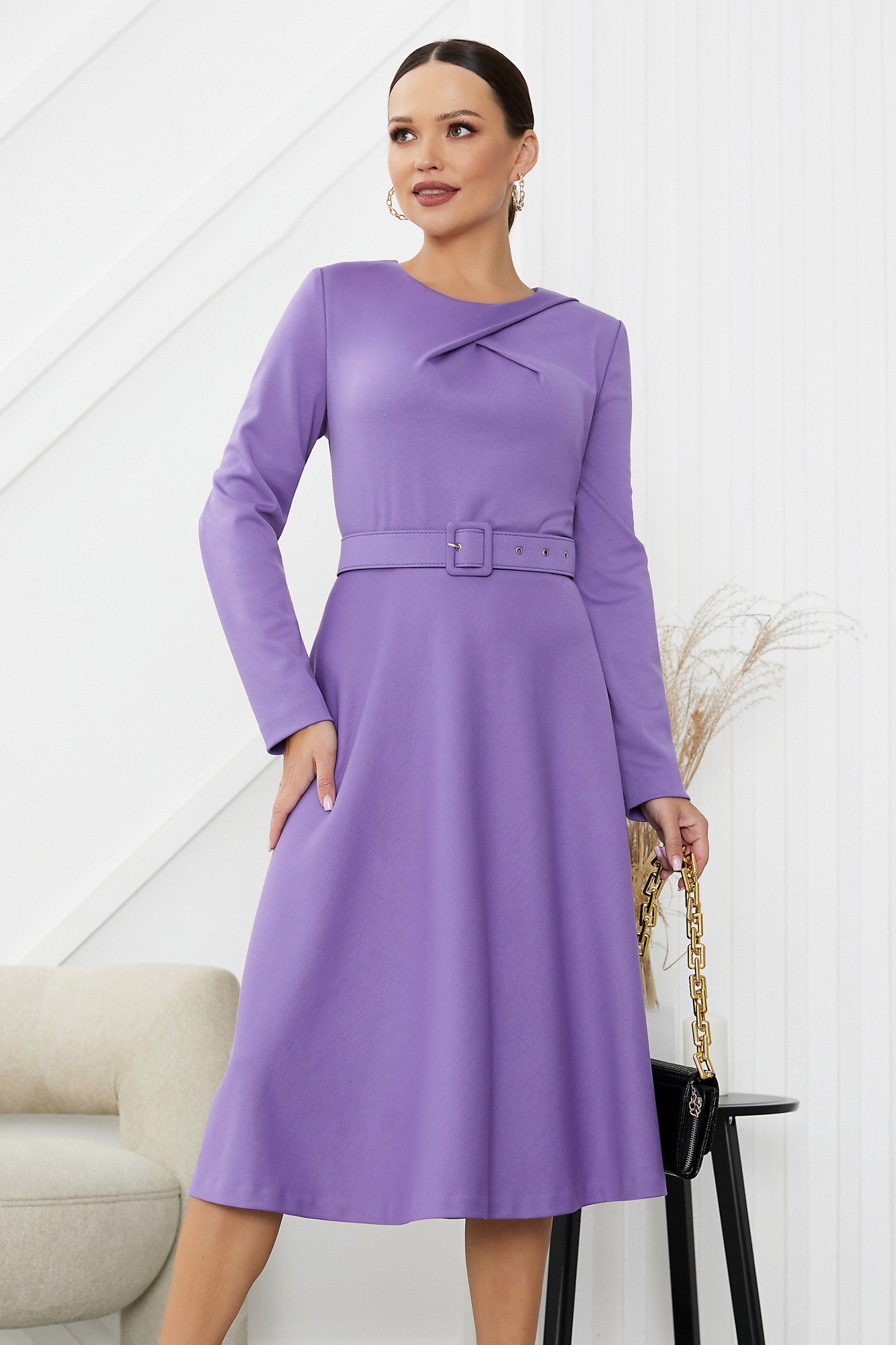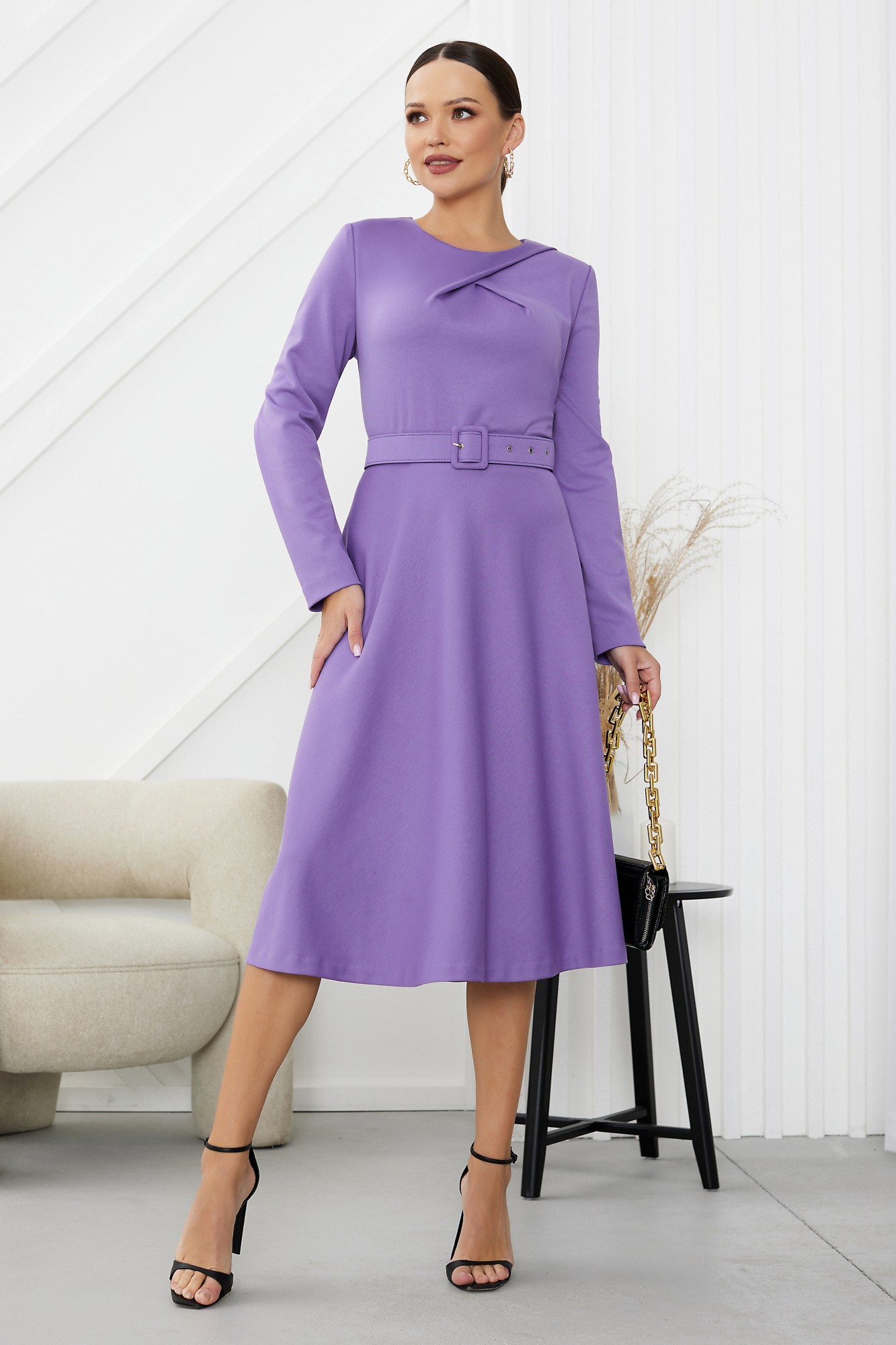Трендовое платье из мягкого трикотажа с округлым вырезом и у-образными складками по лифу отлично впишется в ваш гардероб и подойдет на все случаи жизни. Минималистичное платье полуприлегающего силуэта, отрезное по линии талии дополнено съемным поясом фабричного производства. Пояс выполнен на заказ специально под данную модель: внешняя сторона тканевая, изнанка выполнена из экокожи. Лиф оформлен мягкими складками, юбка расширена к низу. Молния в среднем шве спинки. Рукав втачной.