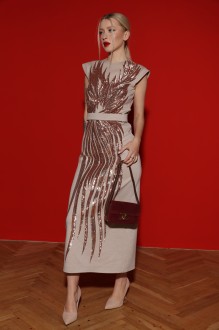 Платье приталенного силуэта выполнено из плотного трикотажного полотна. Перед платья декорирован вышивкой из пайеток. По спинке расположены талиевые вытачки. По среднему шву спинки разрез длинной 56 см и застежка на потайную молнию. Горловина и пройма обтачные, рукав выполнен в виде "небольшого крылышка". В комплекте к платью идет пояс из основной ткани.