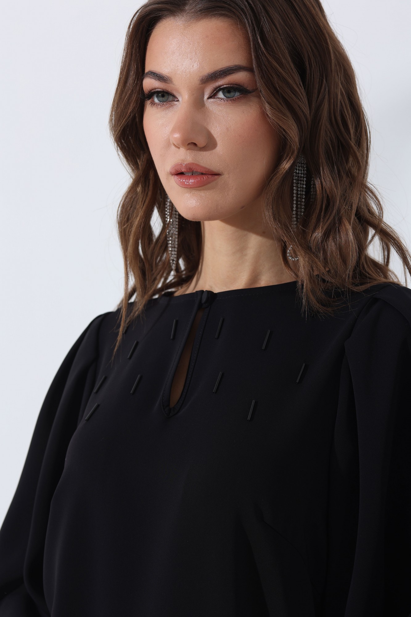 Элегантное платье из плательной струящейся ткани полуприлегающего силуэта. Горловина круглой формы с разрезом и застежкой на навесную петлю и пуговицу по переду. В качестве декора на платье располагается вышивка стеклярусом. В левом боковом шве располагается разрез. Перед с нагрудными вытачками. Спинка с вытачками по талии. Рукав втачной, длинный, со складками по окату и декоративными фигурными складками по низу. Нижняя часть рукава оформлена манжетой на петлю и пуговицу.