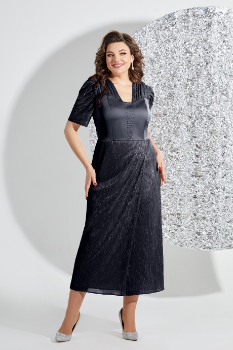 Нарядное платье прилегающего силуэта, выполнено из атласа и плиссированной ткани, на трикотажной подкладке. Лиф платья отрезной по линии талии, выполнен из атласа, с эффектом корсета, кокетки платья выполнены из плиссированной ткани, присборены. Атласная часть лифа с рельефами, по середине вставка, декорированная стразами. Юбка платья прямого покроя, по переду на запах, от линии талии на юбке заложены складки, при движении появляется небольшой разрез по низу. Спинка платья отрезная по линии талии, выполнена из плиссированной ткани, на трикотажной подкладке, со средним швом и выточками, в боковом шве потайная молния. Рукав втачной, укороченный, выполнен из плиссированной ткани, со сборкой по окату. Изящное платье в сочетании нежных фактур создает образ элегантной и романтичной женщины.