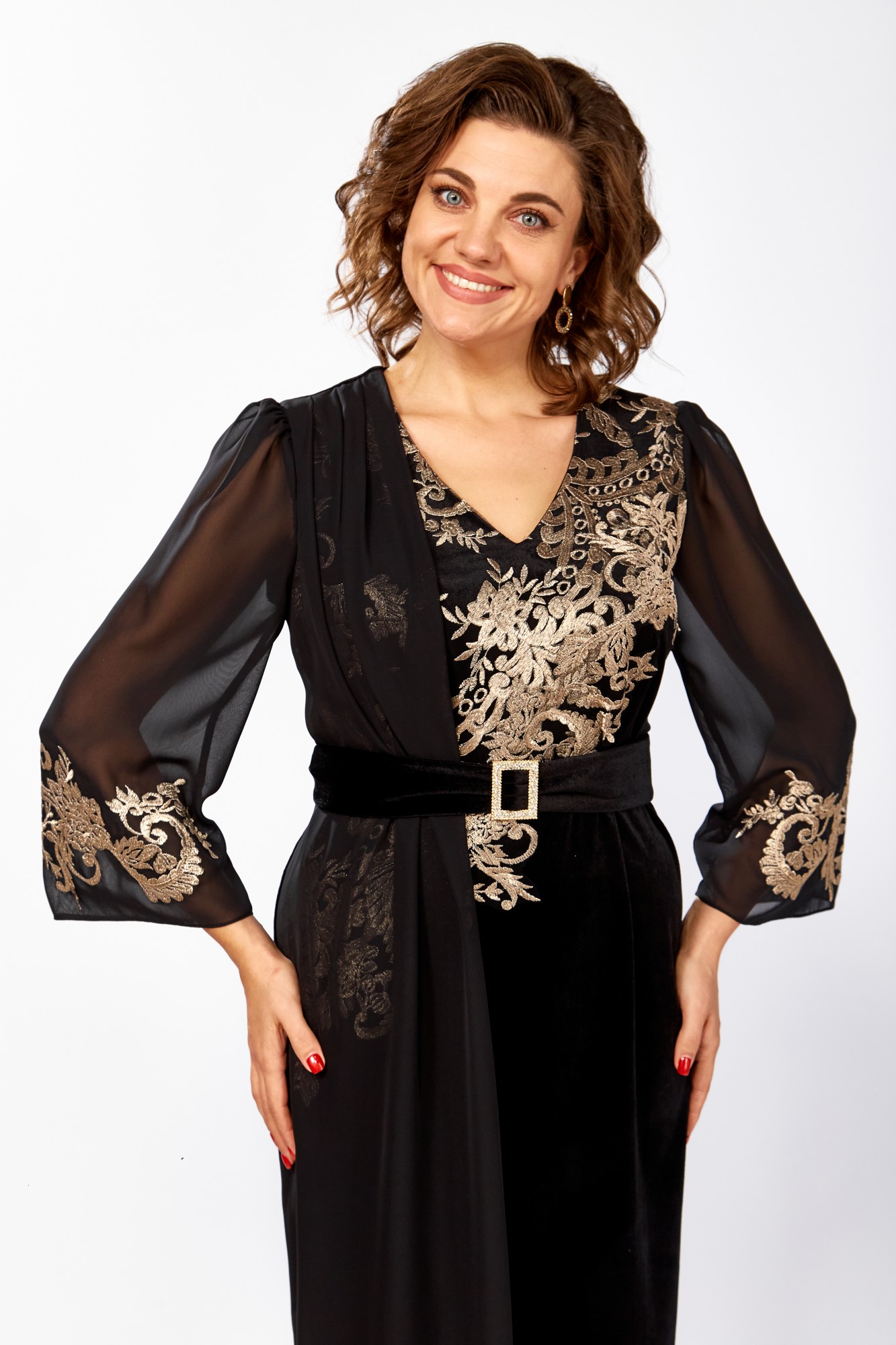 Женское платье, полу-прилегающего силуэта, выполнено из велюра и шифона, в качестве отделки кружево. Горловина платья V-образной формы на обтачке, на полочке выполнен ассиметричный подрез, декорированный кружевом, шов притачивания декорирован аппликацией из кружева. Также на полочке, в качестве отделки, в плечевой, пройму и боковой втачен шифон, который прекрасно драпируется по линии талии, фиксируется поясом из велюра, это прекрасно подчеркивает силуэт и скрывает нюансы фигуры. Рукав втачной, выполнен из шифона, расклешенный к низу и декорирован аппликацией из кружева. Спинка выполнена из велюра, со средним швом и вытачками. Эффектное платье, выполненное из стрейчевого велюра, отлично садится по фигуре, а шикарное кружево придает платью нарядности!