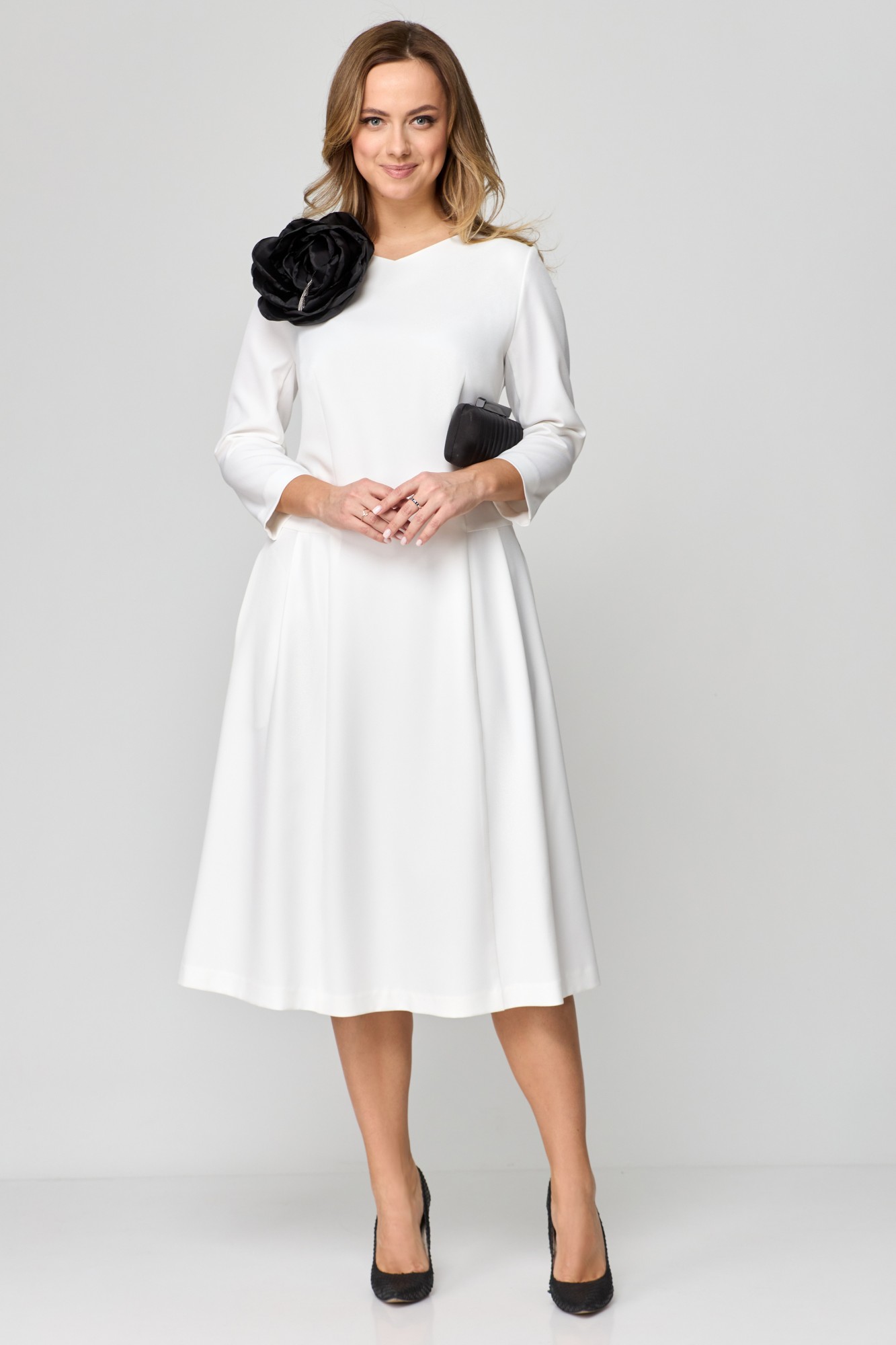 Платье А- образного силуэта на подкладке. По переду V-образный вырез горловины и декоративные подрезы. Ткань тянется, что обеспечивает хорошую посадку на любую фигуру. Спинка с талевыми вытачками и средним швом. В среднем шве застежка потайная молния. Рукав втачной двушовный длиной 3/4.