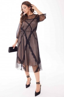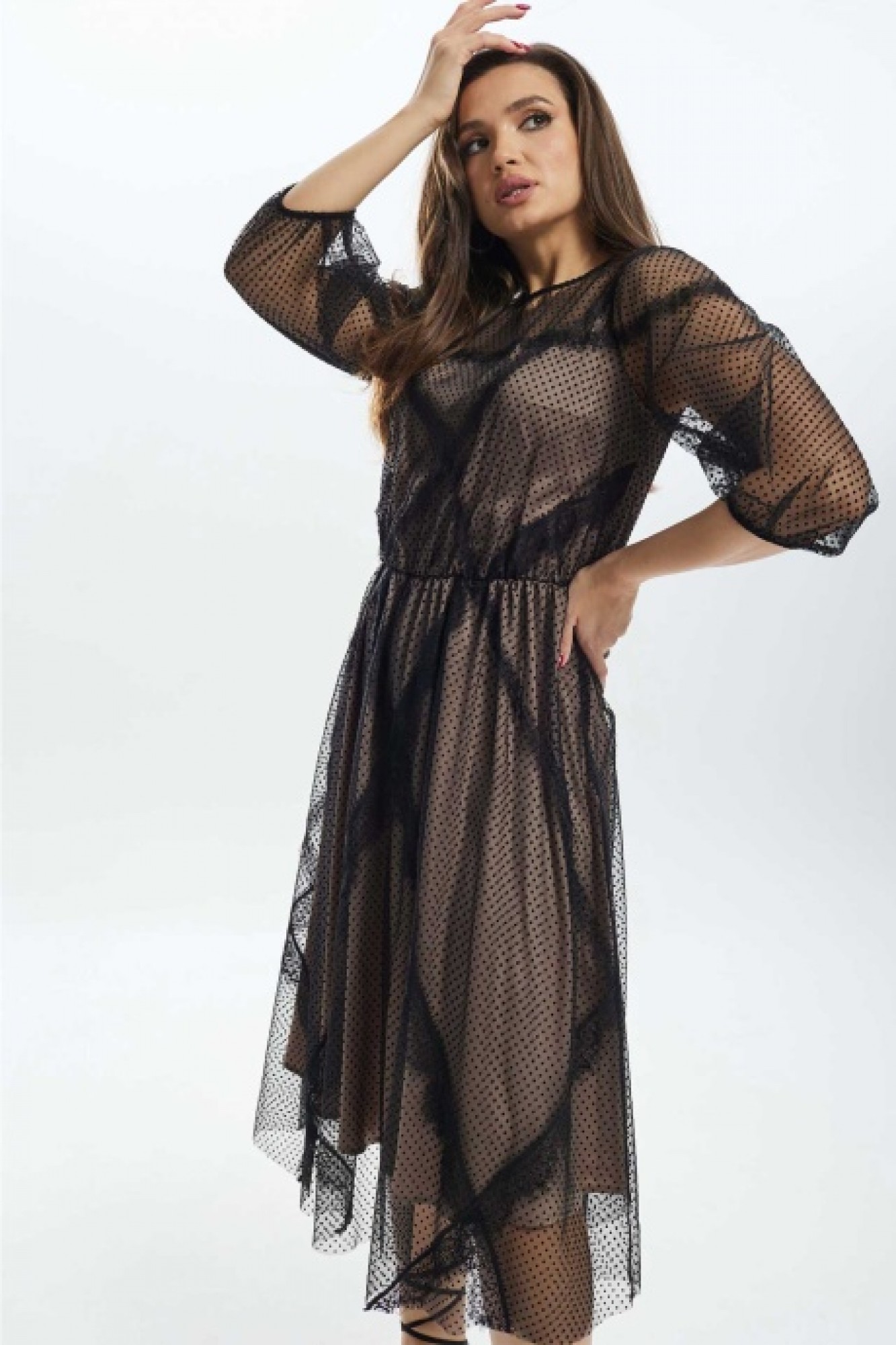 Платье женское отрезное по линии талии расклешённое к низу выполнено из двух видов ткани. Верхний слой платья выполнен из ткани тонкая сетка в мелкий горошек. Горловина круглая. По переду кокетка и талевые вытачки. По спинке лифа кокетка , центральный шов и застёжка на воздушную петлю и пуговицу. Рукава втачные одно шовные со сборкой по низу на тонкую резинку. Украшает изделие кружево.
