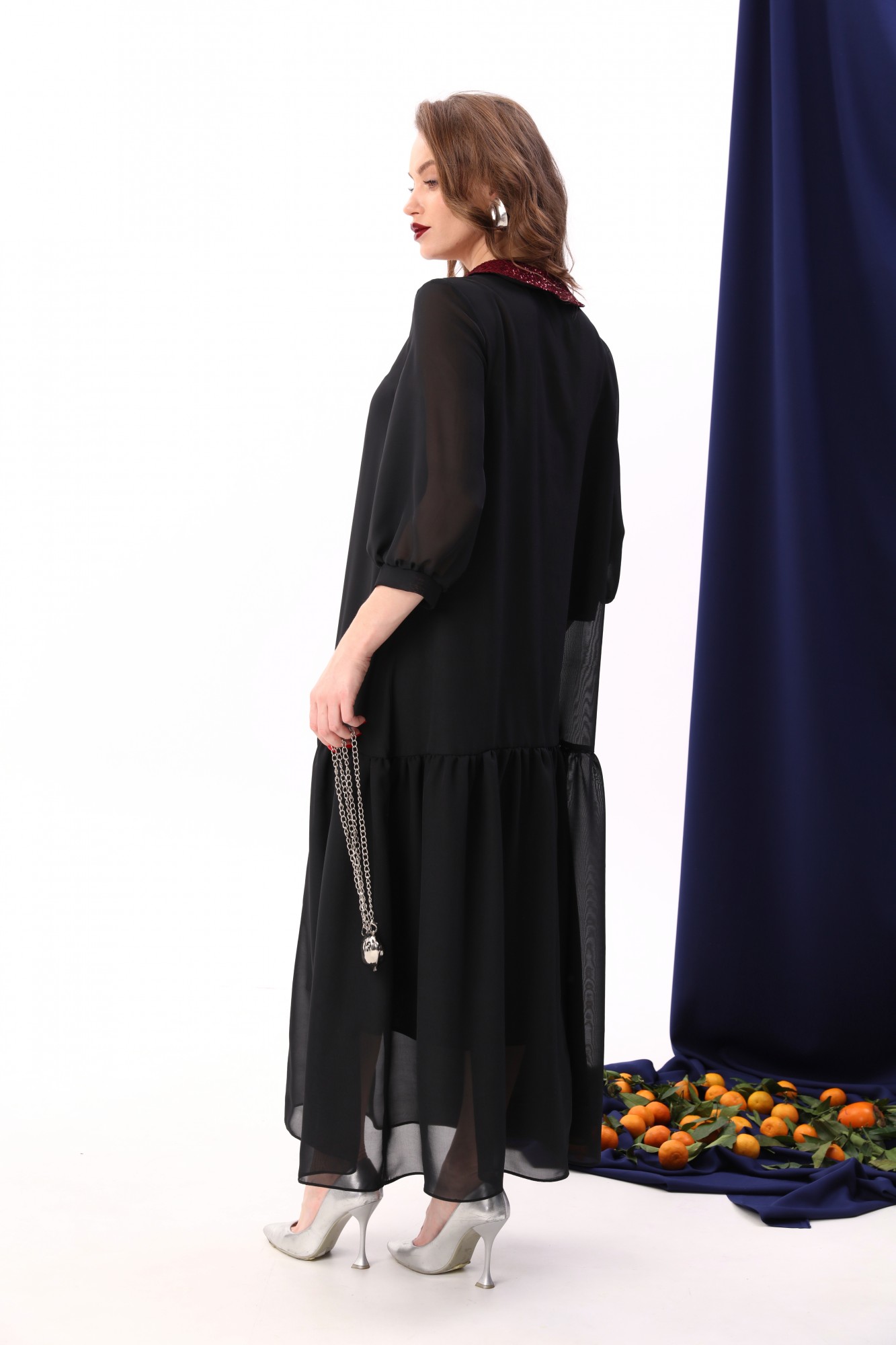 Платье состоит из двух платьев: нижнего и верхнего. Верхнее платье макси прямого свободного силуэта с воланом по низу изделия. Рукав втачной с притачным манжетом. Горловина обработана плосколежащим воротником из отделочной ткани фигурной формы. Центральная застёжка на петли и пуговицы. Нижнее платье комбинация на регулируемых бретелях.