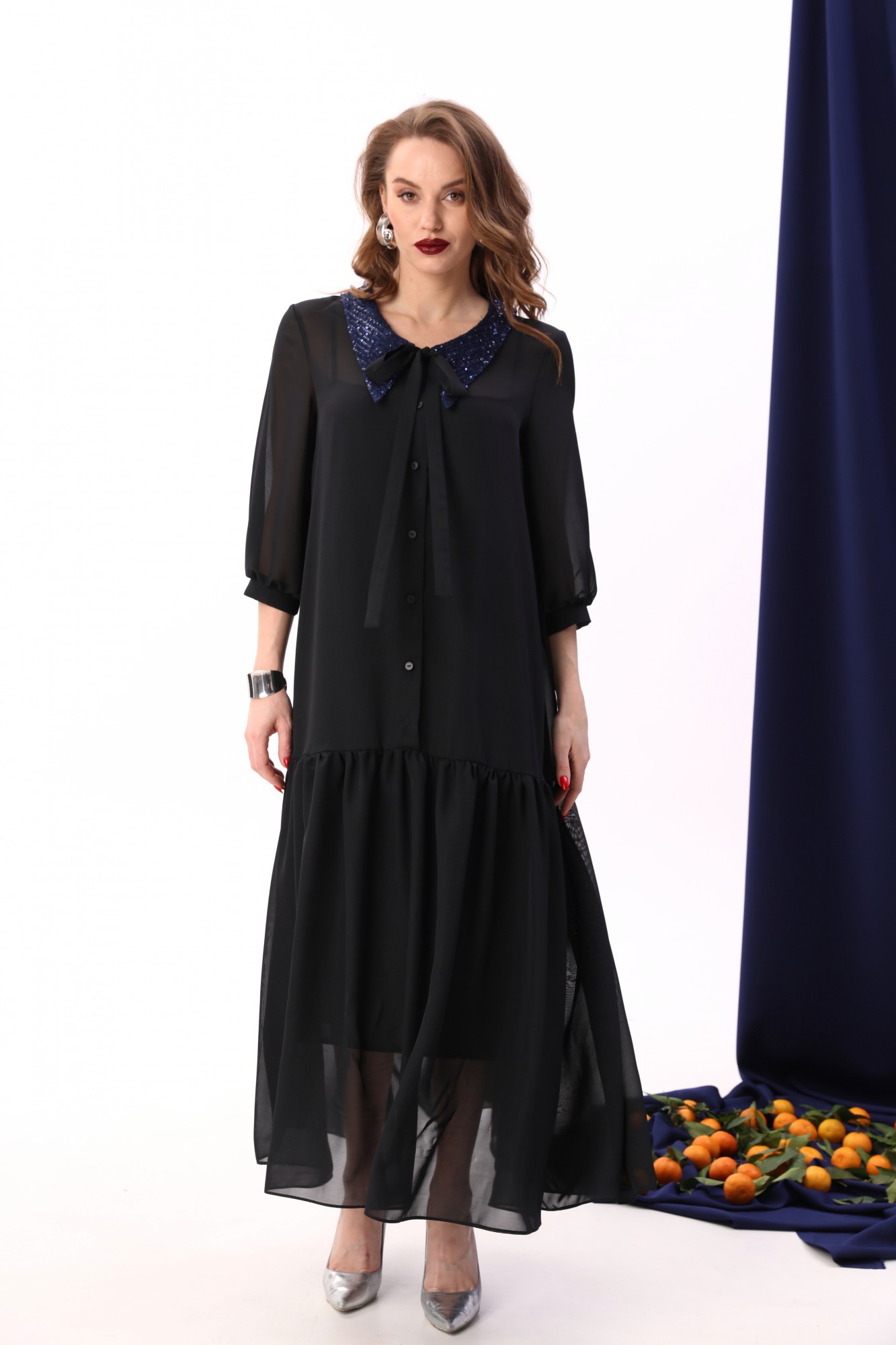 Платье состоит из двух платьев: нижнего и верхнего. Верхнее платье макси прямого свободного силуэта с воланом по низу изделия. Рукав втачной с притачным манжетом. Горловина обработана плосколежащим воротником из отделочной ткани фигурной формы. Центральная застёжка на петли и пуговицы. Нижнее платье комбинация на регулируемых бретелях.