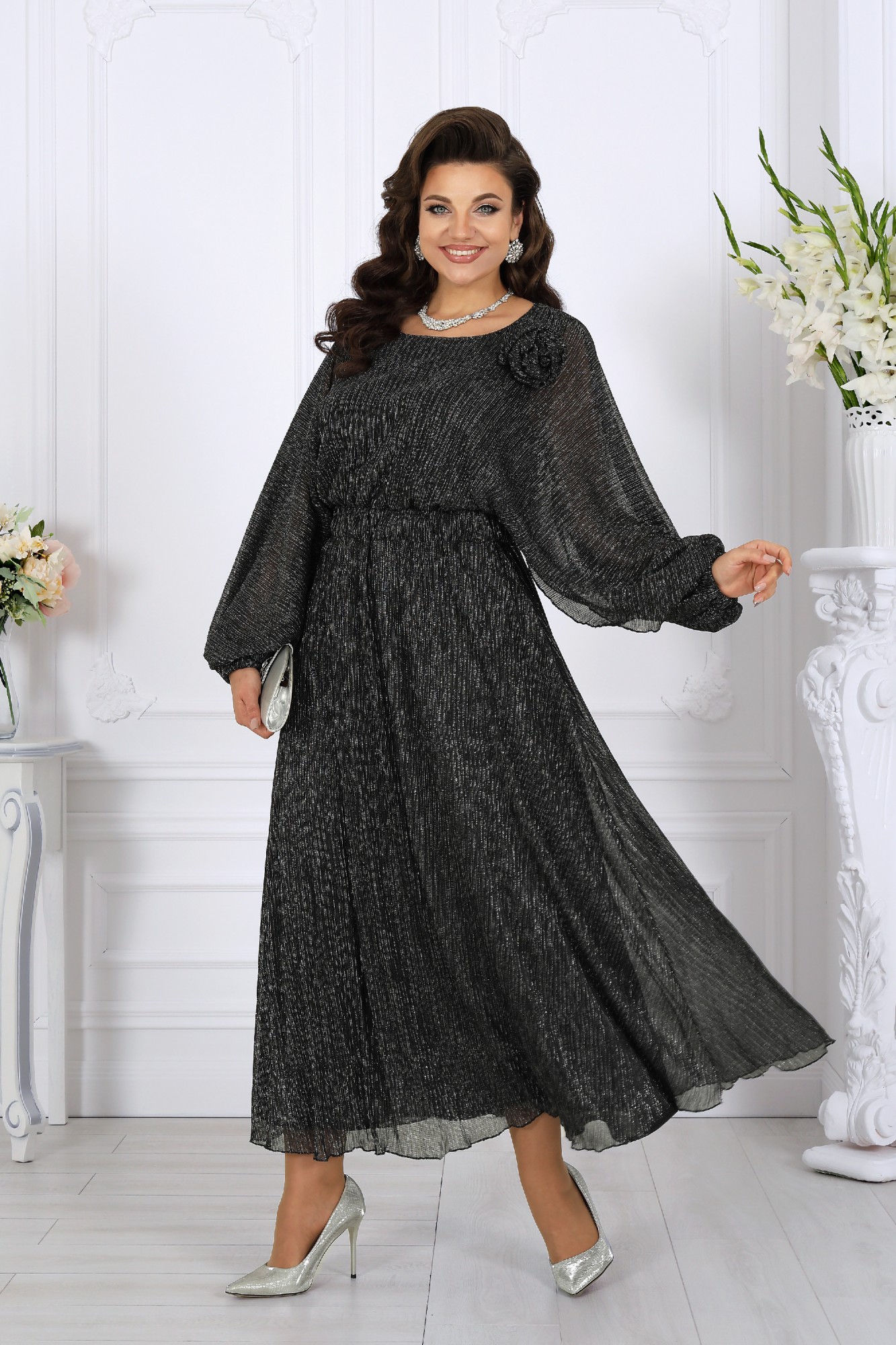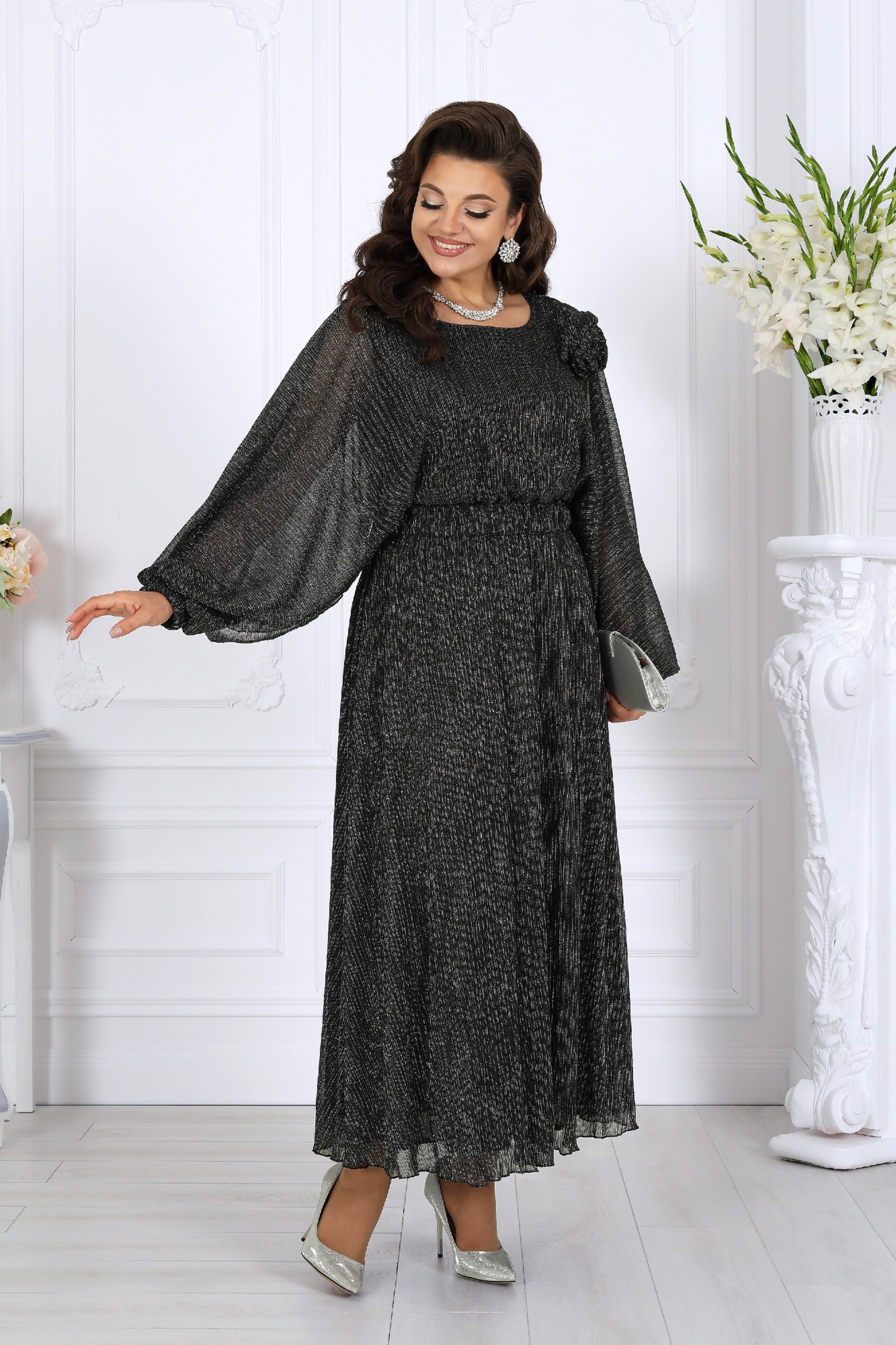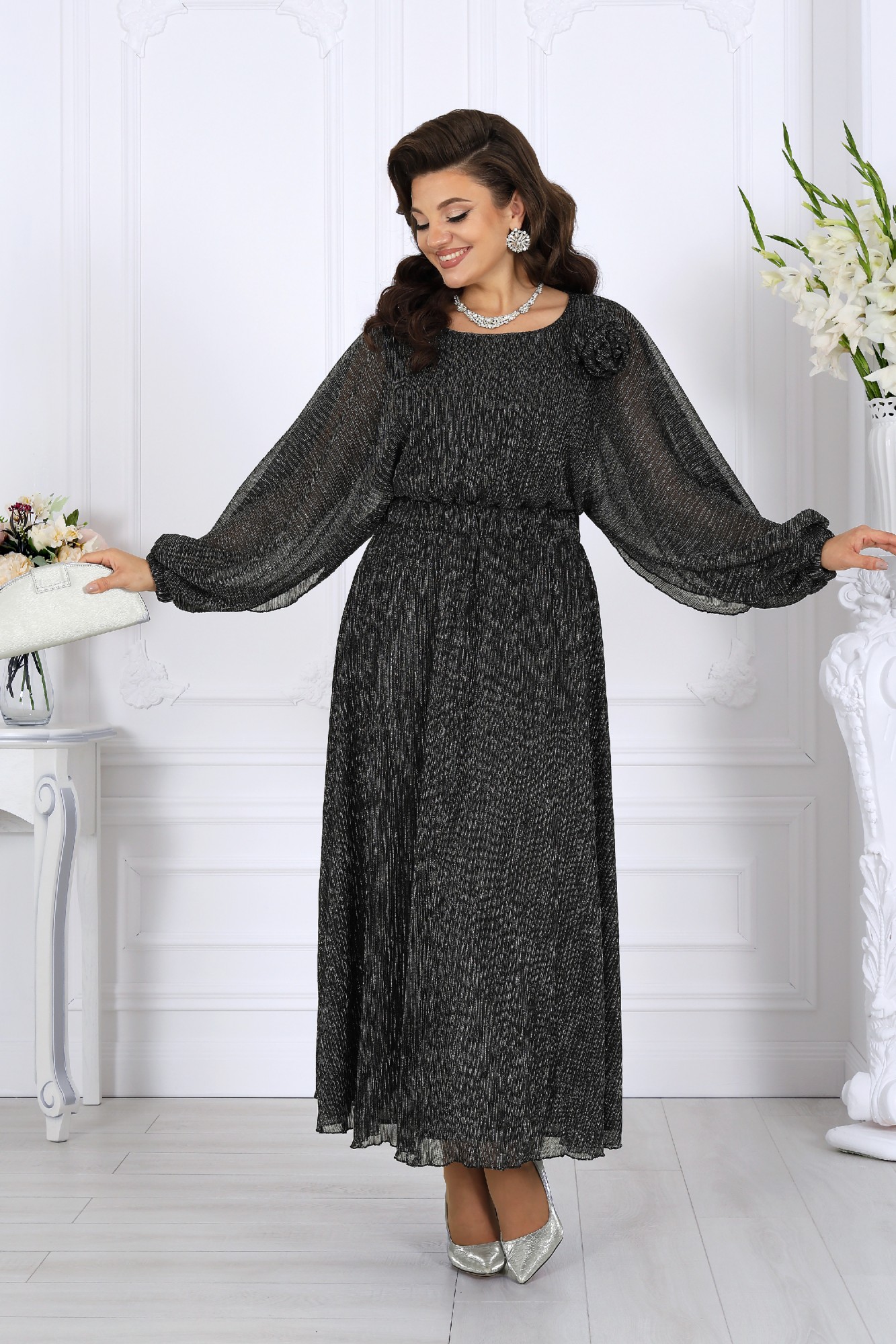 Элегантное вечернее платье в пол, созданное из воздушной сетки-гофре с нитью люрекс, — истинное воплощение праздничного блеска и женственности. Легкое мерцание ткани при каждом движении создает ощущение роскоши, а струящаяся юбка в пол формирует безупречный силуэт. Лиф со свободной посадкой деликатно драпируется, подчеркивая утонченность образа, а эластичная вставка на талии обеспечивает комфорт и идеальную посадку для фигур разных типов, включая большие размеры. Особый акцент — летящие рукава с разрезами и мягкой сборкой на манжетах, которые добавляют легкости и выразительности. Платье дополнено изысканной съемной декоративной деталью в виде «цветка», выполненного из основного полотна, что подчеркивает дизайнерский характер модели. Универсальное по стилю, оно идеально для самых значимых событий: свадеб, юбилеев, торжественных приемов или праздничных вечеров. Платье женское, приталенного силуэта, выполнено из сетки-гофре с нитью «люрекс». Модель на трикотажной подкладке, без застежки и плечевых накладок. Платье отрезное по линии талии, со свободным лифом и расширенной к низу юбкой. Для лучшего прилегания в области талии в отрезном поясе предусмотрена эластичная лента, вставленная по всей длине. Лиф цельнокроеный с рукавами, без боковых швов -- с разрезами от талии до манжет. Для регулирования длины рукава внутрь манжеты протянута эластичная лента. Горловина округлая, окантована узкой косой бейкой из основного материала. Платье дополнено съемным «цветком» з основного полотна. Длина платья (от горловины спинки) – 139 см, длина платья (от талии спинки) – 97 см; длина рукава (от горловины до манжеты) – 70 см (50-52 р-р), 71 см (54-58 р-р).